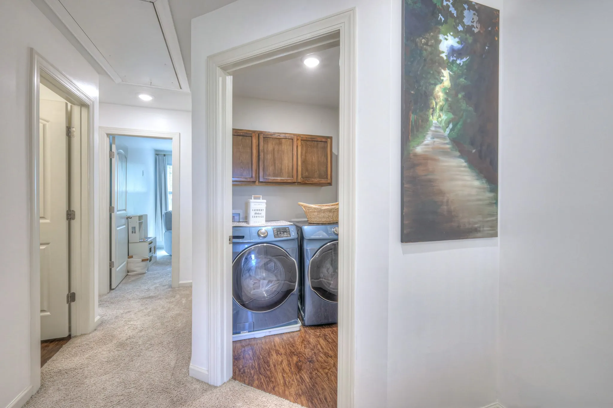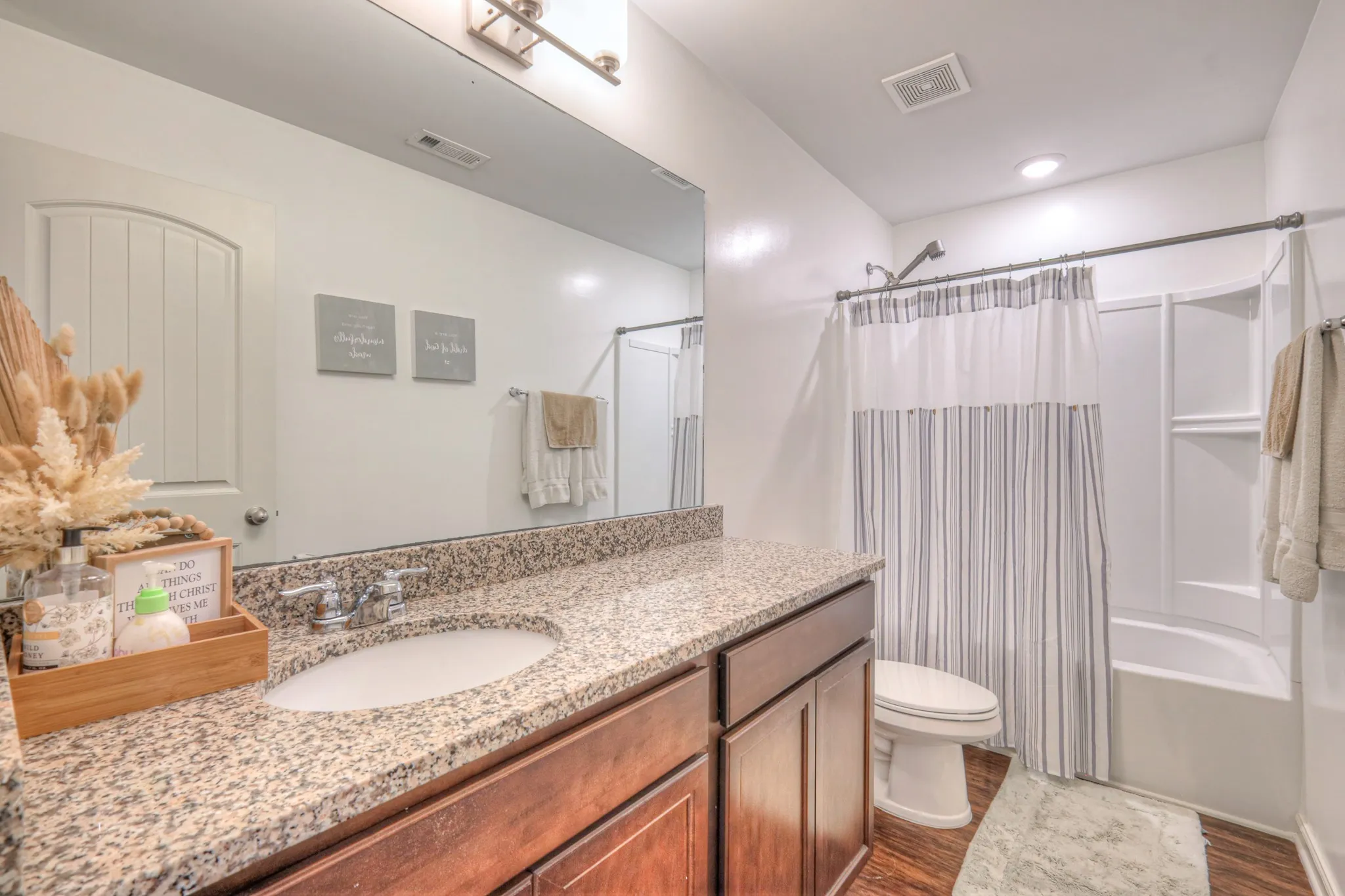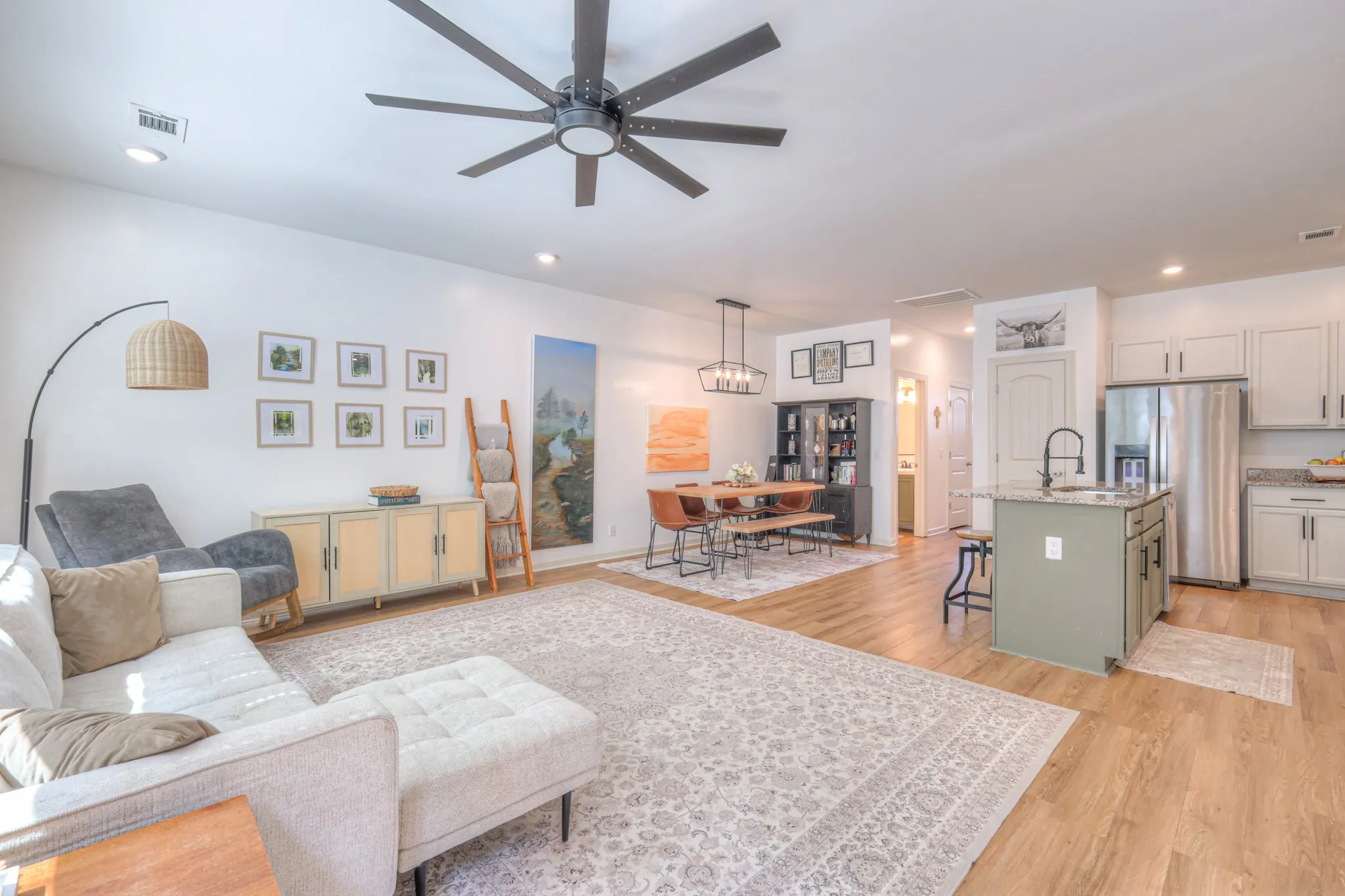 Beautifully updated and move-in ready! This energy-efficient home offers fresh paint throughout, new luxury vinyl flooring on the main level, upgraded lighting, new laundry cabinets, and professionally cleaned upstairs carpets. The open-concept living and kitchen area features granite counters and includes all appliances—fridge, washer, and dryer. Upstairs, you’ll find 3 bedrooms and 2 full baths, including a primary suite with an upgraded shower head. Enjoy a private back patio (backs up to tree line) and turf in the garage. The HOA covers exterior insurance, roof (8 years old), garbage pickup, lawn and plant care, and common areas. Heated/cooled attic adds year-round comfort. Regular maintenance performed with Lee Company. Prime location with easy access to shopping, dining, and more!