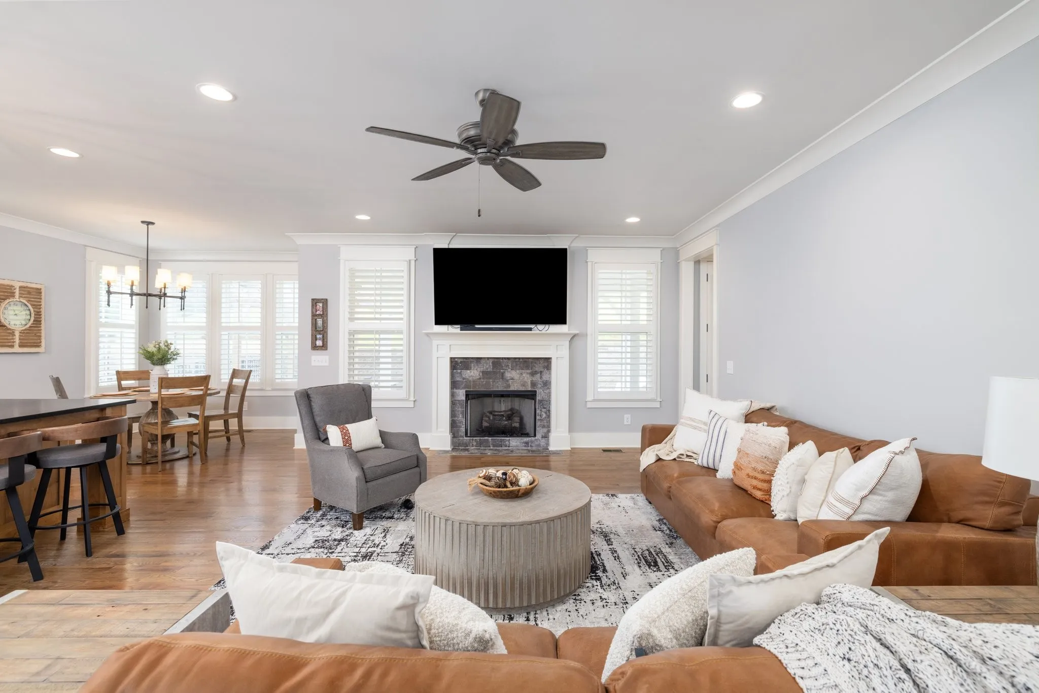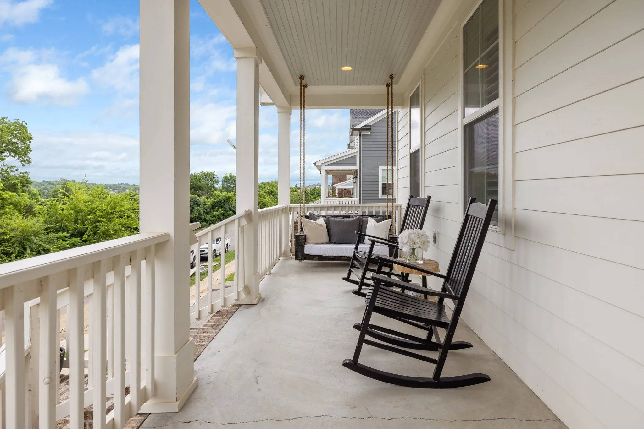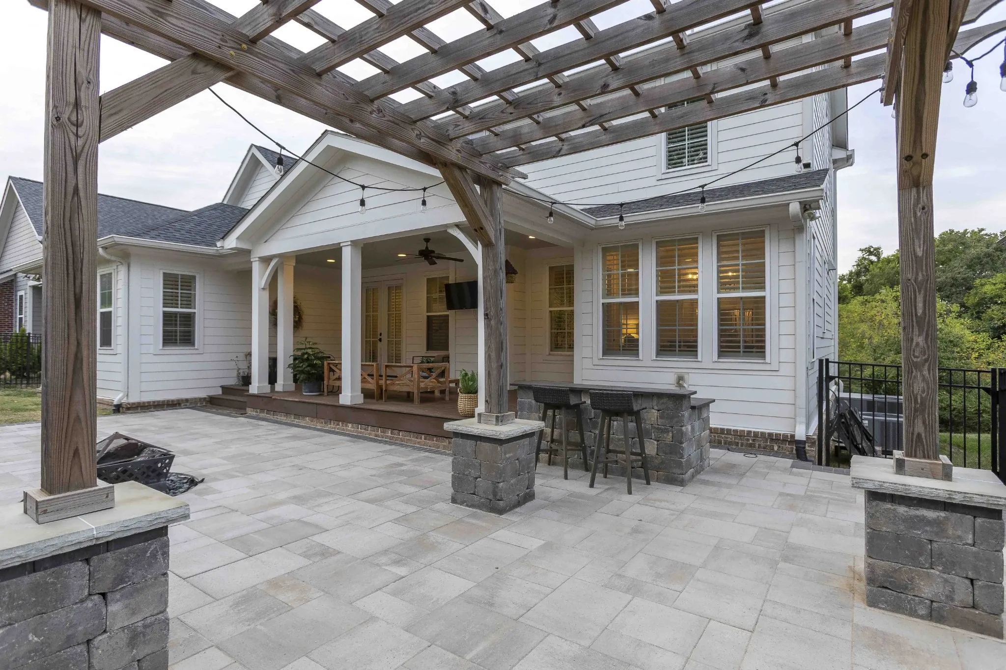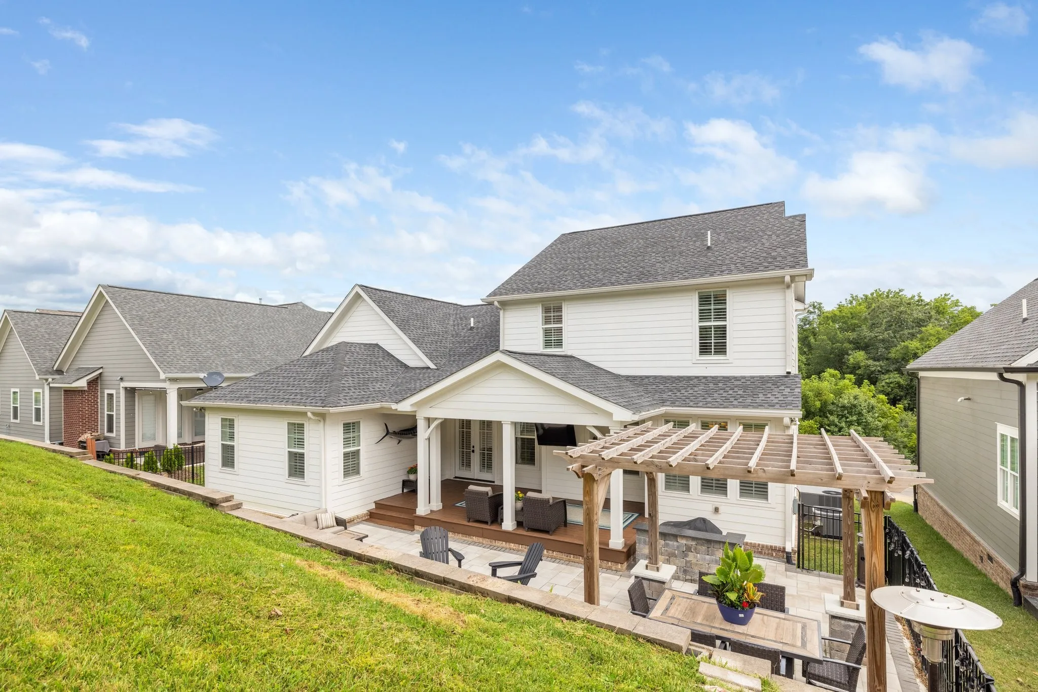 Custom-Built home with Designer Finishes in Coveted Ladd Park. Perfectly positioned on a premium lot facing permanent green space, this full custom home offers timeless charm and elevated comfort from the moment you arrive. The expansive front porch invites slow mornings and sunset views with rocking chairs and Southern hospitality. Step inside to a stunning white kitchen anchored by an oversized natural oak island with quartz countertops, a six-burner gas range, custom vent hood, and a walk-in pantry built for both form and function. The formal dining room is framed with detailed millwork, while the breakfast nook opens to your private backyard retreat. The main-level primary suite offers a spa-like experience with bold black-and-white tile, a glass-enclosed shower, a separate soaking tub, and a custom walk-in closet. Upstairs, a built-in desk nook adds flexibility for homework or remote work, and three generous bedrooms—one en suite—provide comfort and privacy. The oversized bonus room offers endless options for media, play, or entertaining—with ample storage throughout. Outside, enjoy an entertainer’s dream: a covered patio with added pavers, a pergola, a built-in grill station with soapstone countertops, and a cozy firepit—all surrounded by mature landscaping for privacy and beauty. Located in sought-after Ladd Park, residents enjoy community amenities including two pools, a basketball court, walking trails, and access to the Harpeth River.
