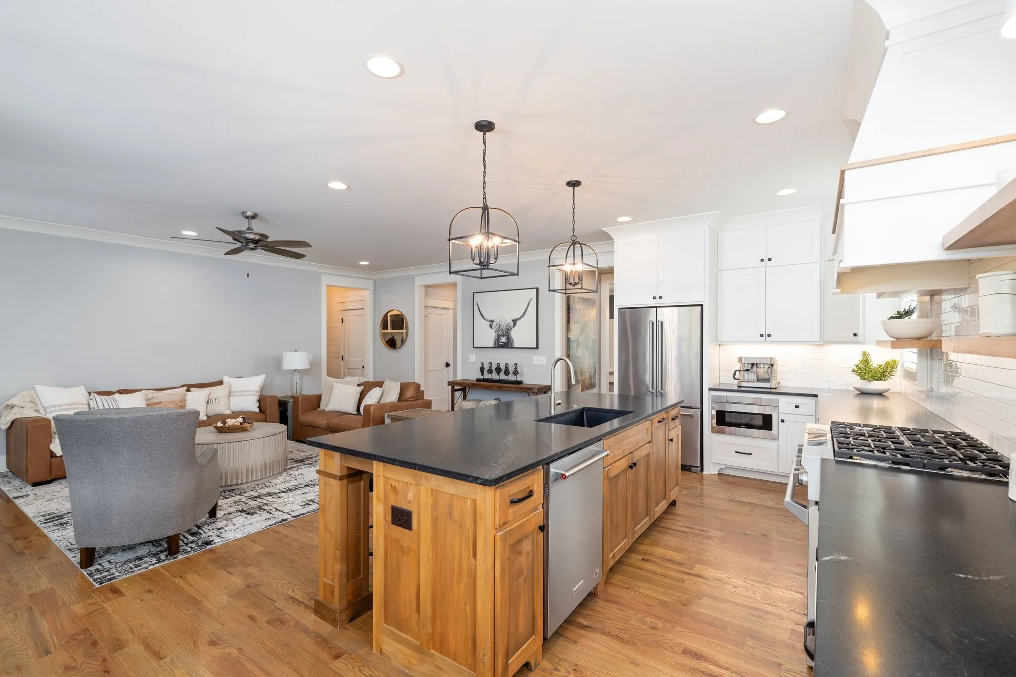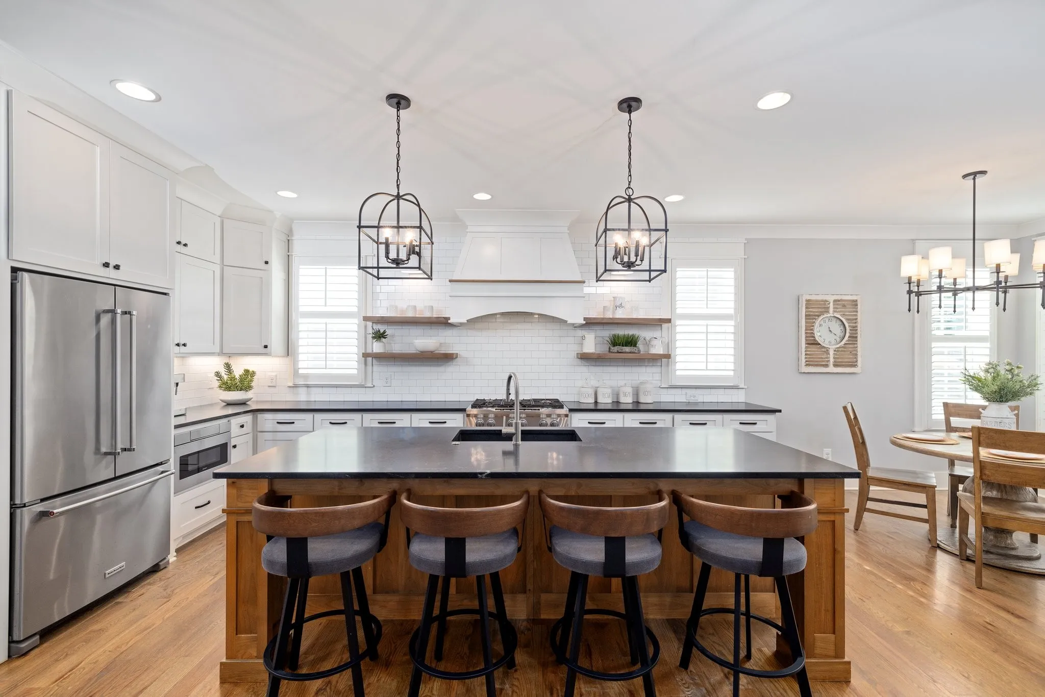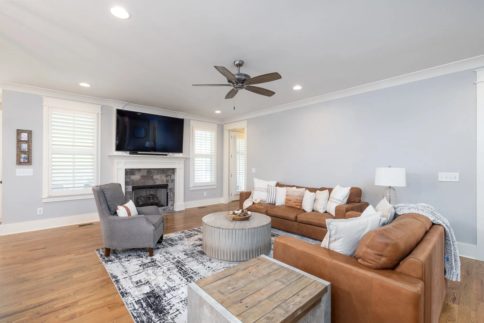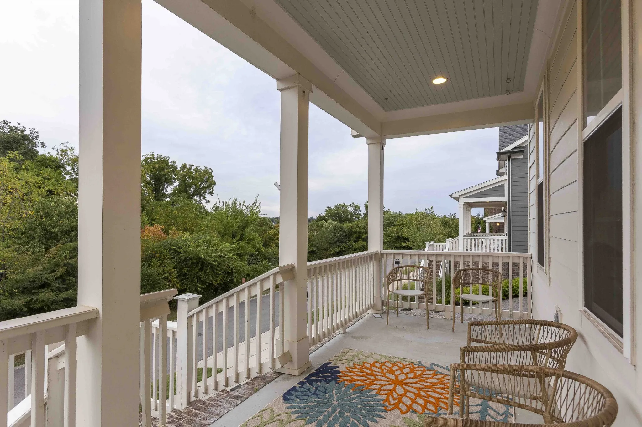 Custom-Built home with Designer Finishes in Coveted Ladd Park. Perfectly positioned on a premium lot facing permanent green space, this full custom home offers timeless charm and elevated comfort from the moment you arrive. The expansive front porch invites slow mornings and sunset views with rocking chairs and Southern hospitality. Step inside to a stunning white kitchen anchored by an oversized natural oak island with quartz countertops, a six-burner gas range, custom vent hood, and a walk-in pantry built for both form and function. The formal dining room is framed with detailed millwork, while the breakfast nook opens to your private backyard retreat. The main-level primary suite offers a spa-like experience with bold black-and-white tile, a glass-enclosed shower, a separate soaking tub, and a custom walk-in closet. Upstairs, a built-in desk nook adds flexibility for homework or remote work, and three generous bedrooms—one en suite—provide comfort and privacy. The oversized bonus room offers endless options for media, play, or entertaining—with ample storage throughout. Outside, enjoy an entertainer’s dream: a covered patio with added pavers, a pergola, a built-in grill station with soapstone countertops, and a cozy firepit—all surrounded by mature landscaping for privacy and beauty. Located in sought-after Ladd Park, residents enjoy community amenities including two pools, a basketball court, walking trails, and access to the Harpeth River.