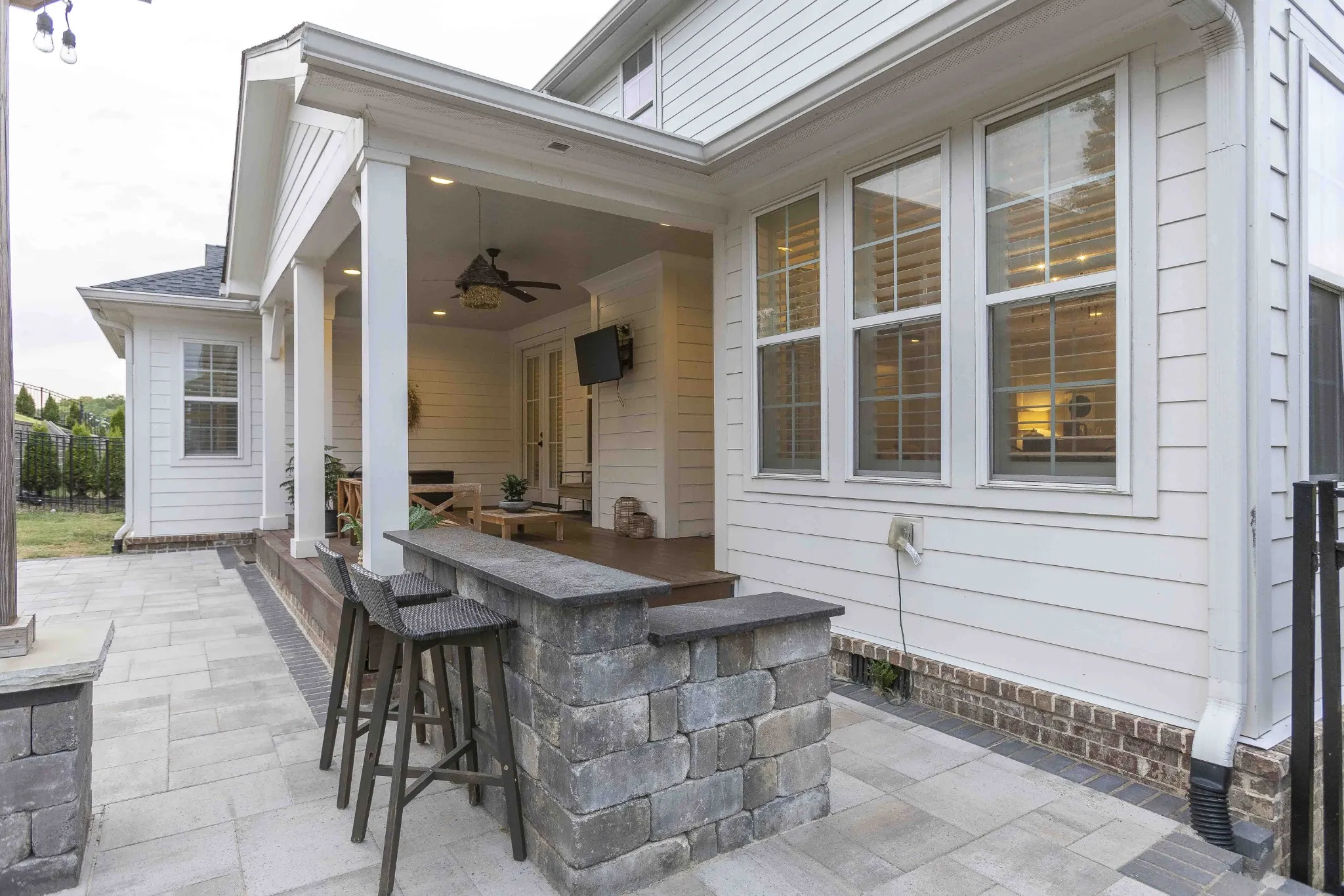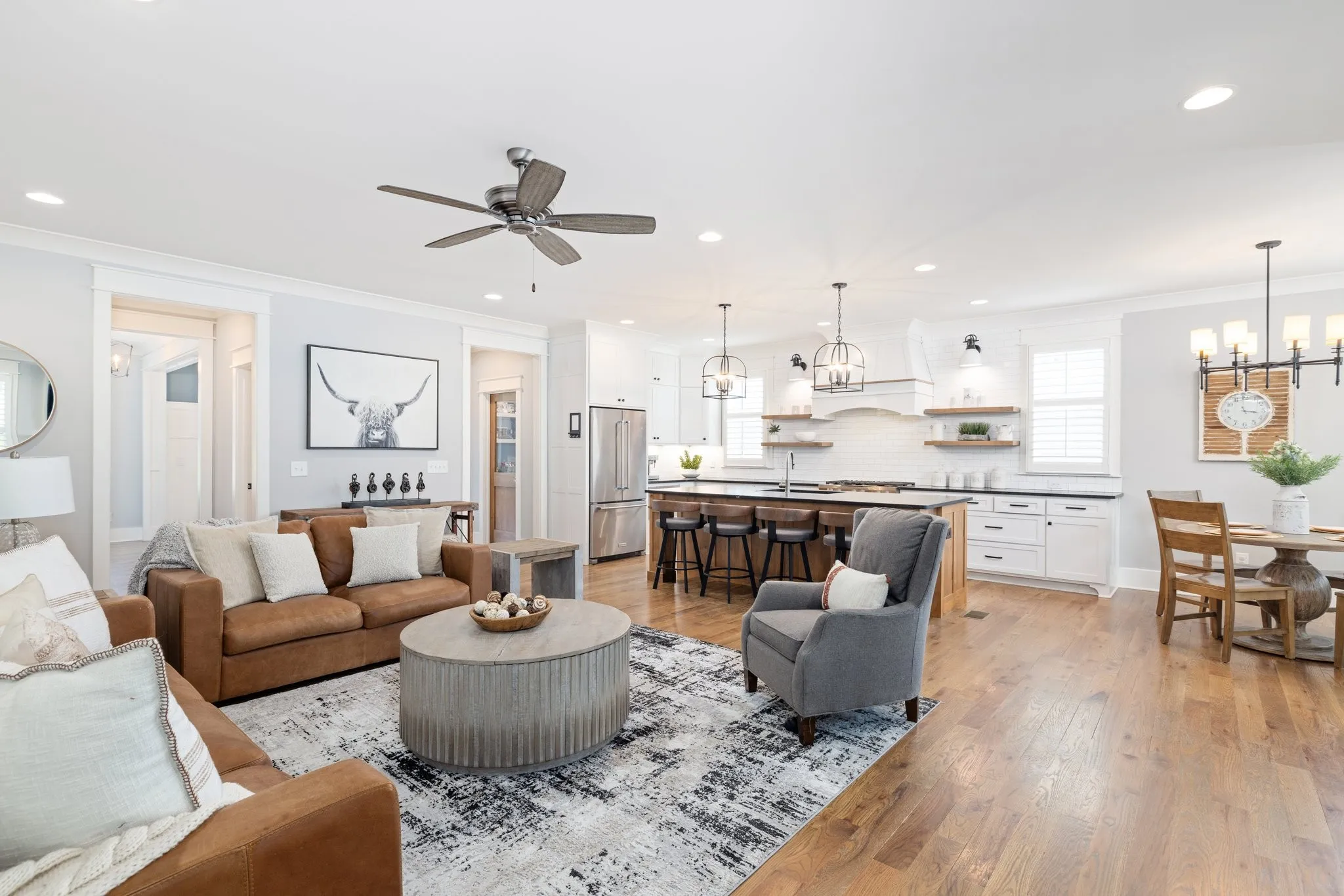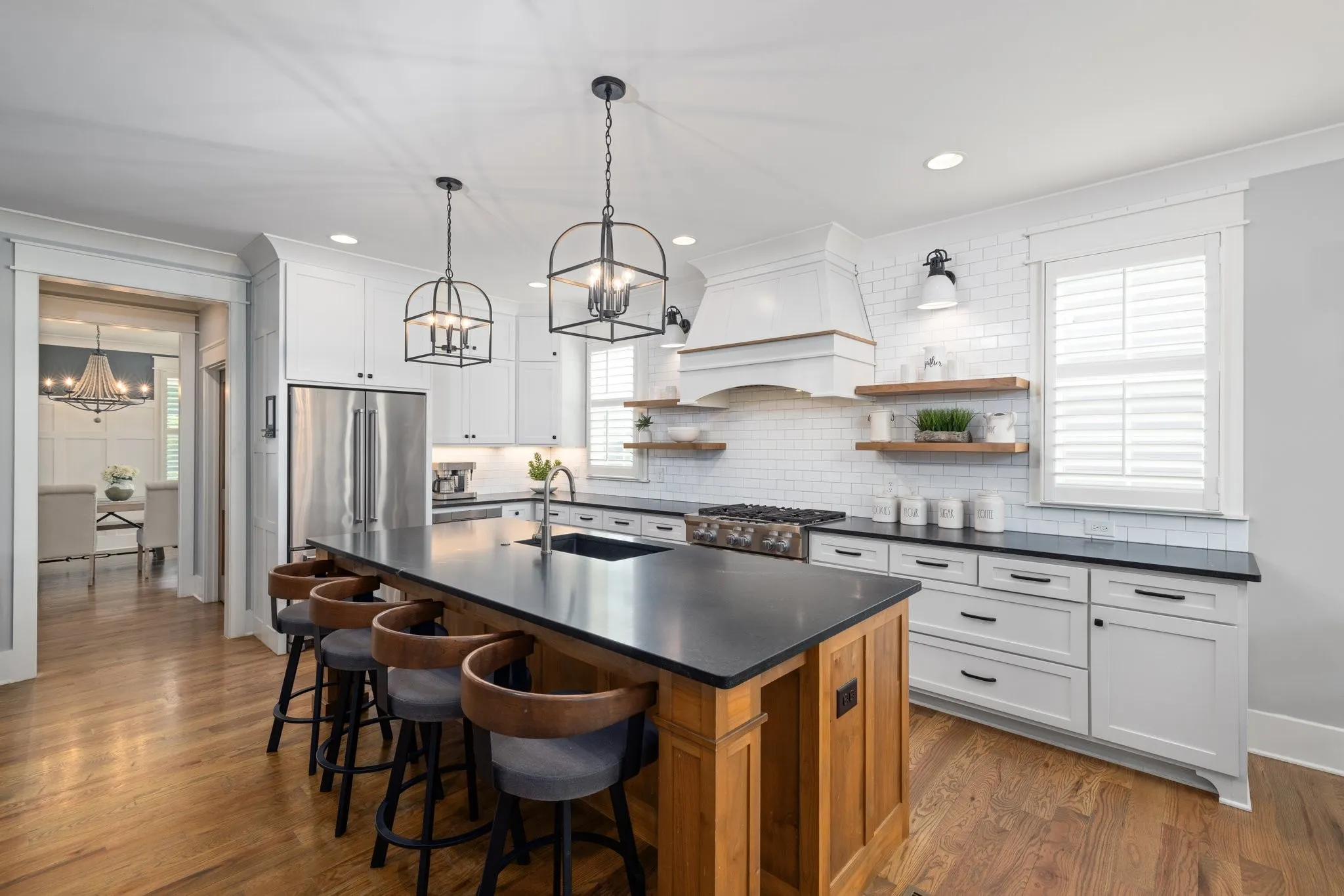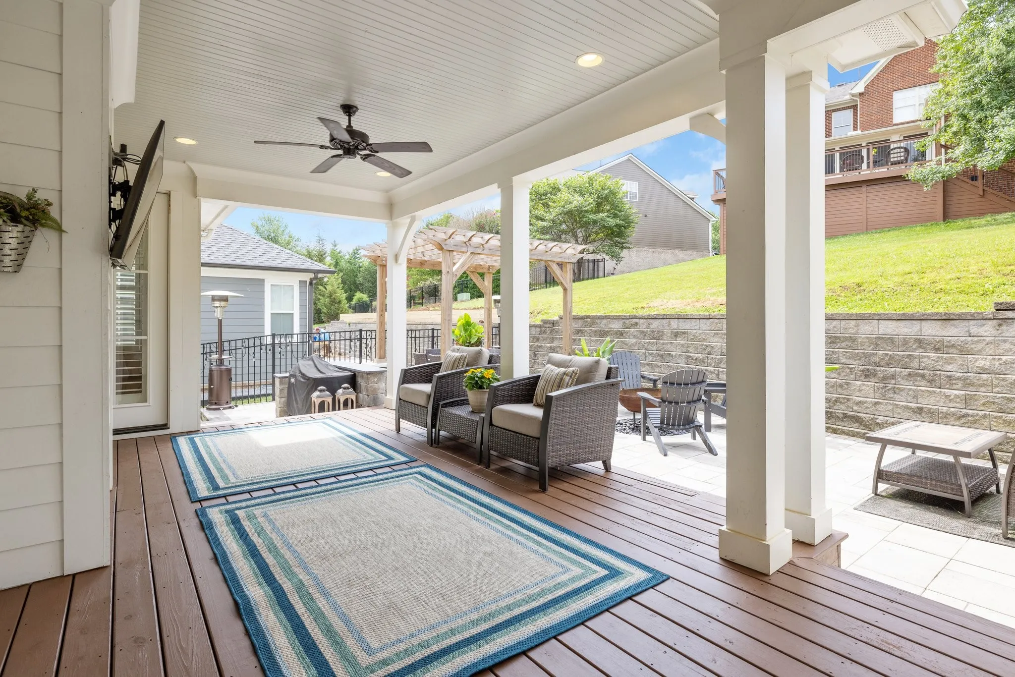 Custom-Built home with Designer Finishes in Coveted Ladd Park. Perfectly positioned on a premium lot facing permanent green space, this full custom home offers timeless charm and elevated comfort from the moment you arrive. The expansive front porch invites slow mornings and sunset views with rocking chairs and Southern hospitality. Step inside to a stunning white kitchen anchored by an oversized natural oak island with quartz countertops, a six-burner gas range, custom vent hood, and a walk-in pantry built for both form and function. The formal dining room is framed with detailed millwork, while the breakfast nook opens to your private backyard retreat. The main-level primary suite offers a spa-like experience with bold black-and-white tile, a glass-enclosed shower, a separate soaking tub, and a custom walk-in closet. Upstairs, a built-in desk nook adds flexibility for homework or remote work, and three generous bedrooms—one en suite—provide comfort and privacy. The oversized bonus room offers endless options for media, play, or entertaining—with ample storage throughout. Outside, enjoy an entertainer’s dream: a covered patio with added pavers, a pergola, a built-in grill station with soapstone countertops, and a cozy firepit—all surrounded by mature landscaping for privacy and beauty. Located in sought-after Ladd Park, residents enjoy community amenities including two pools, a basketball court, walking trails, and access to the Harpeth River.