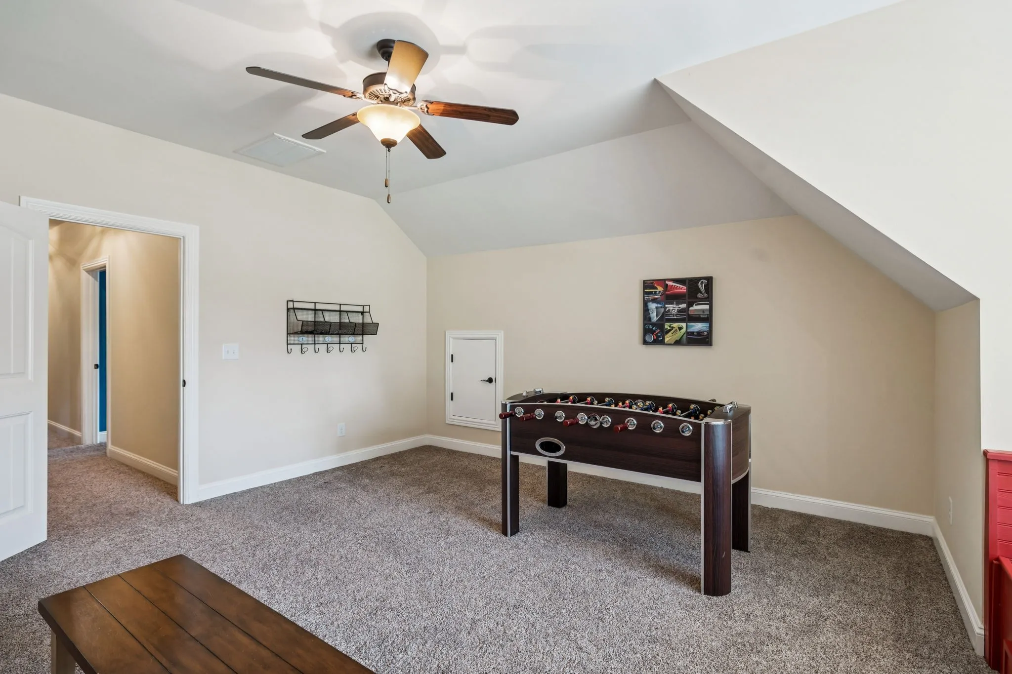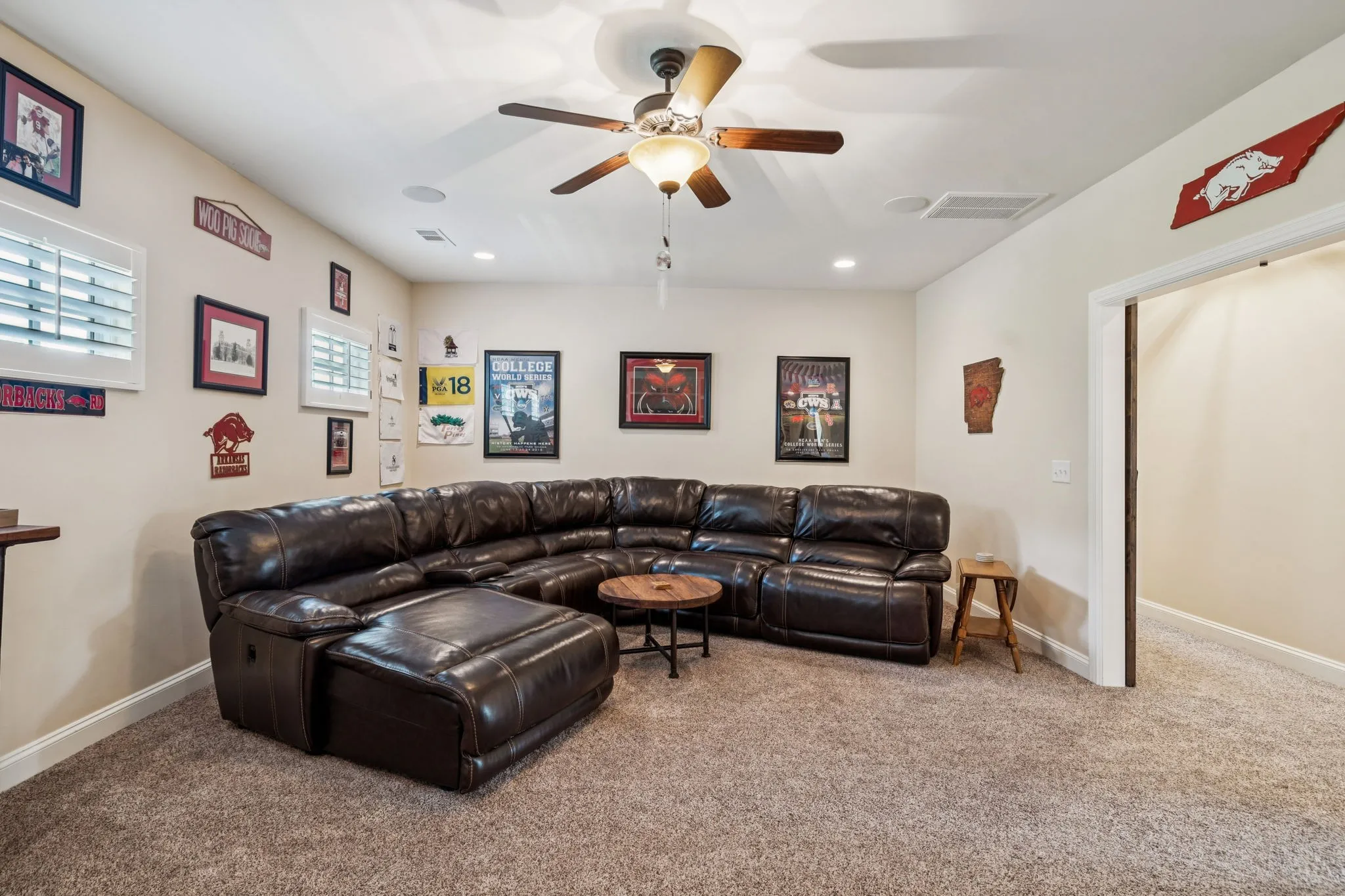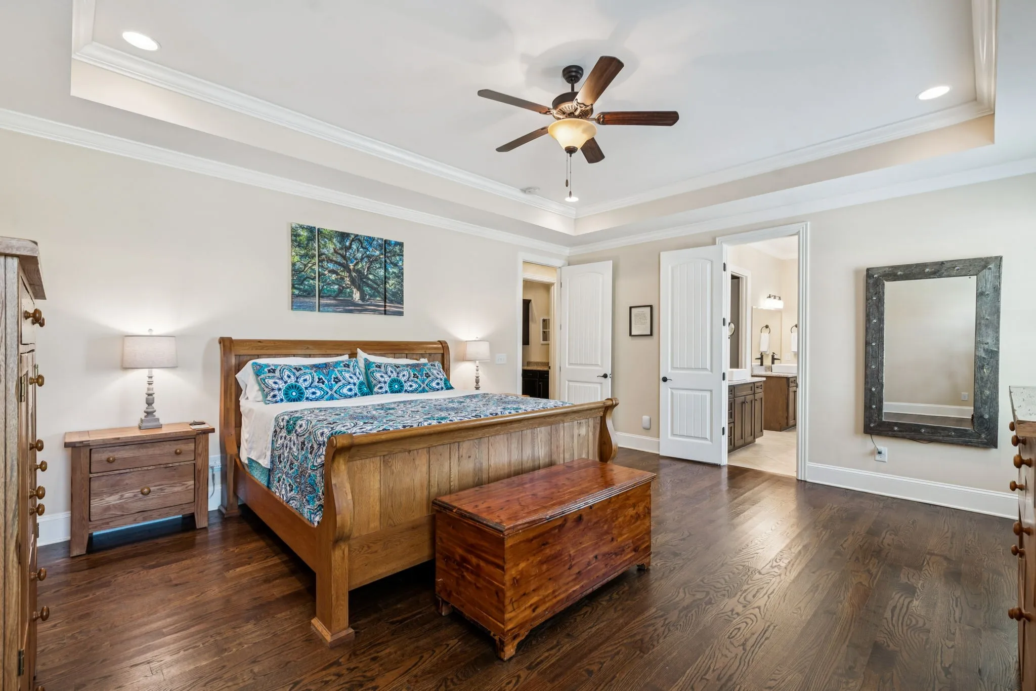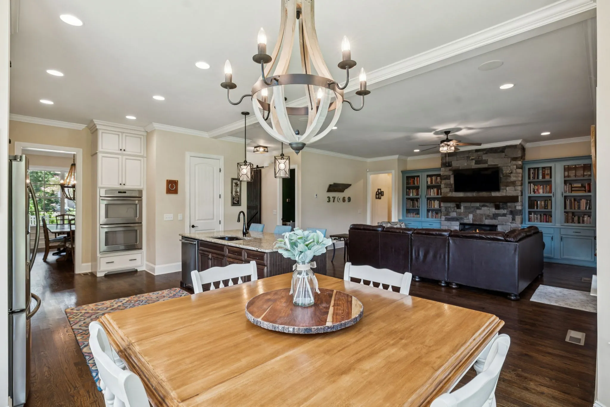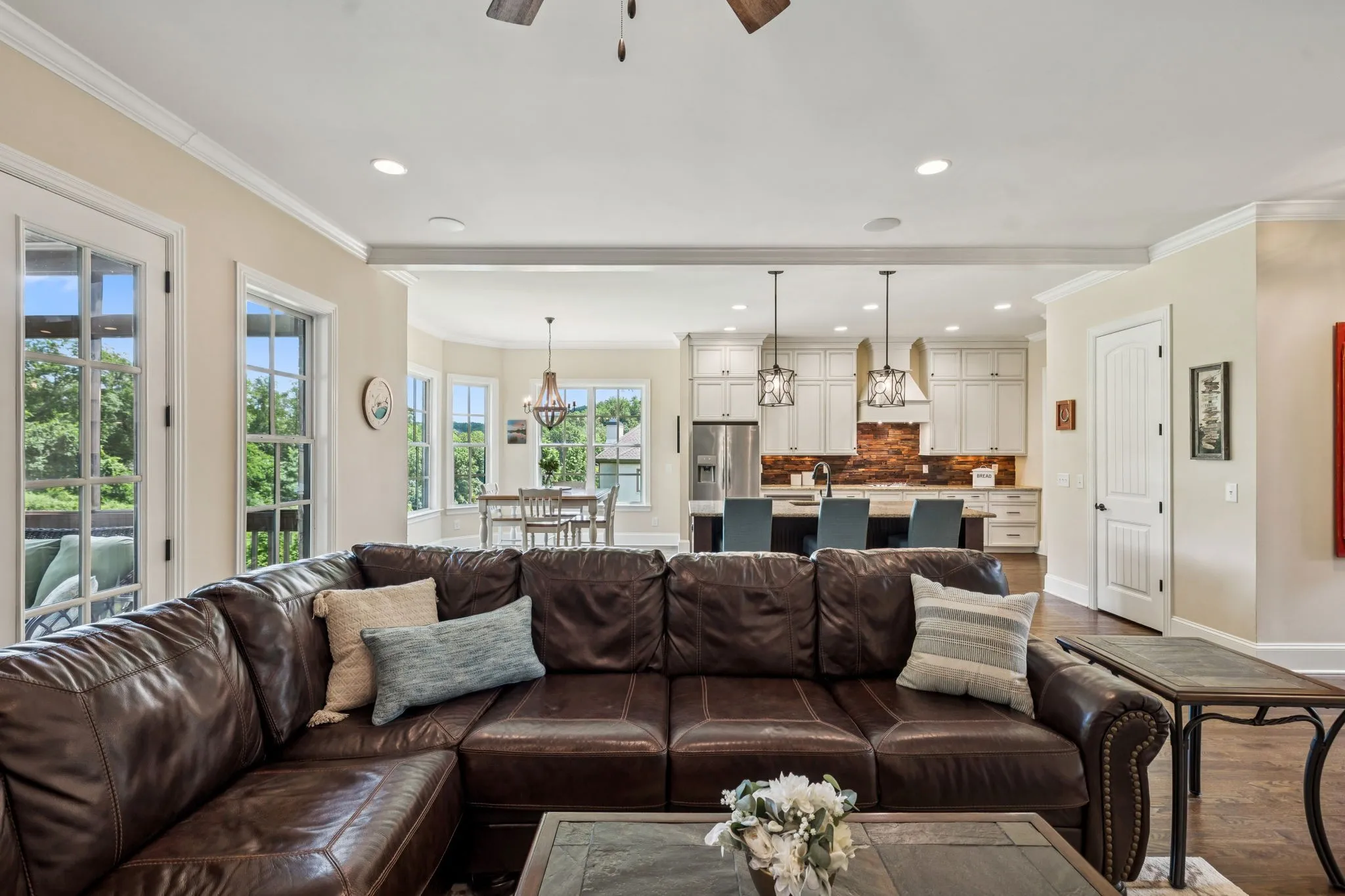 The main-level primary suite offers a quiet retreat with two walk-in closets and a private bath. A second bedroom on the main level, complete with its own en-suite bath, offers flexibility for guests, children, or multi-generational living. Upstairs, a large flex room and separate rec room provide versatile options for a playroom, home office, or media space.\n