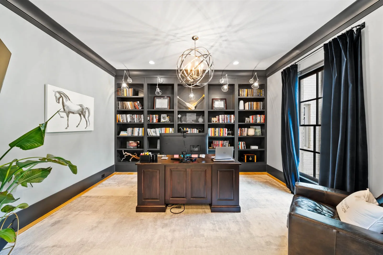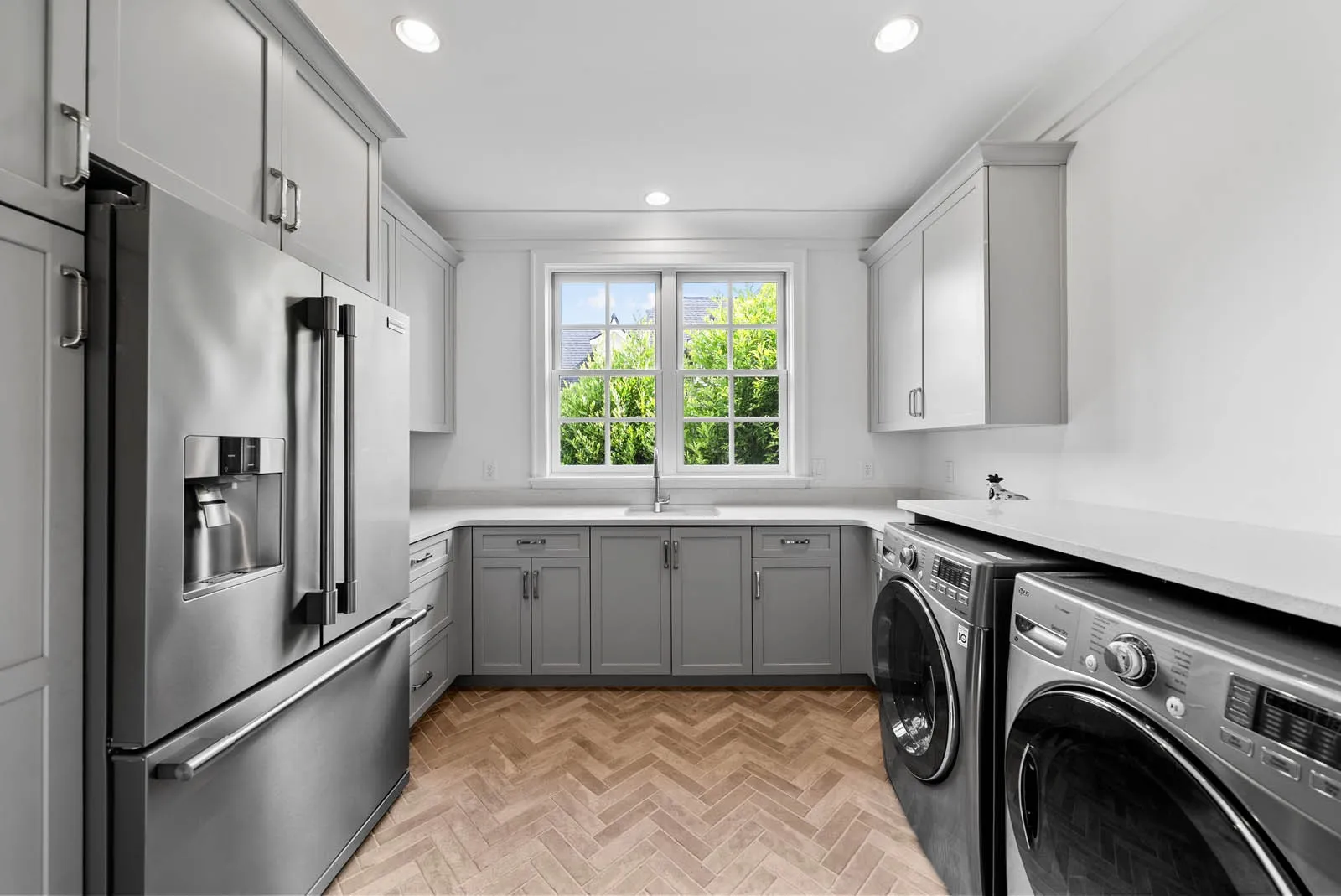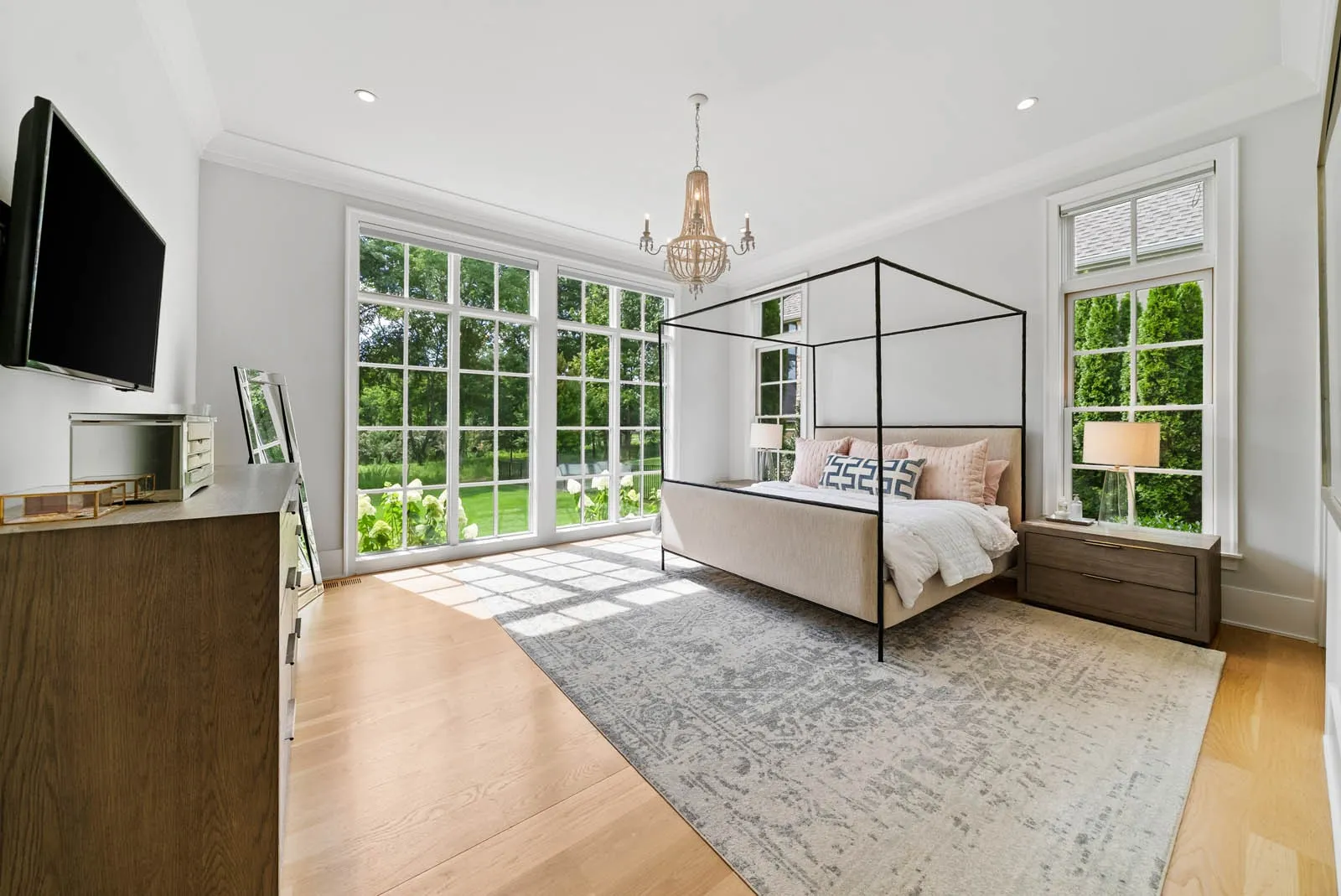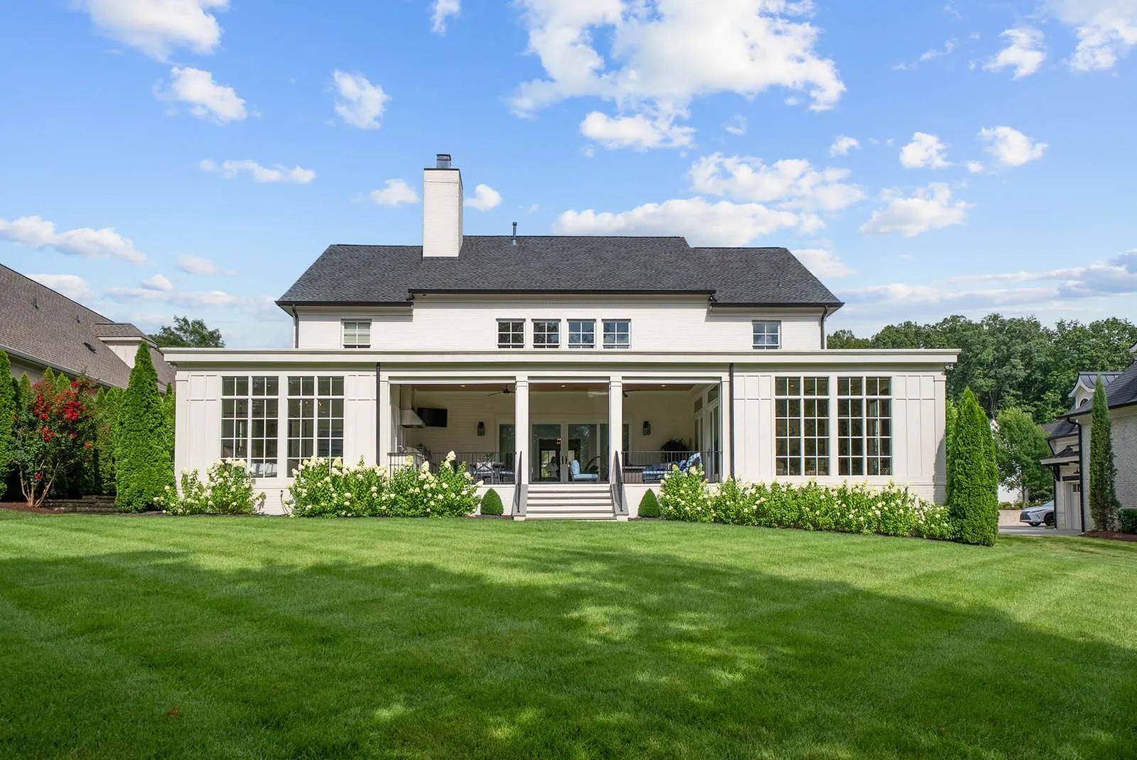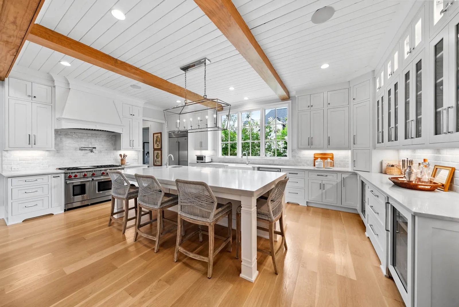 The chef’s kitchen is a showstopper, equipped with a Wolf stove, Sub-Zero refrigerator, and a second fridge in the adjacent laundry room. Outside, the covered back porch with a fully outfitted outdoor kitchen is perfect for entertaining or simply enjoying the peaceful surroundings. The 4-car courtyard-style garage includes two bays on each side of a private motor court, offering generous space and functionality.\n