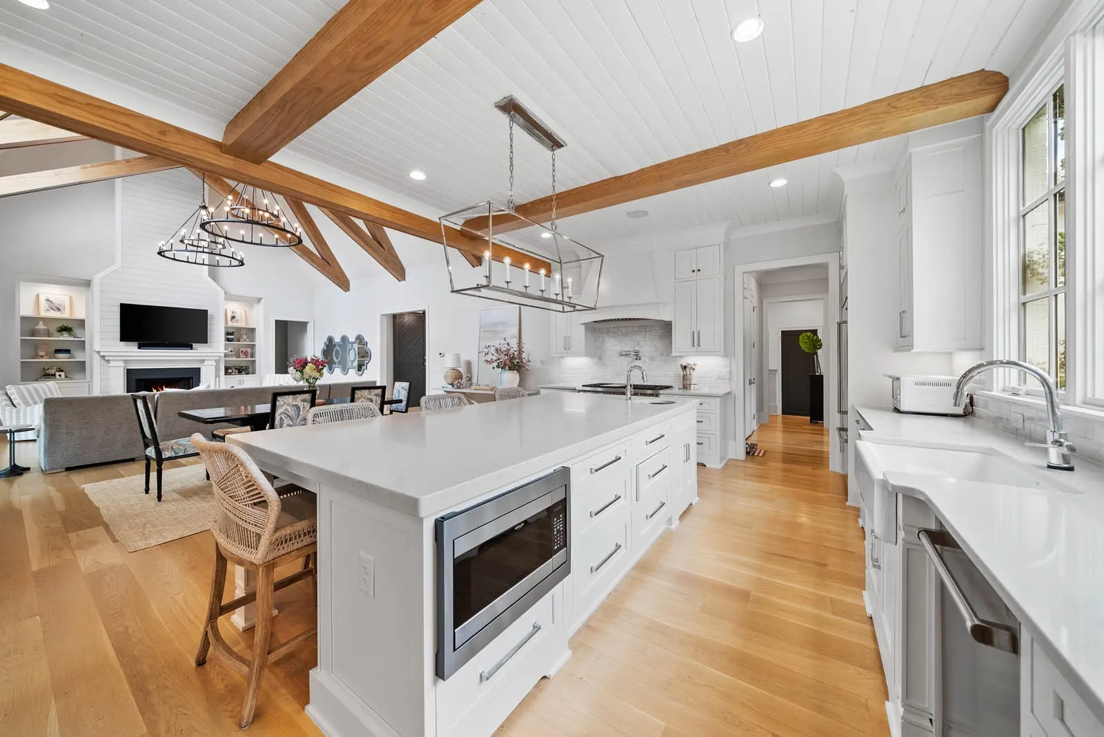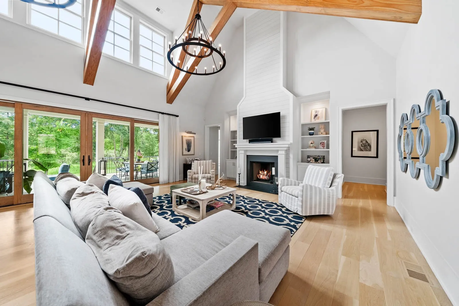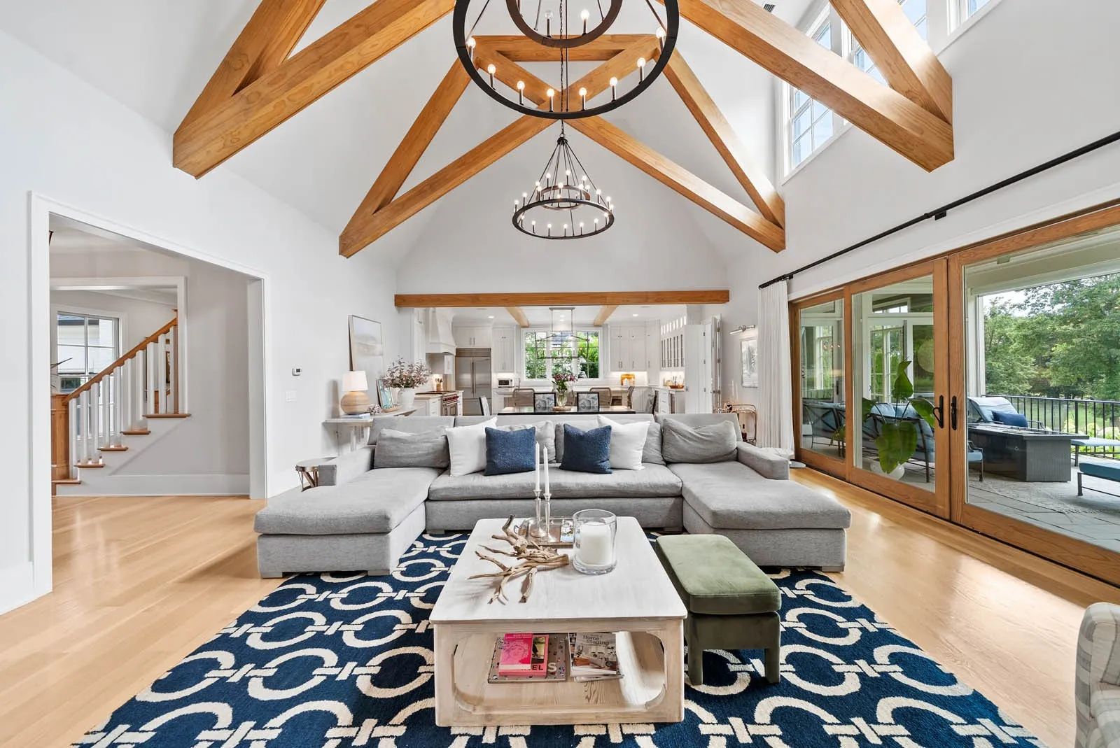 Spanning over 5,152 square feet, the home is filled with natural light and thoughtfully designed for both comfort and sophistication. The open-concept layout features vaulted, wood-beamed ceilings, expansive floor-to-ceiling windows in the great room, and seamless indoor-outdoor living. The main level includes a luxurious primary suite and a guest bedroom, while the upper level offers additional bedrooms, a kids’ den or playroom, and a large insulated storage area with the potential to be finished to suit your needs.\n