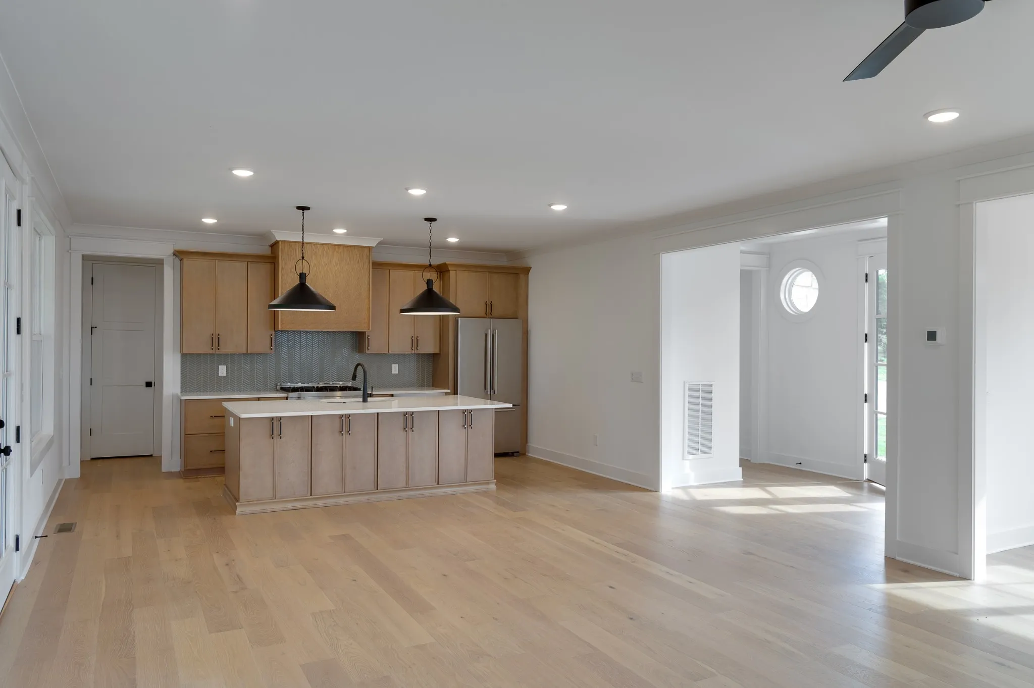 Luxury living at Fanning Bend. This home blends casual lake life with elevated design. The sun-lit living area features wide-plank hardwoods, a stone fireplace, and a wall of windows that opens to the surrounding woods and lake. The kitchen stands out with natural wood cabinetry, designer lighting and backsplash, and a spacious island—perfect for gathering.