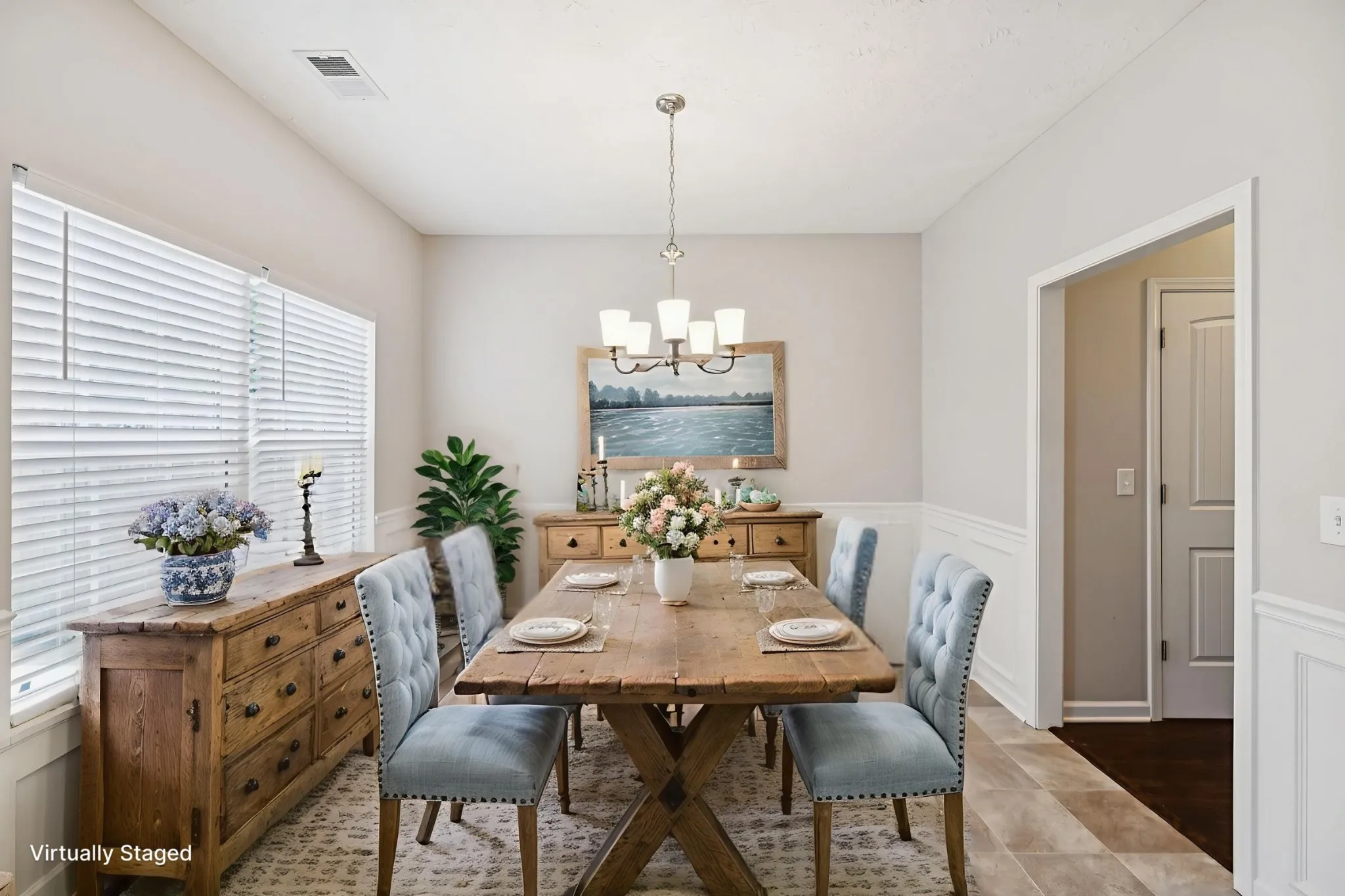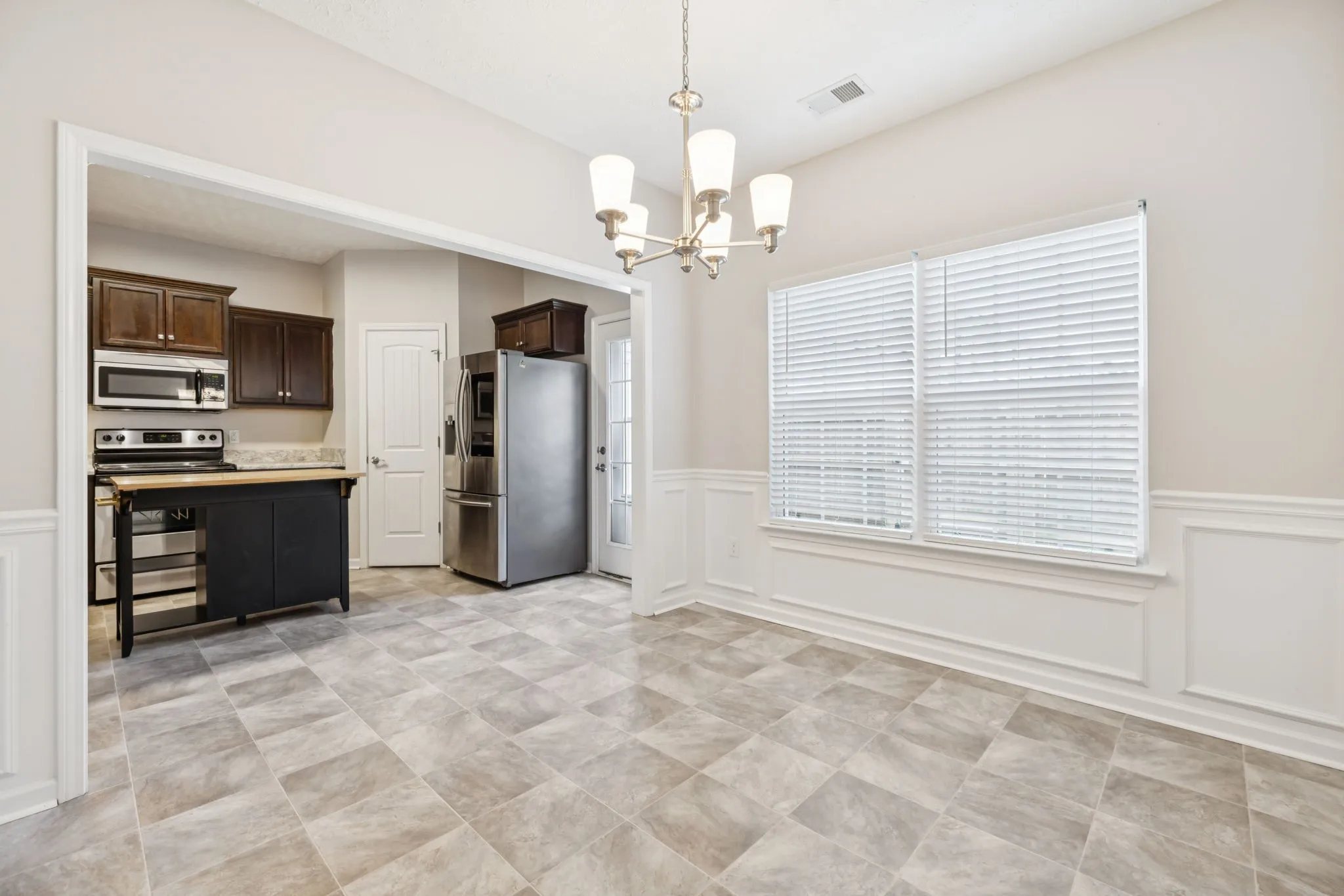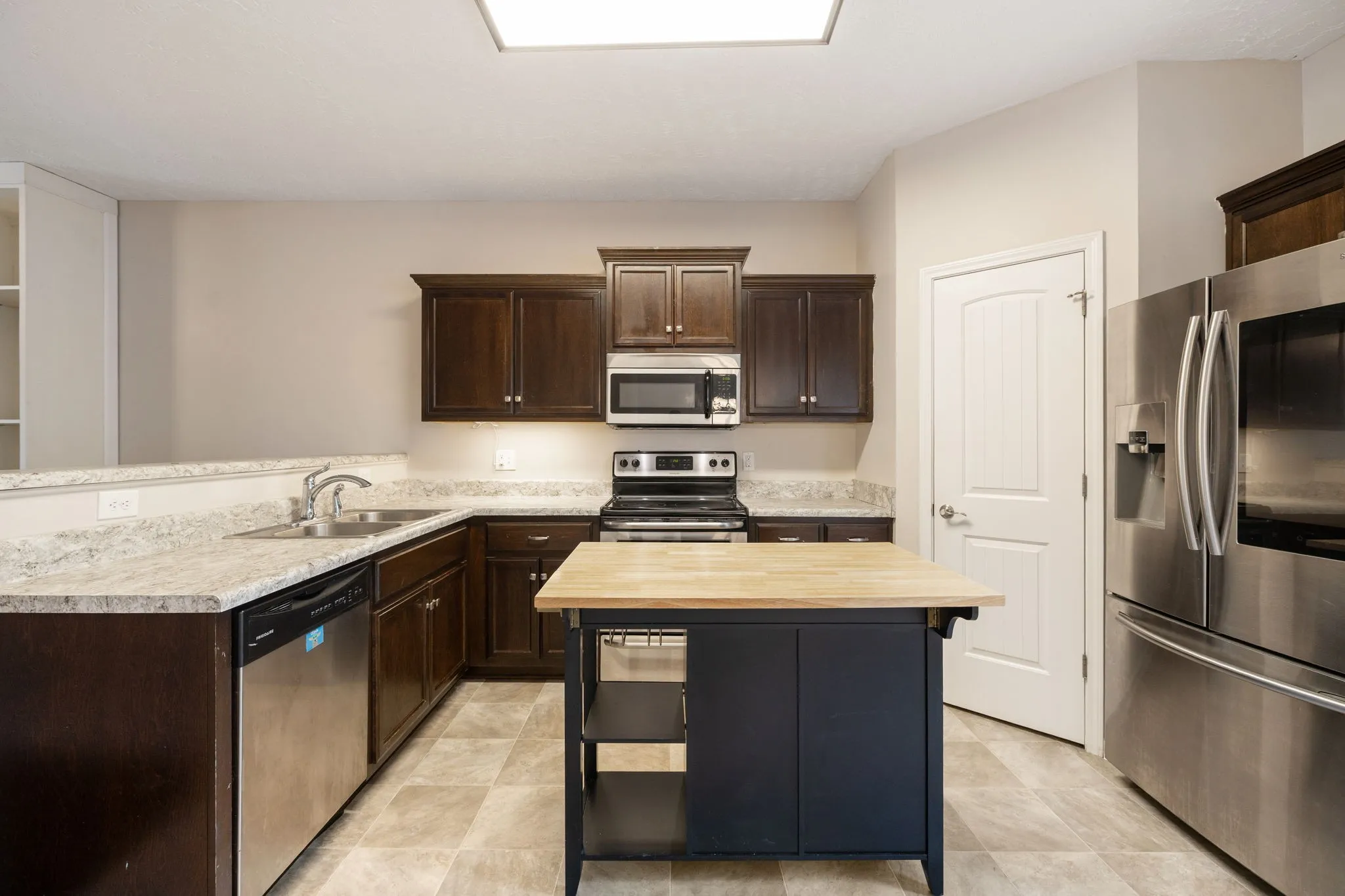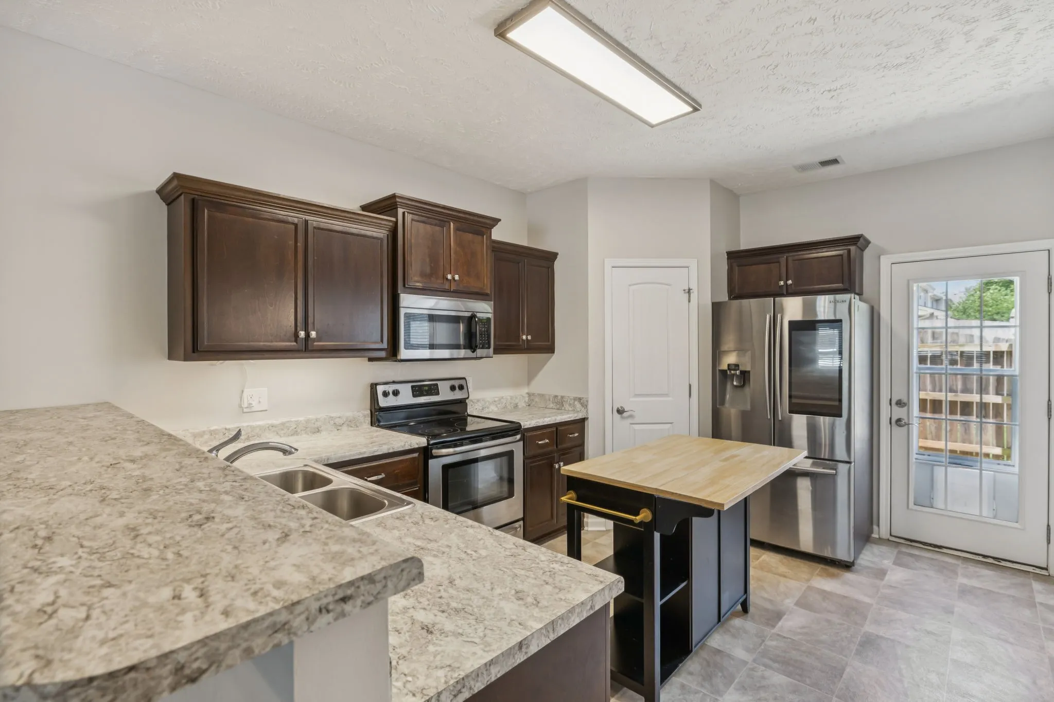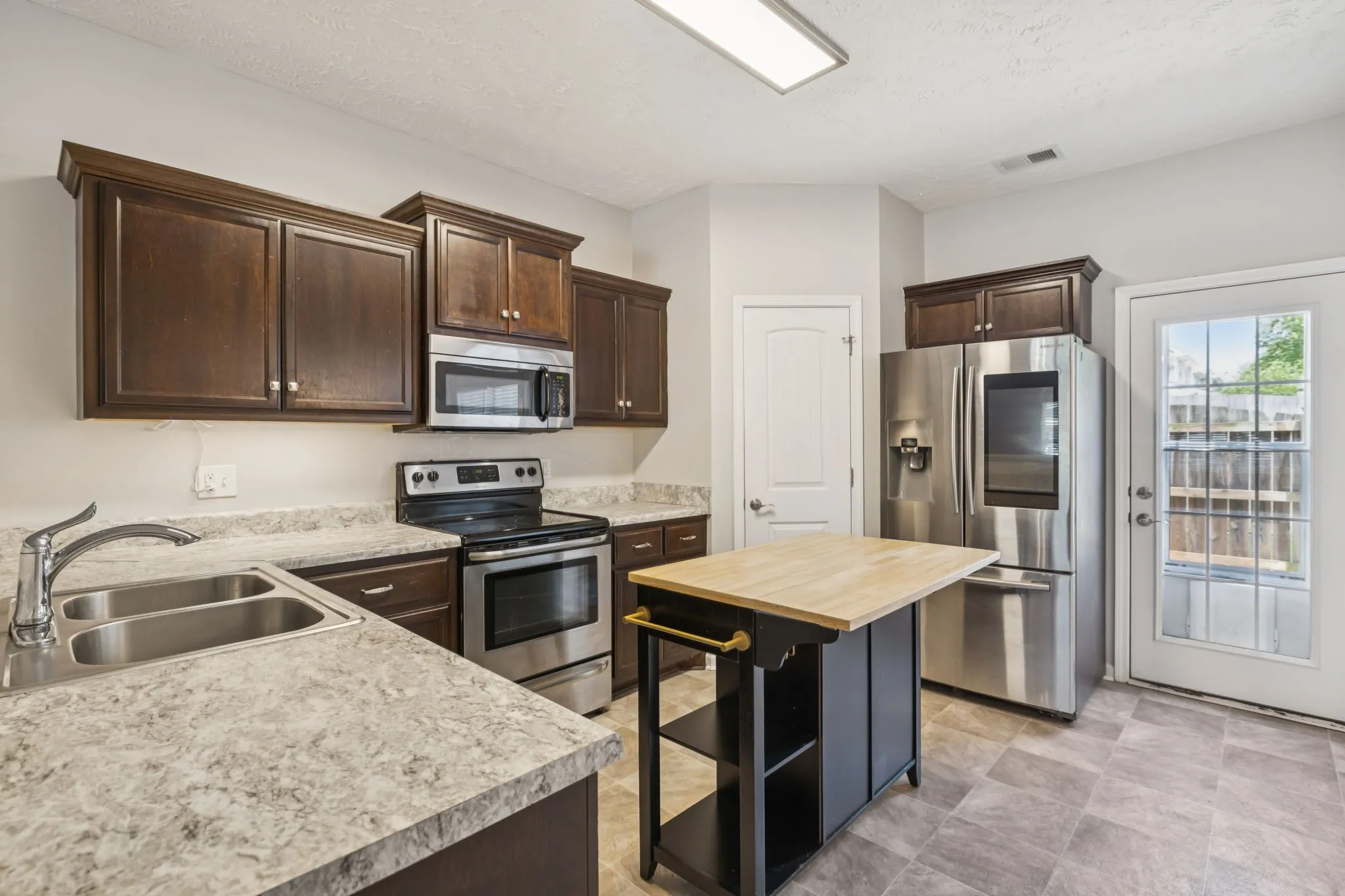 Adjacent to the living room, you will find an ample kitchen highlighted by its mahogany-stained cabinets, a center island for extra storage and easy entertaining, along with updated stainless steel appliances, including a WiFi-ready Samsung French 3-door Smart Refrigerator. The recently remodeled dining room boasts new vinyl flooring and updated lighting.