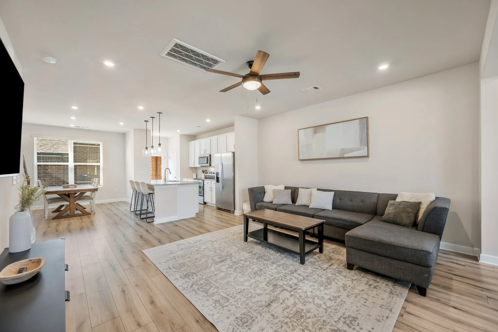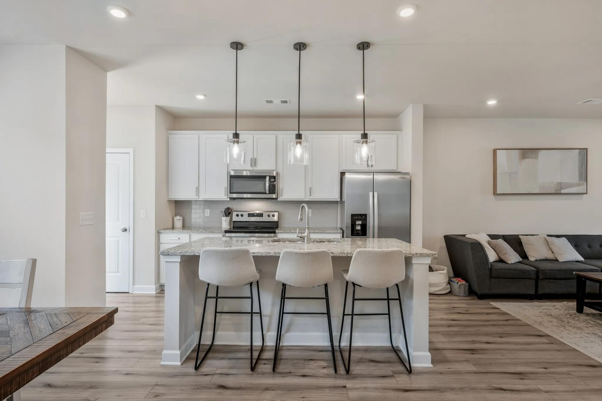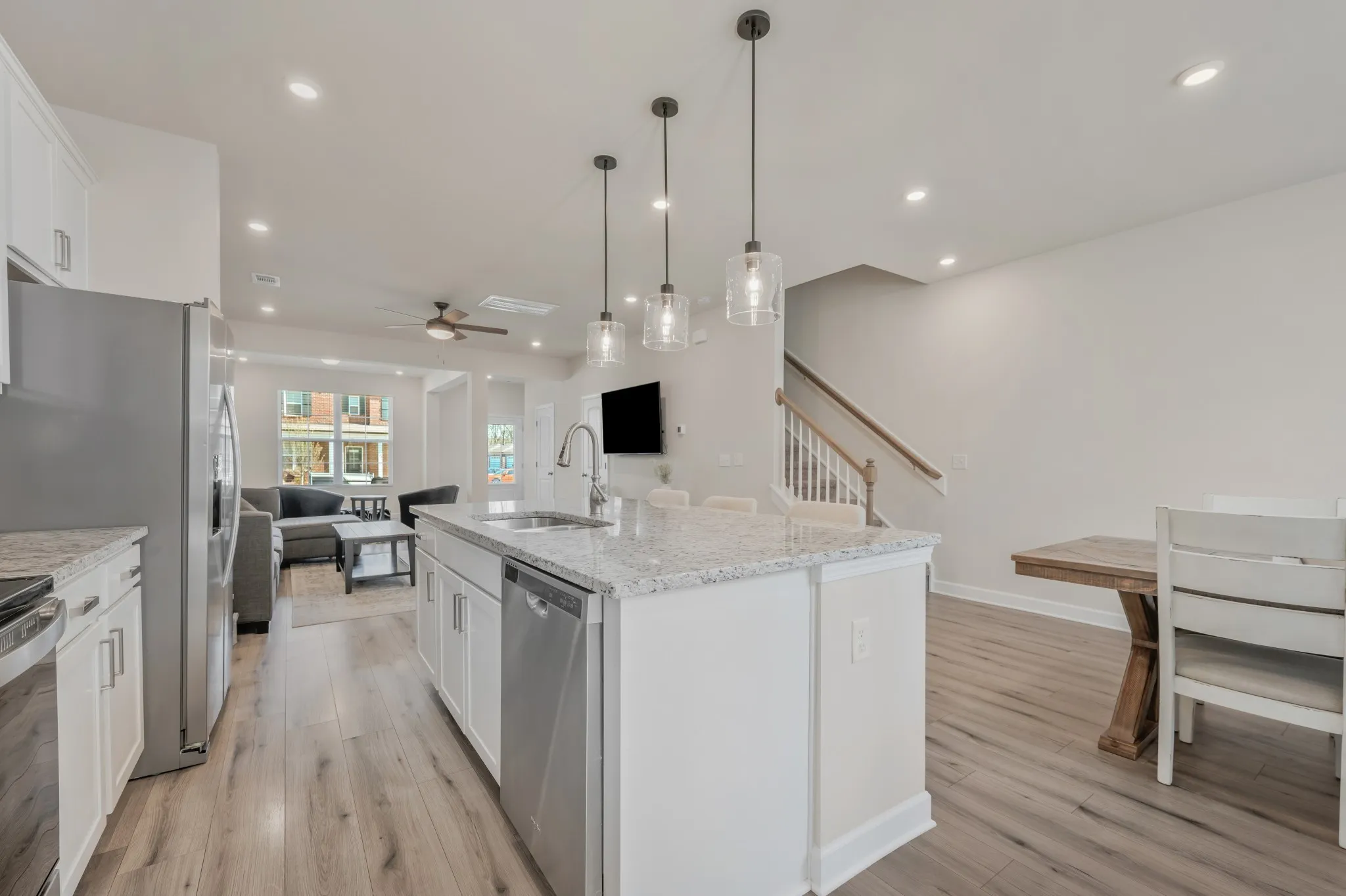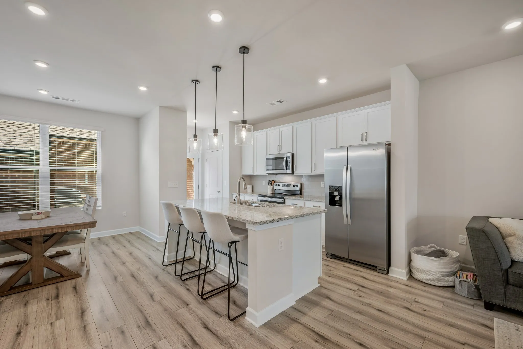 Continue to show for backup offer! Beautiful townhome in a great location in Murfreesboro with assumable loan at 4.75%. This townhome features a fantastic floor plan that feels notably more open and spacious than other townhomes of similar size in the community. Upon entering the front door from the full-width covered front porch, you’ll find an entry area and a distinct—yet open—flex space that could serve as an office, formal dining area, kids’ playroom, or a second, more formal living space. Beyond this flex space is the living room, which flows seamlessly into the kitchen and dining area. The kitchen includes granite countertops, stainless steel appliances, white painted cabinets, a pantry, and a large island with countertop seating for three, an under-mount sink, and pendant lighting overhead. Just beyond the kitchen, near the back door, is a built-in drop zone with coat hooks and shoe cubbies. Don’t miss the nine-foot ceilings, wide-plank LVP flooring, recessed LED lighting, half bathroom, and large storage/utility closet on the main level. Upstairs (where you’ll also find nine-foot ceilings—a rarity for a townhome) is the primary suite, complete with a spacious walk-in closet and a generously sized full bathroom featuring a walk-in shower, double vanity, linen closet, and separate water closet. Down the second-floor hallway, you’ll find the second and third bedrooms, another full bathroom with a tub/shower combination, and a convenient laundry space. Back on the main level, step out the rear door to a private patio with ample room for a grill and patio furniture, or continue under the breezeway to your own two-car garage. This community offers sidewalks, guest parking areas, underground utilities, a neighborhood playground, and even its own dog park. It is located within five minutes of many popular destinations, including ALDI, Kroger, Publix, Walmart, Chick-fil-A, McKnight Park, and Siegel Soccer Complex, just to name a few.