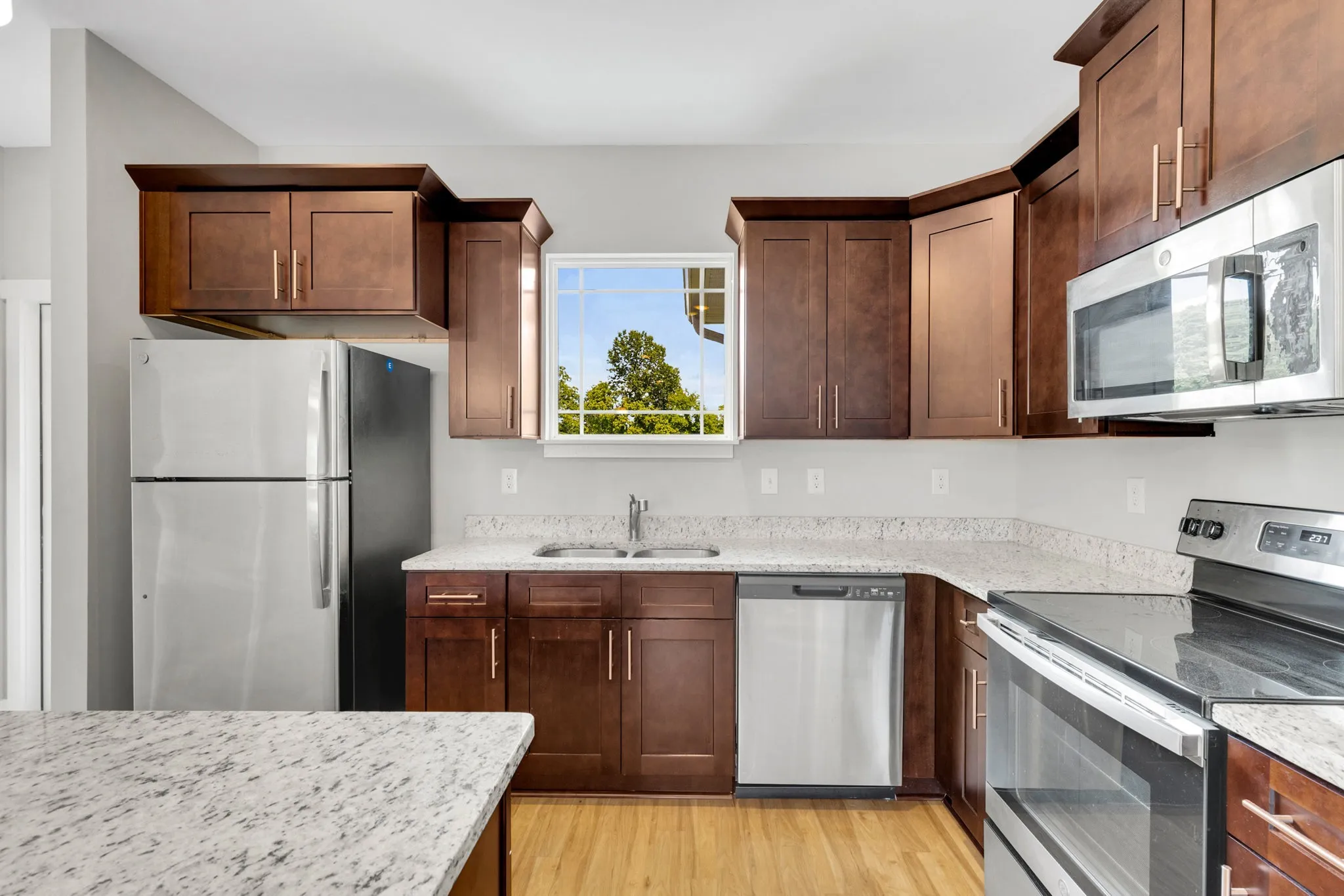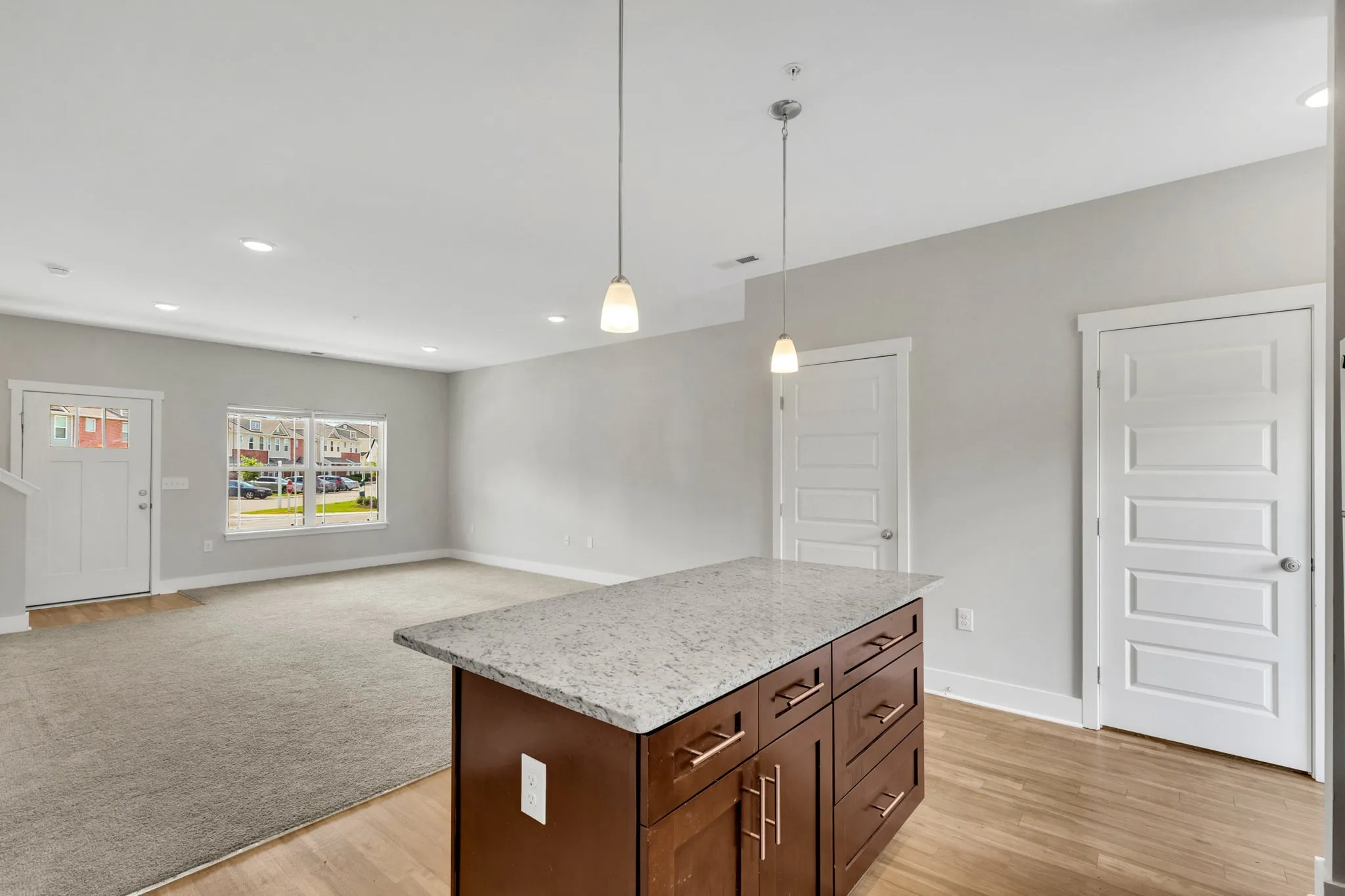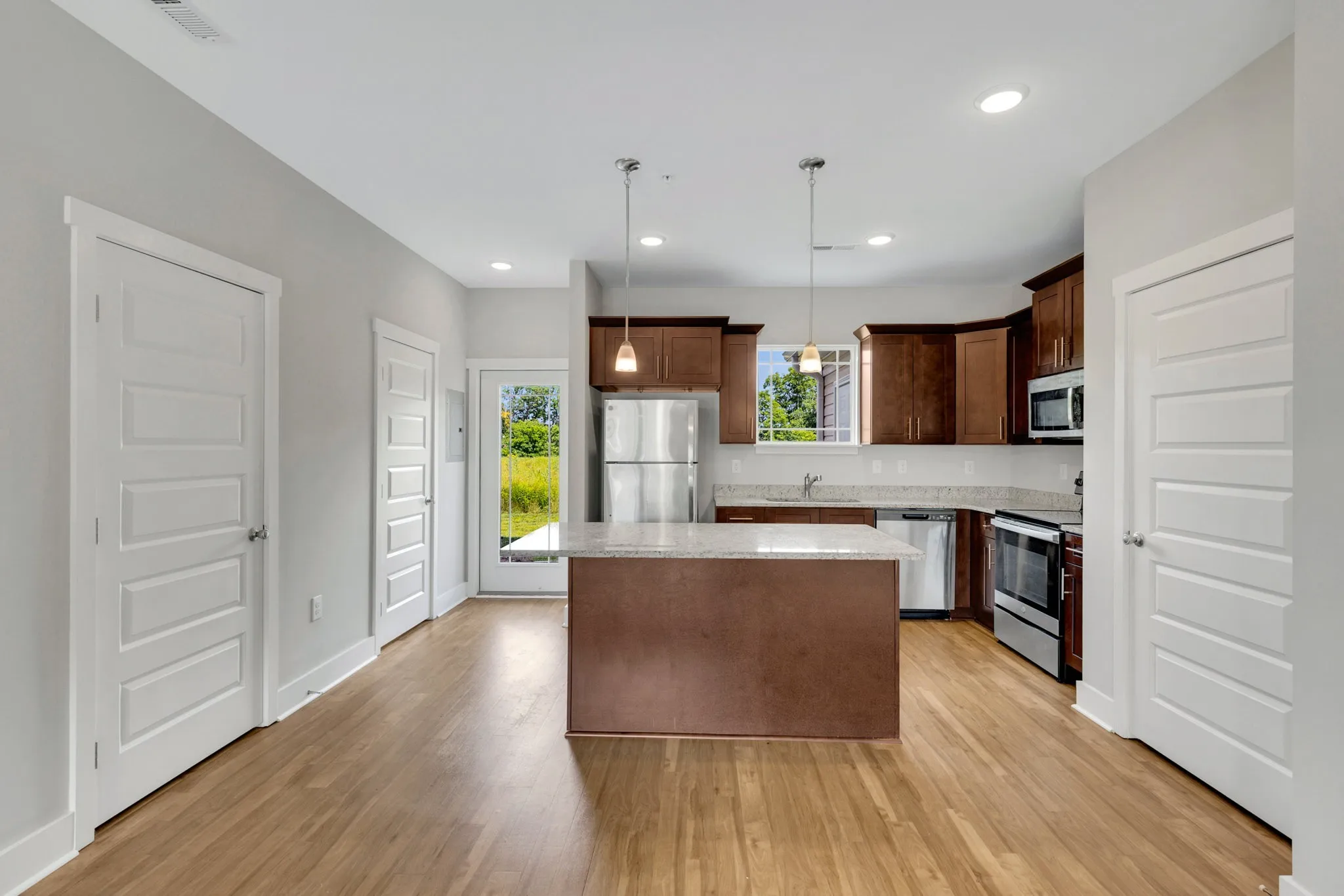 Inside, the open-concept floor plan is filled with natural light. The kitchen features stainless steel appliances, granite countertops, a center island, and a spacious pantry — perfect for both everyday meals and entertaining. Upstairs, both bedrooms offer en suite bathrooms, with the primary suite featuring a large walk-in closet and dual vanity with granite counters.