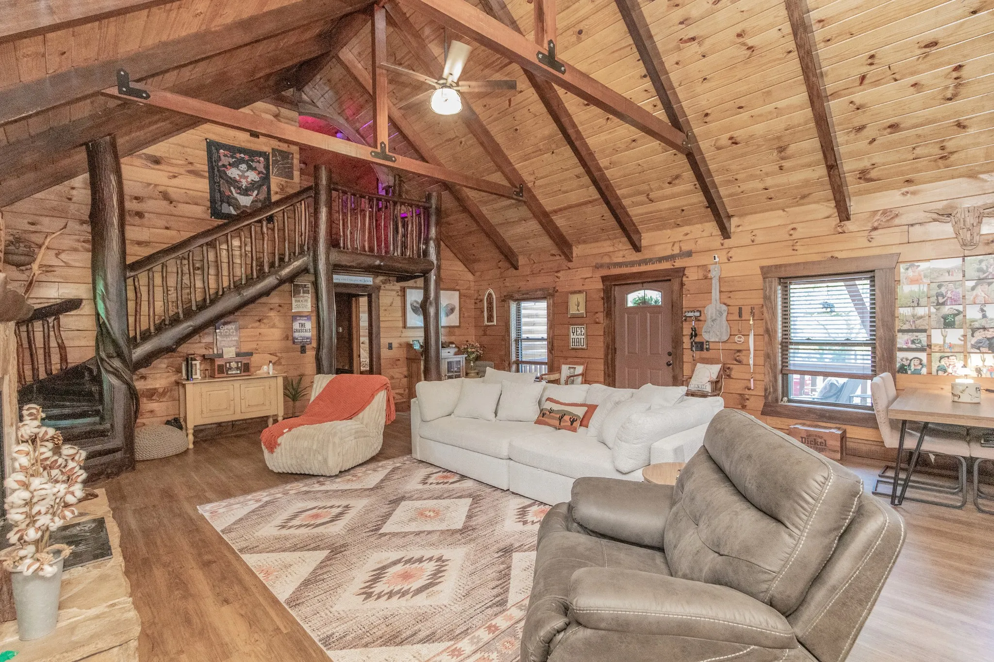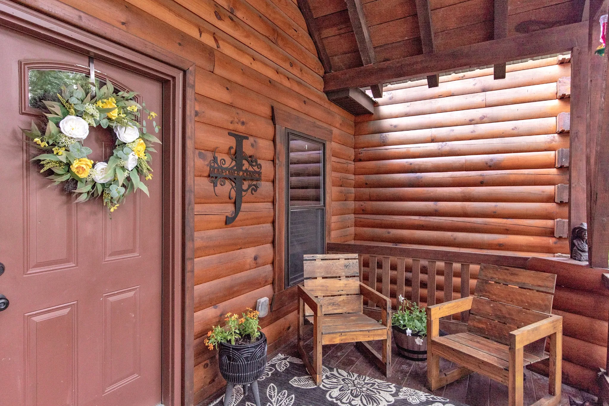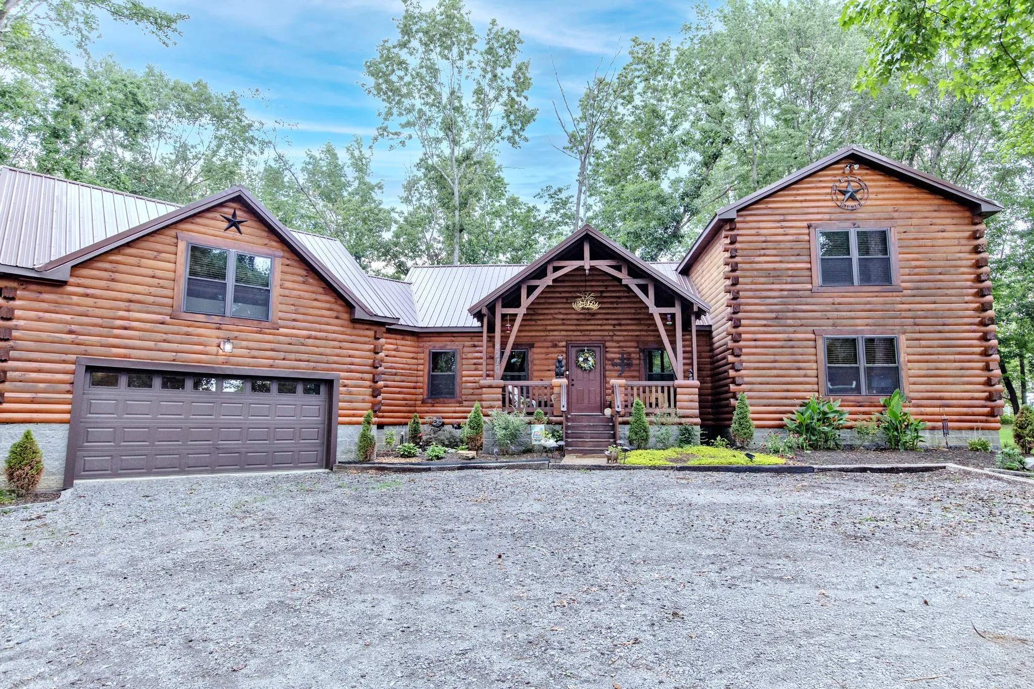 Beautiful custom log home on 3 plus acres. Lot has numerous trees and privacy. Located right out side city limits of White House. Master suite on main level, 2 bdrms, and full bath on second level w/loft area. Loft overlooks open living area. Rock fireplace in living room. Dining room with sliding door (currently used as a den). Spacious kitchen with island and eat-in area . Utility room/pantry off from kitchen. Too many custom features to mention, will have to view in person. 3 deer antler chandeliers, Circle drive. Unbelievable covered back porch overlooking private back yard, perfect fire pit area, 2 car garage. Covered front porch to greet your many guest. The staircase was made from trees from the property. A rare gem of a property! Tons of storage off the bonus room.