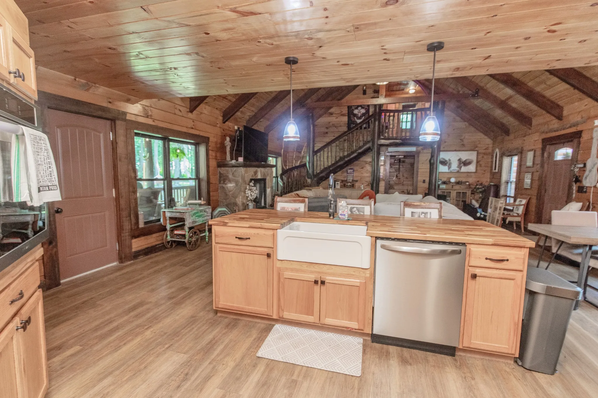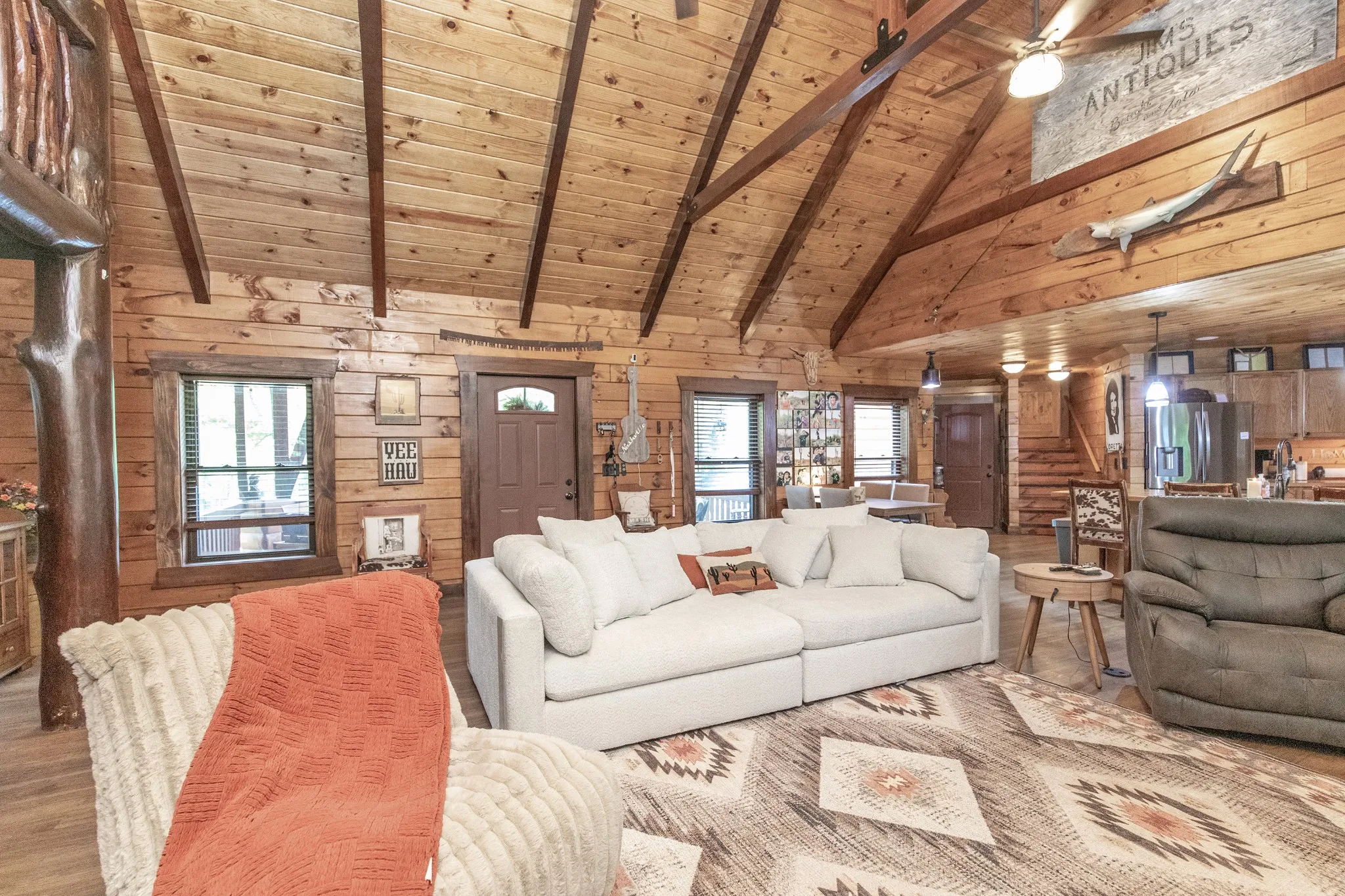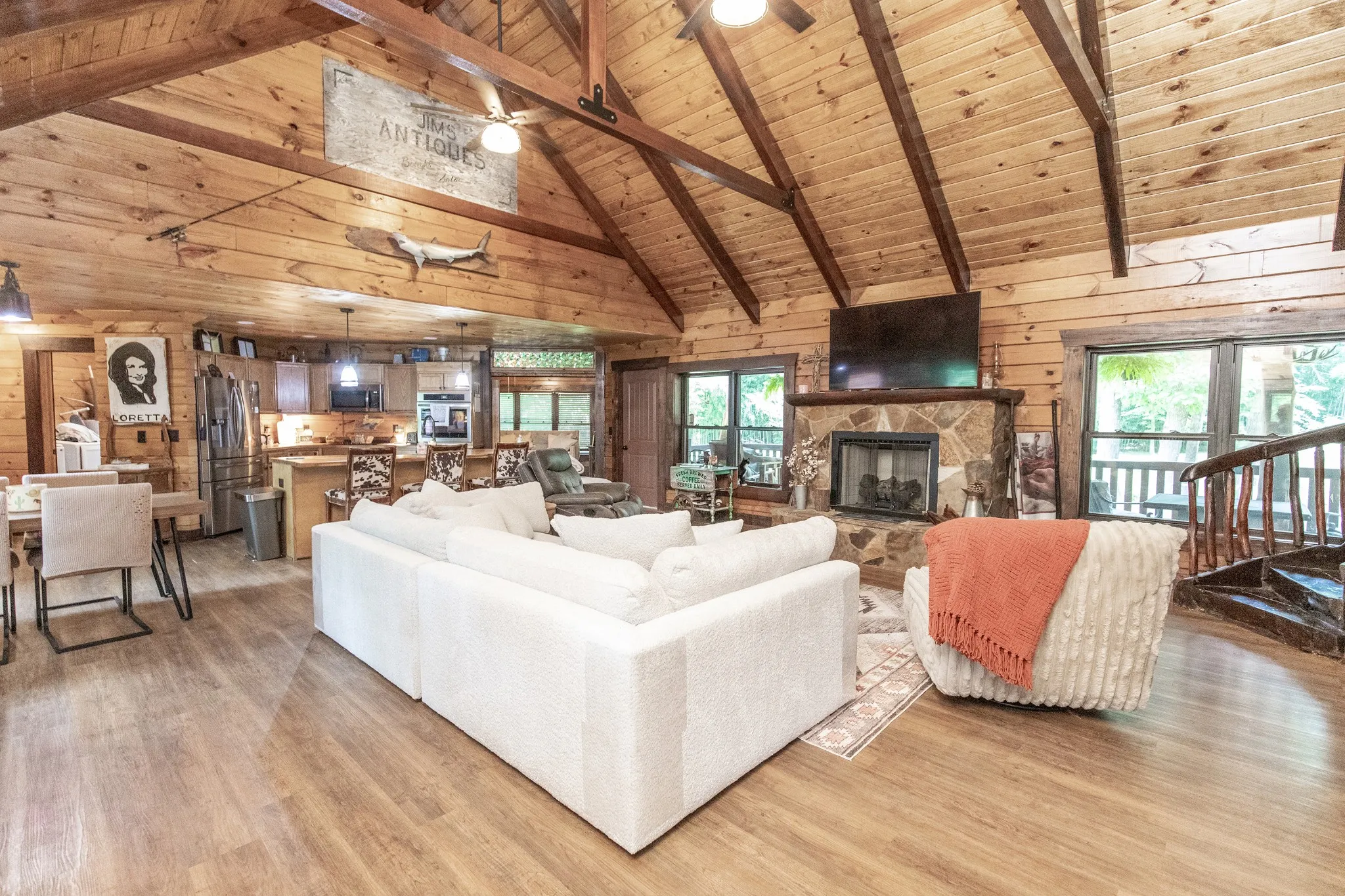 Beautiful custom log home on 3 plus acres. Lot has numerous trees and privacy. Located right out side city limits of White House. Master suite on main level, 2 bdrms, and full bath on second level w/loft area. Loft overlooks open living area. Rock fireplace in living room. Dining room with sliding door (currently used as a den). Spacious kitchen with island and eat-in area . Utility room/pantry off from kitchen. Too many custom features to mention, will have to view in person. 3 deer antler chandeliers, Circle drive. Unbelievable covered back porch overlooking private back yard, perfect fire pit area, 2 car garage. Covered front porch to greet your many guest. The staircase was made from trees from the property. A rare gem of a property! Tons of storage off the bonus room.