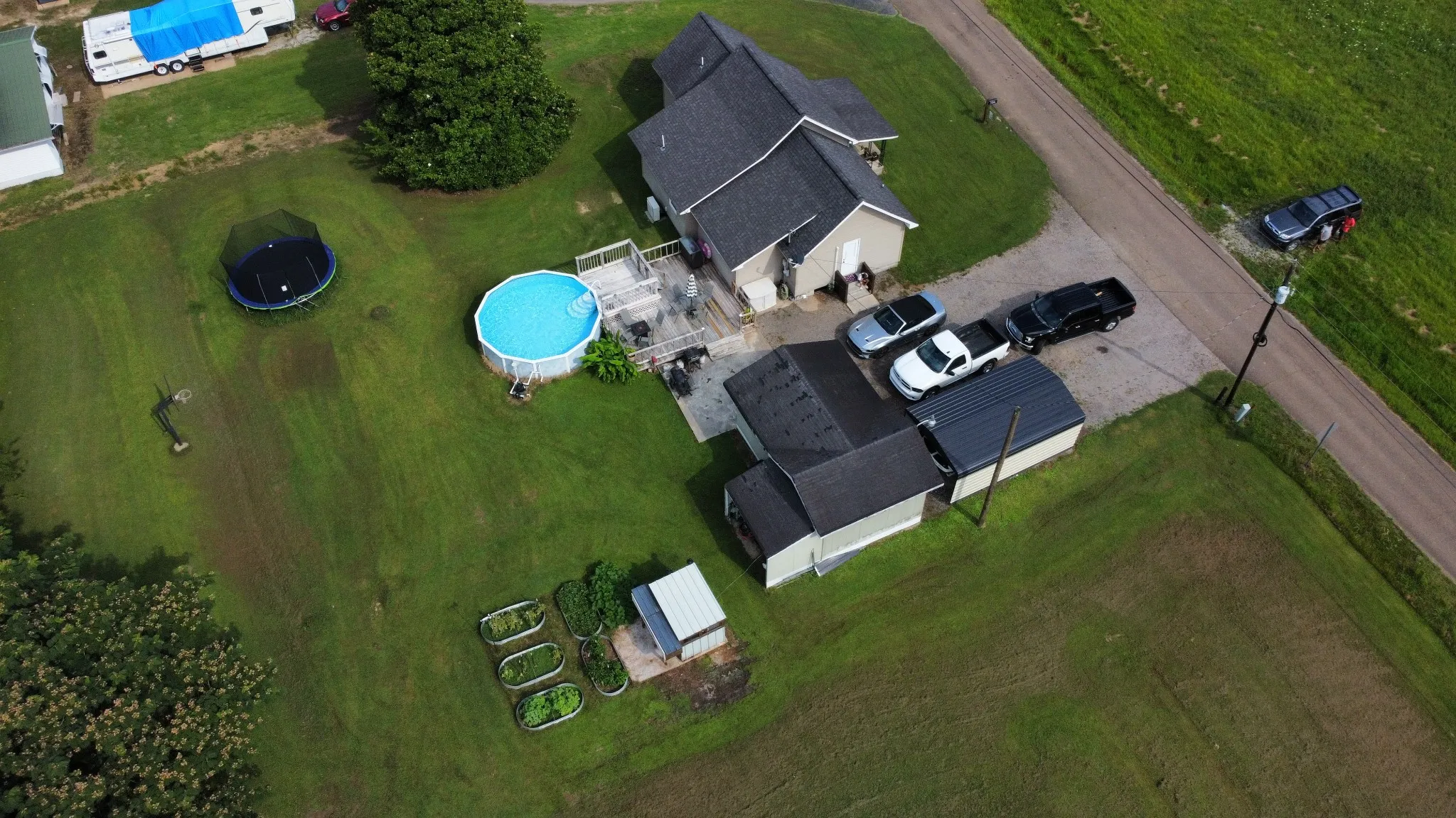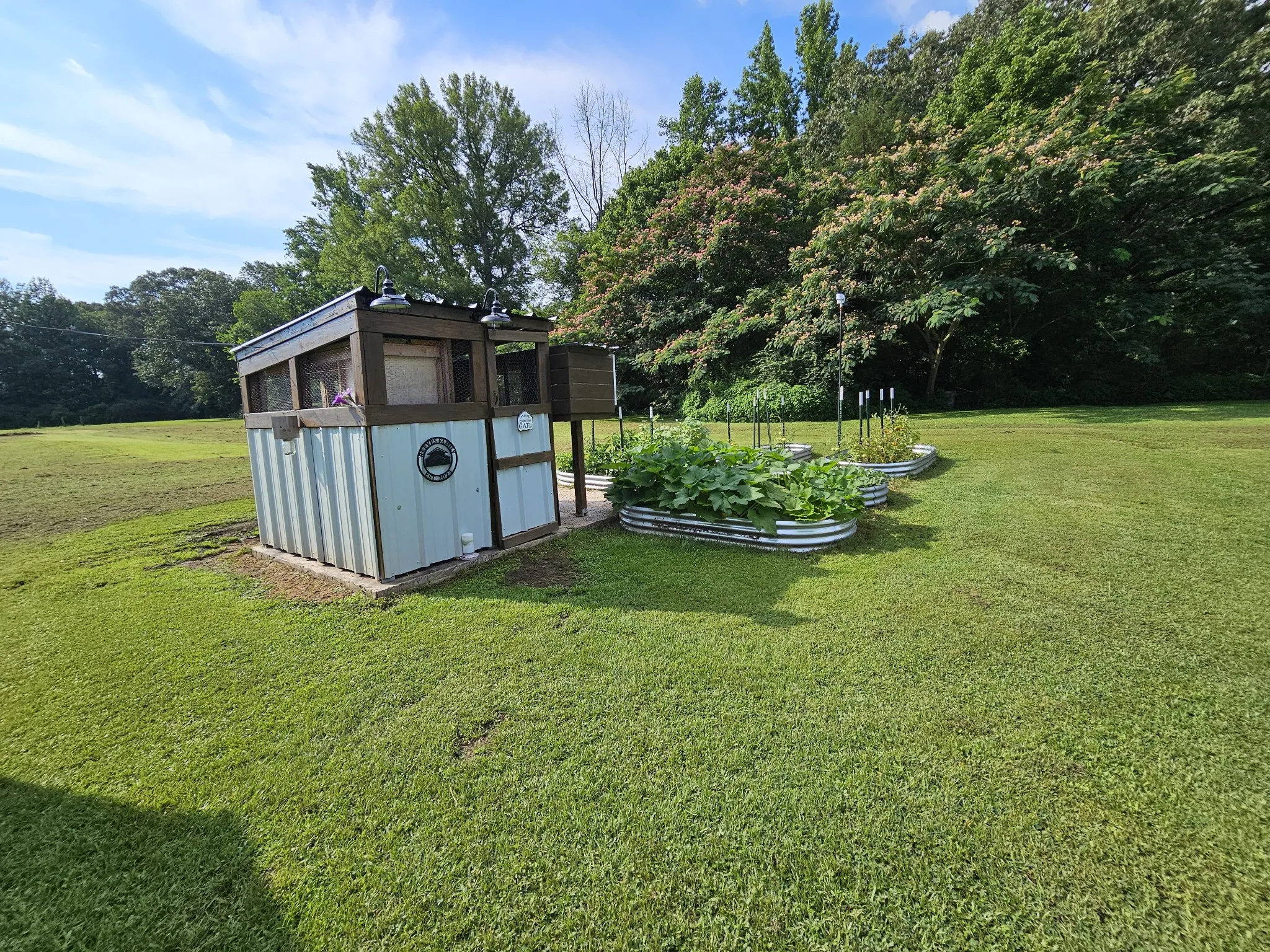 The yard is set up for both relaxation and self-sufficiency with multiple raised garden beds and a chicken coop—all staying with the property.