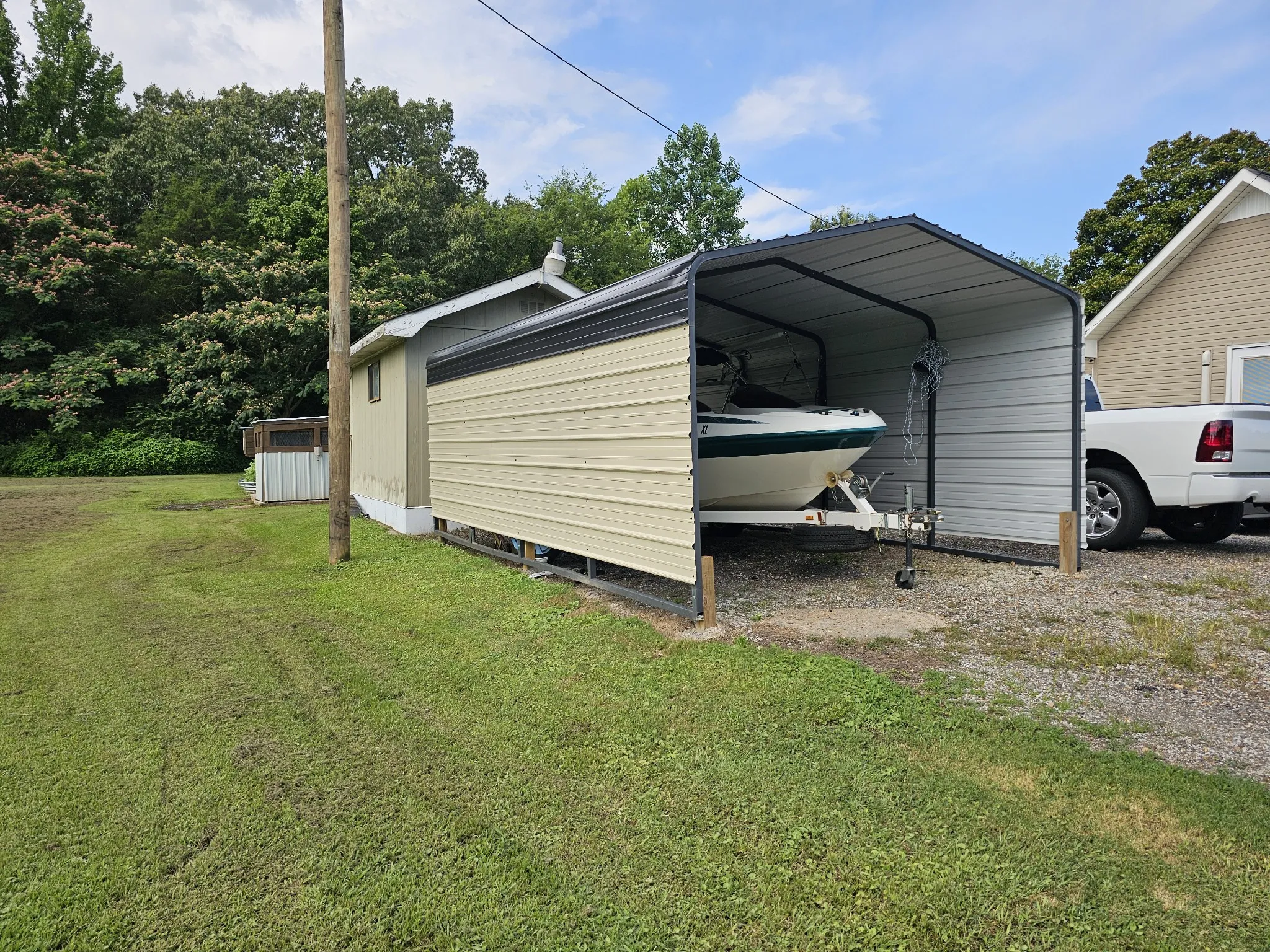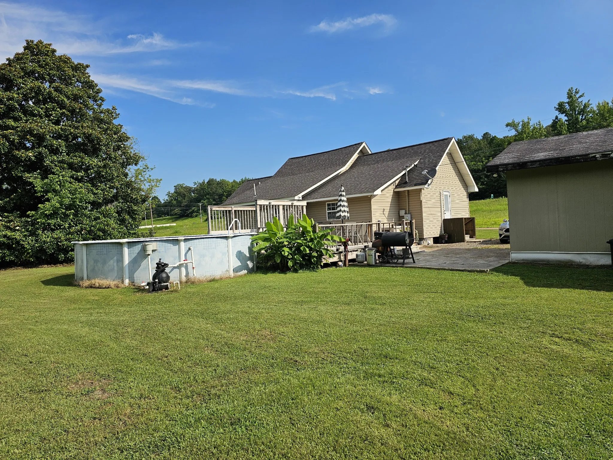 Kitchen appliances include a 2023 stove and dishwasher, 2024 refrigerator, and 2022 washer, dryer, and water heater. Interior was repainted in 2022. Outside, enjoy the 18’ above-ground pool with a back deck, plus a carport for covered parking.