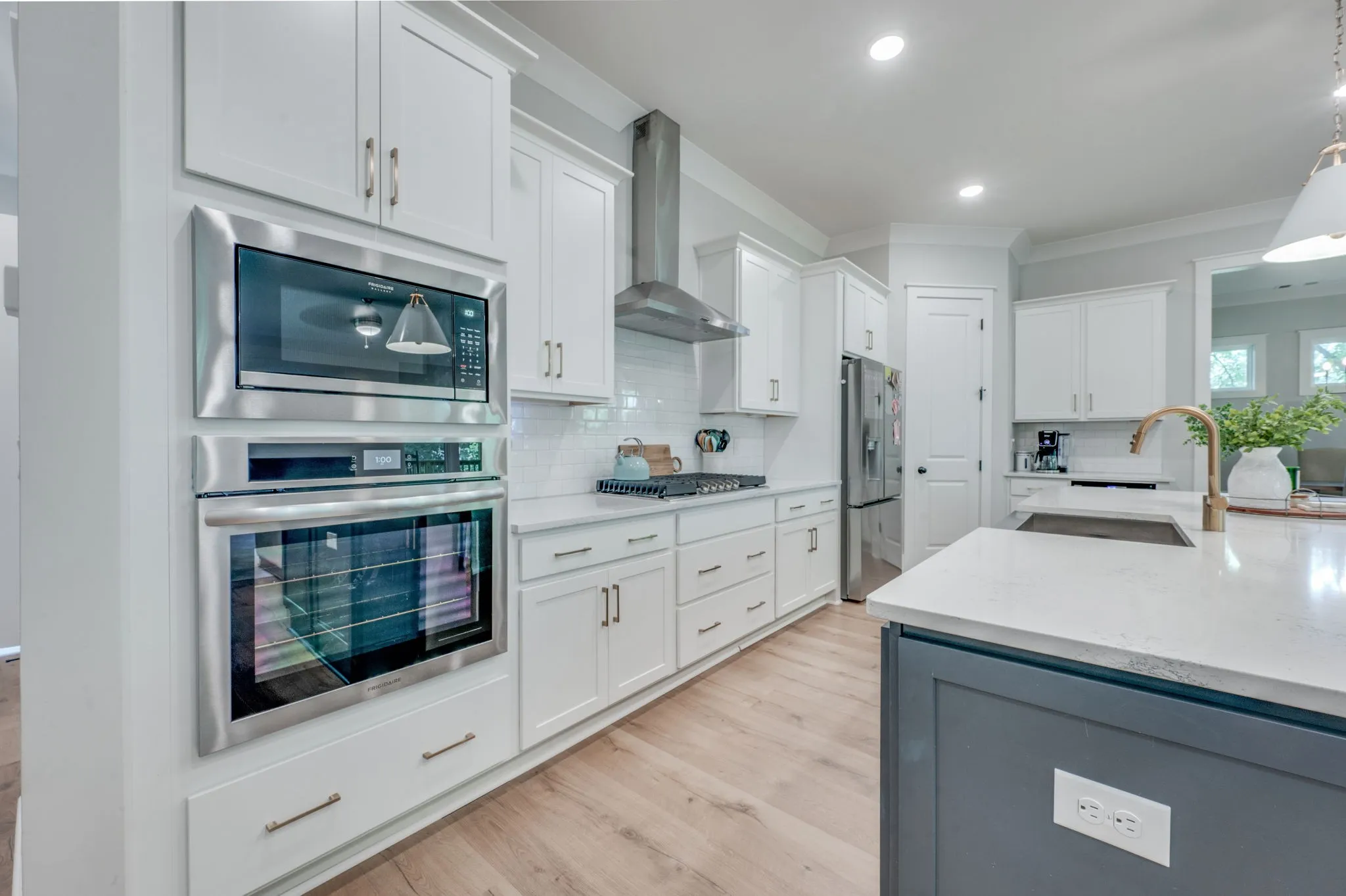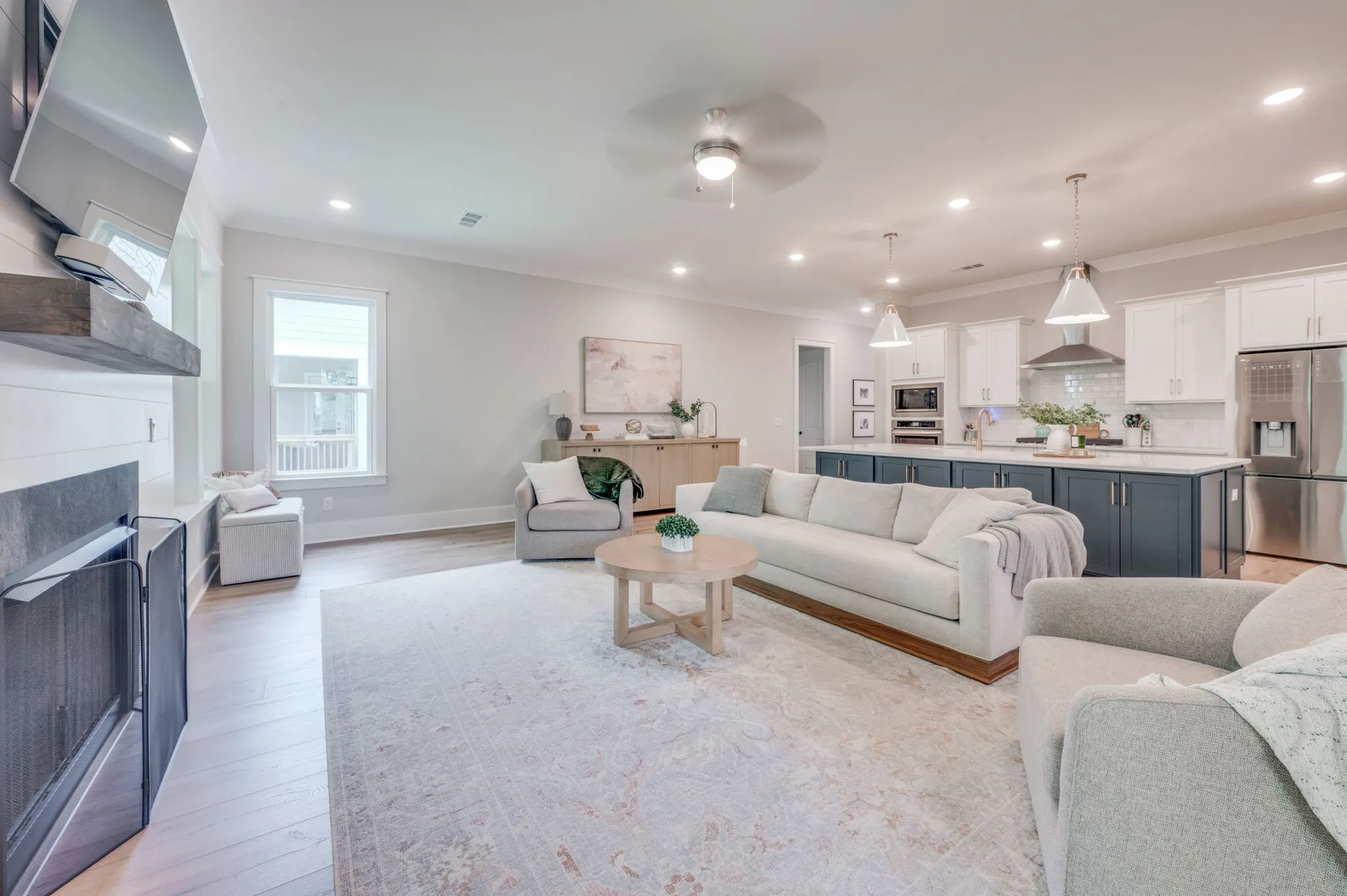 The gourmet kitchen is a showstopper, complete with a gas cooktop, quartz countertops, and upgraded cabinetry with designer hardware. In the living room, a shiplap fireplace with a floating mantle and slate surround adds warmth and character.