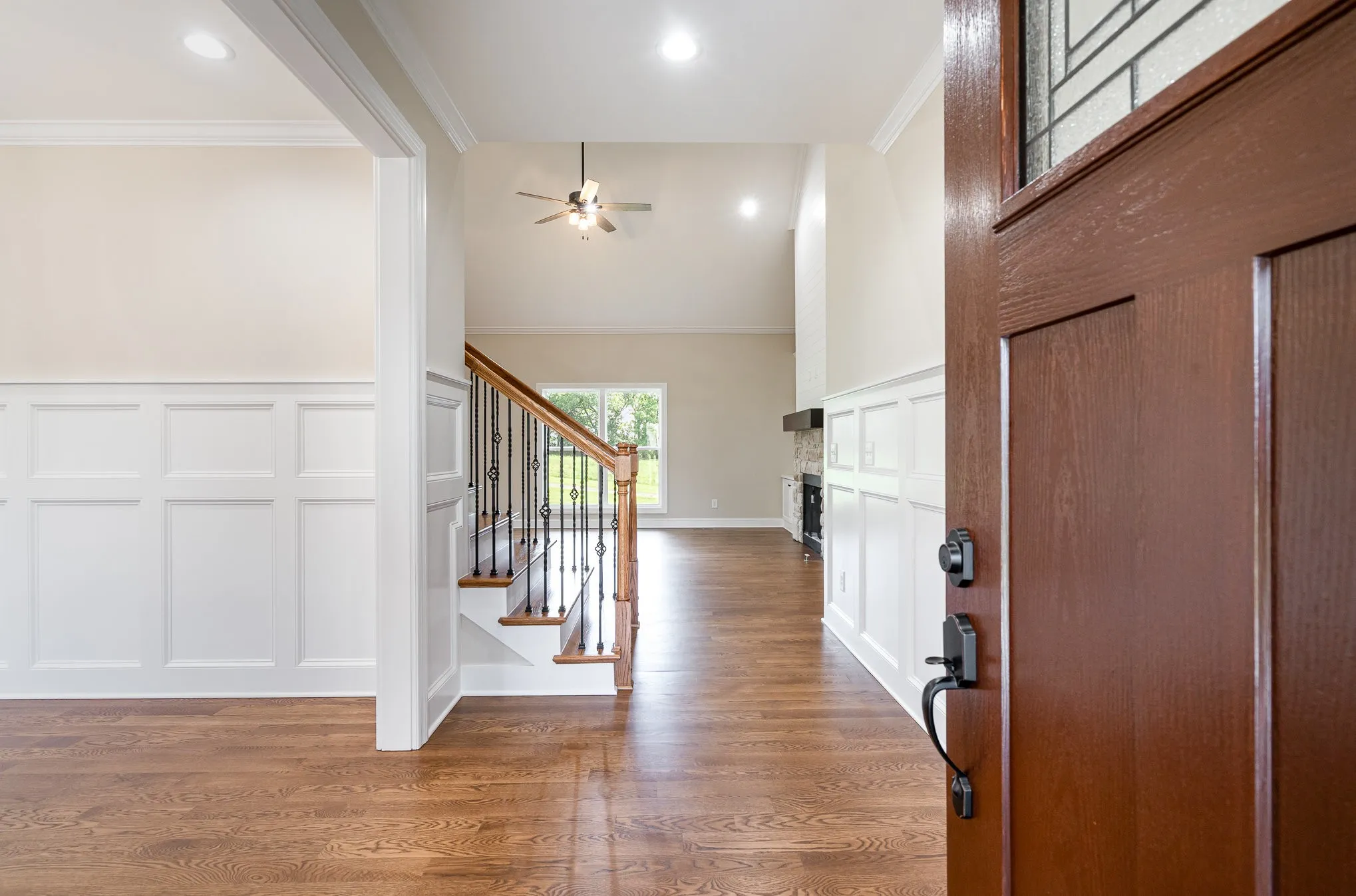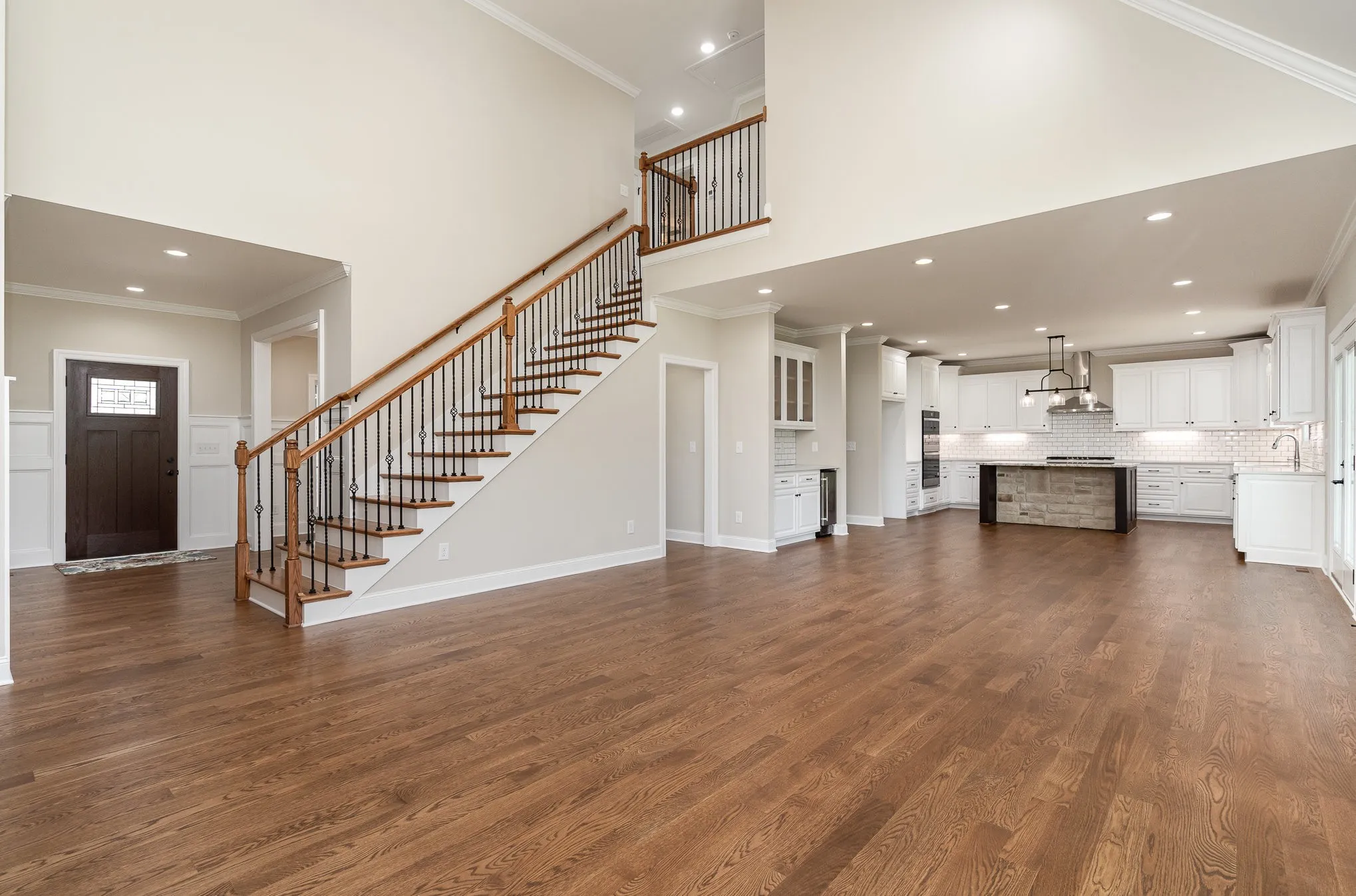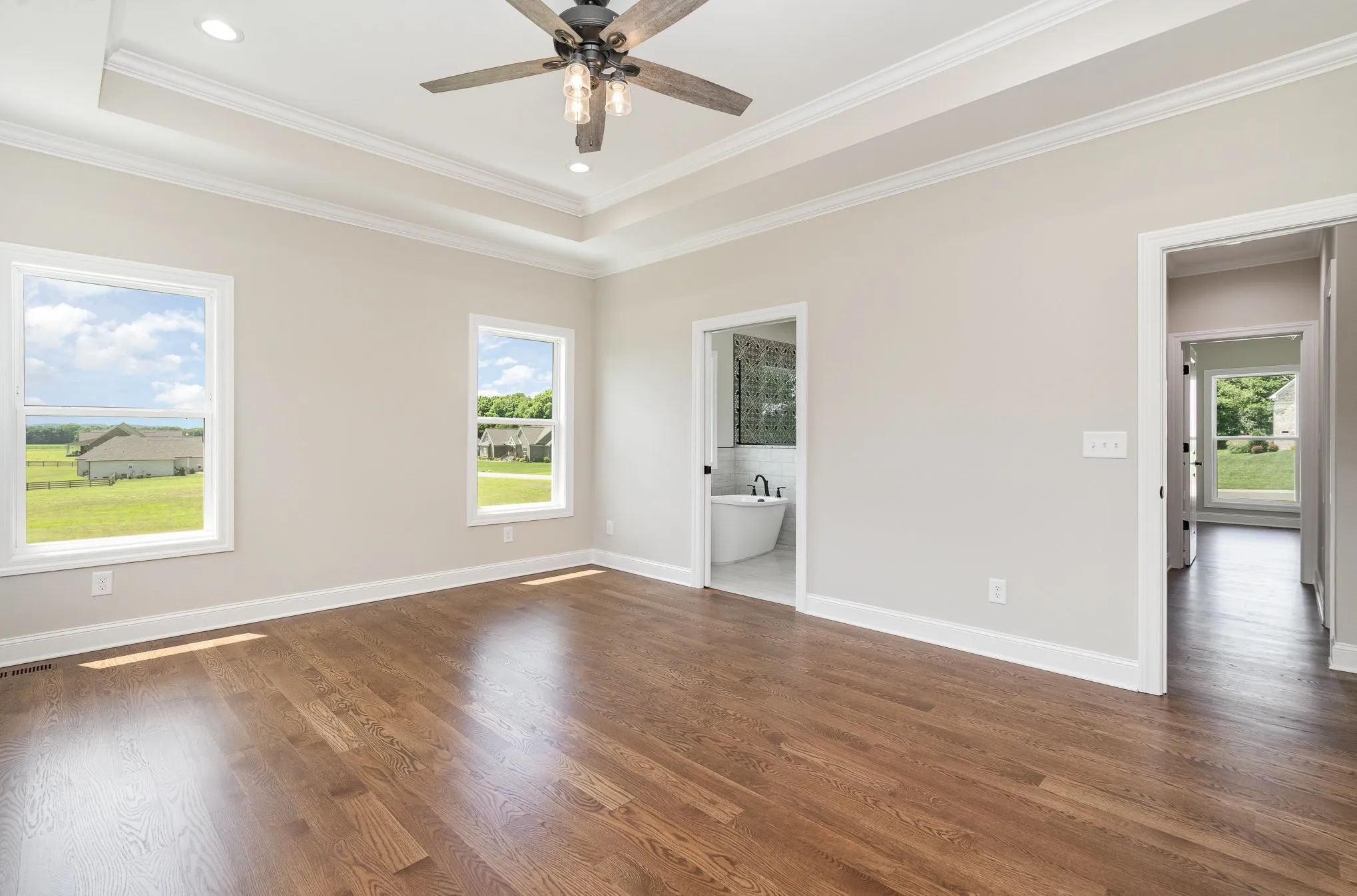 Step inside to gleaming sand-and-finish hardwood floors that flow throughout the main level, complementing the custom cabinetry and open, inviting kitchen—ideal for entertaining or simply enjoying time with family. The main-level master suite is a true retreat, complete with a private spa-inspired bath and a custom walk-in closet designed for maximum organization and style.