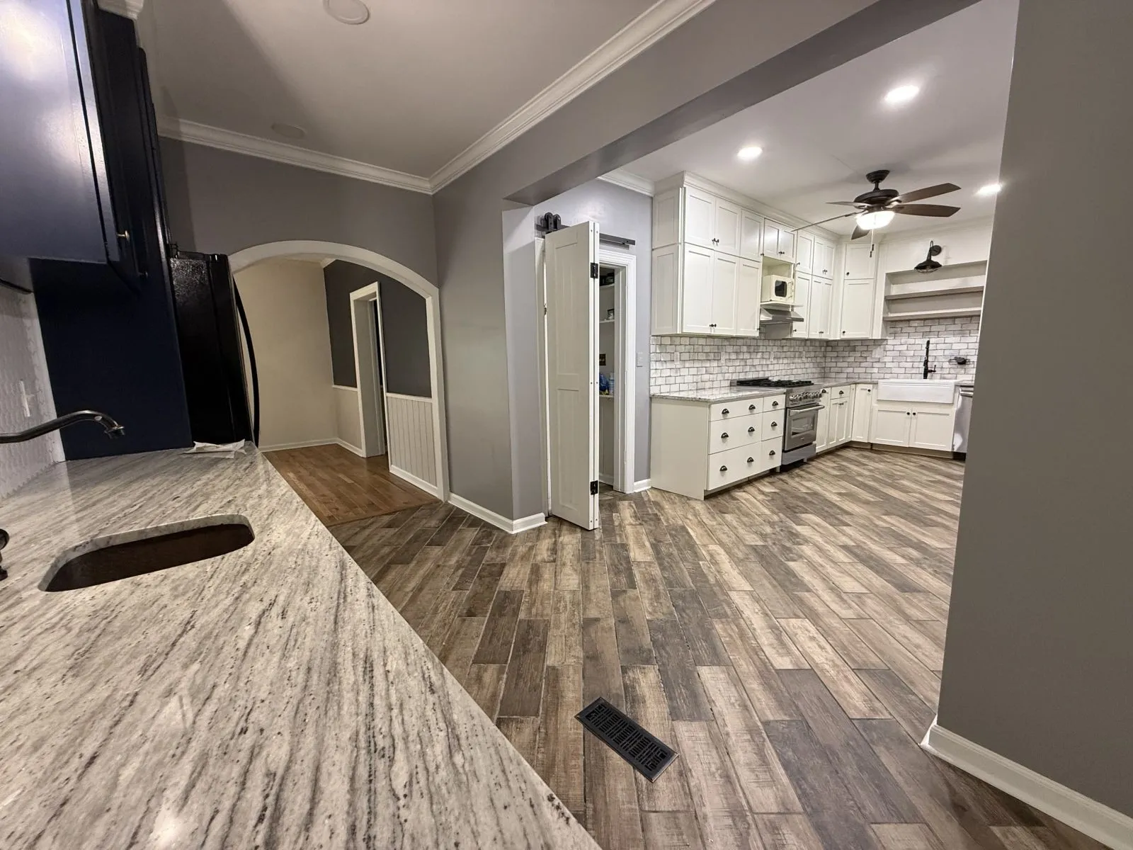 Newly remodeled home on the doorsteps of Abbo’s Alley in the heart of Sewanee! First floor has a spacious living area with a gas fireplace and stunning windows; a half bath, a large dining room with floor-to-ceiling built in shelves; a renovated kitchen with granite countertops, wooden cabinets, tile flooring, stainless appliances, walk-in pantry, and a large bar area; and an oversize master suite that has a wood burning fireplace and a recently updated charming master