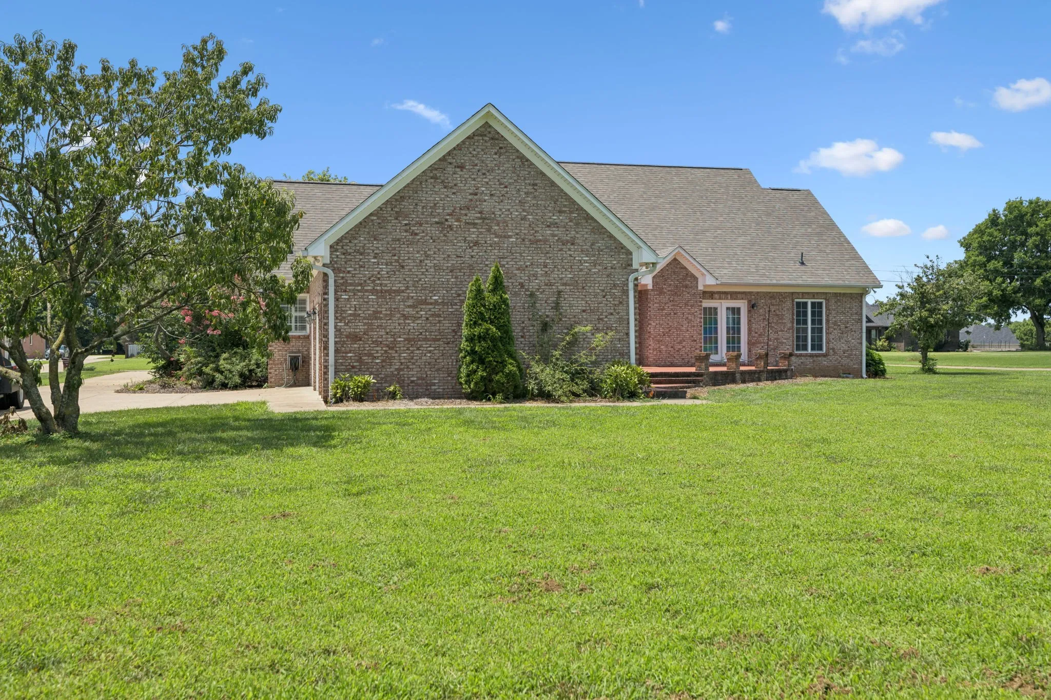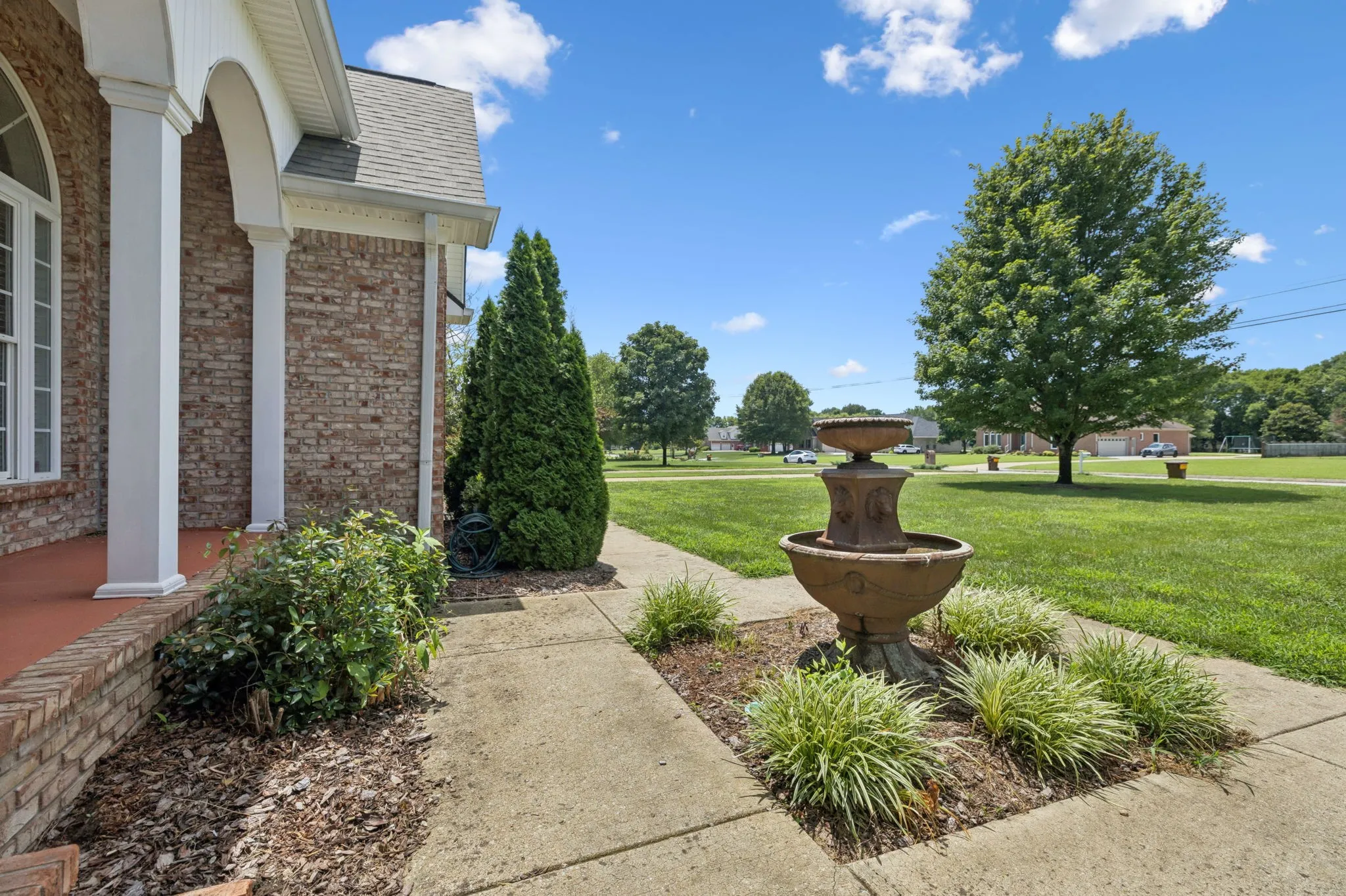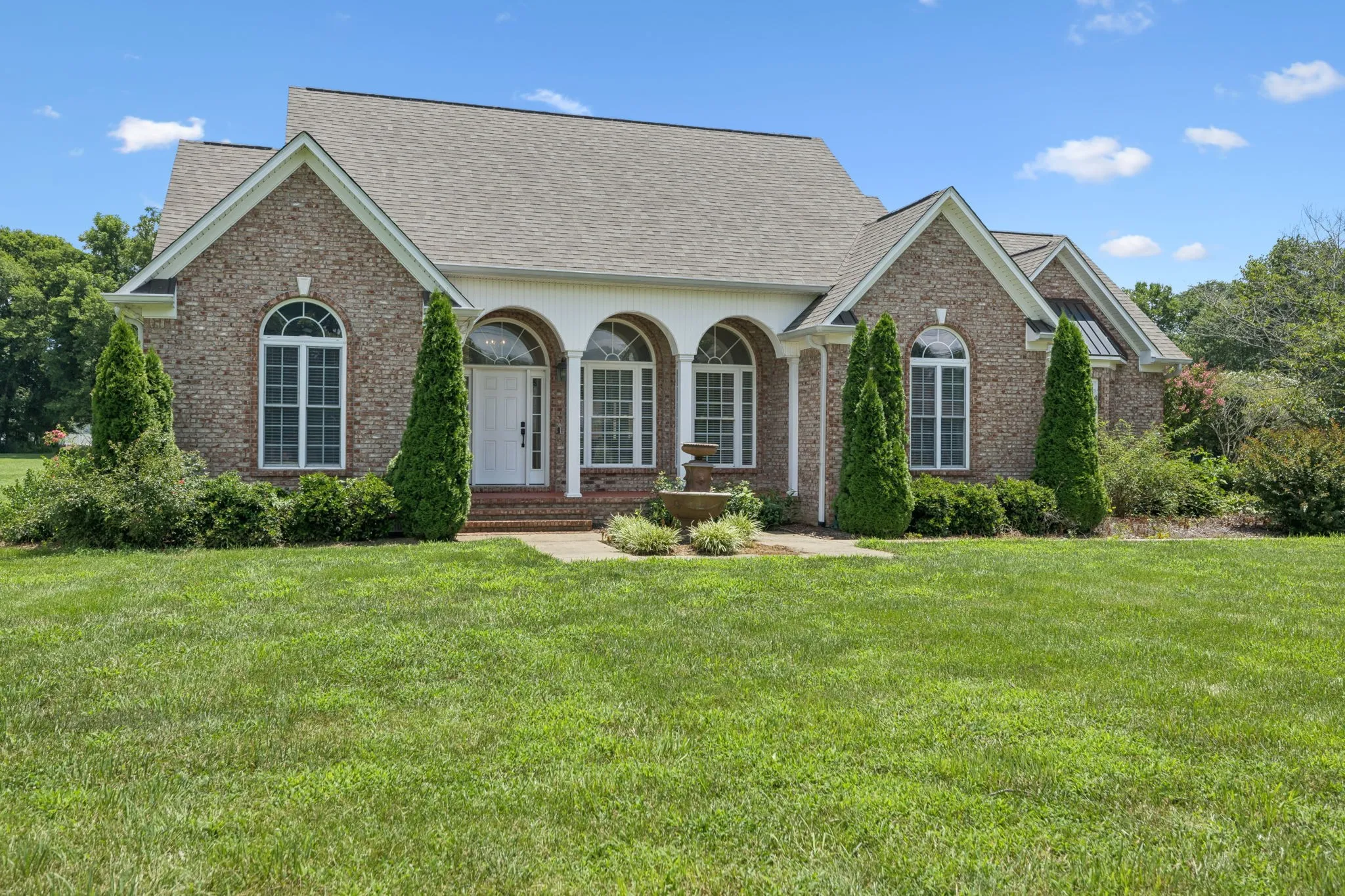 Price Improvement! This stunning all-brick, one-level home is set on a generous and level 1.25-acre lot, offering a peaceful and picturesque setting to enjoy every day. A charming fountain and arched front porch welcome you inside, where a spacious foyer opens into the living room featuring a vaulted ceiling, cozy fireplace, and double windowed doors that lead to the back patio and expansive backyard.