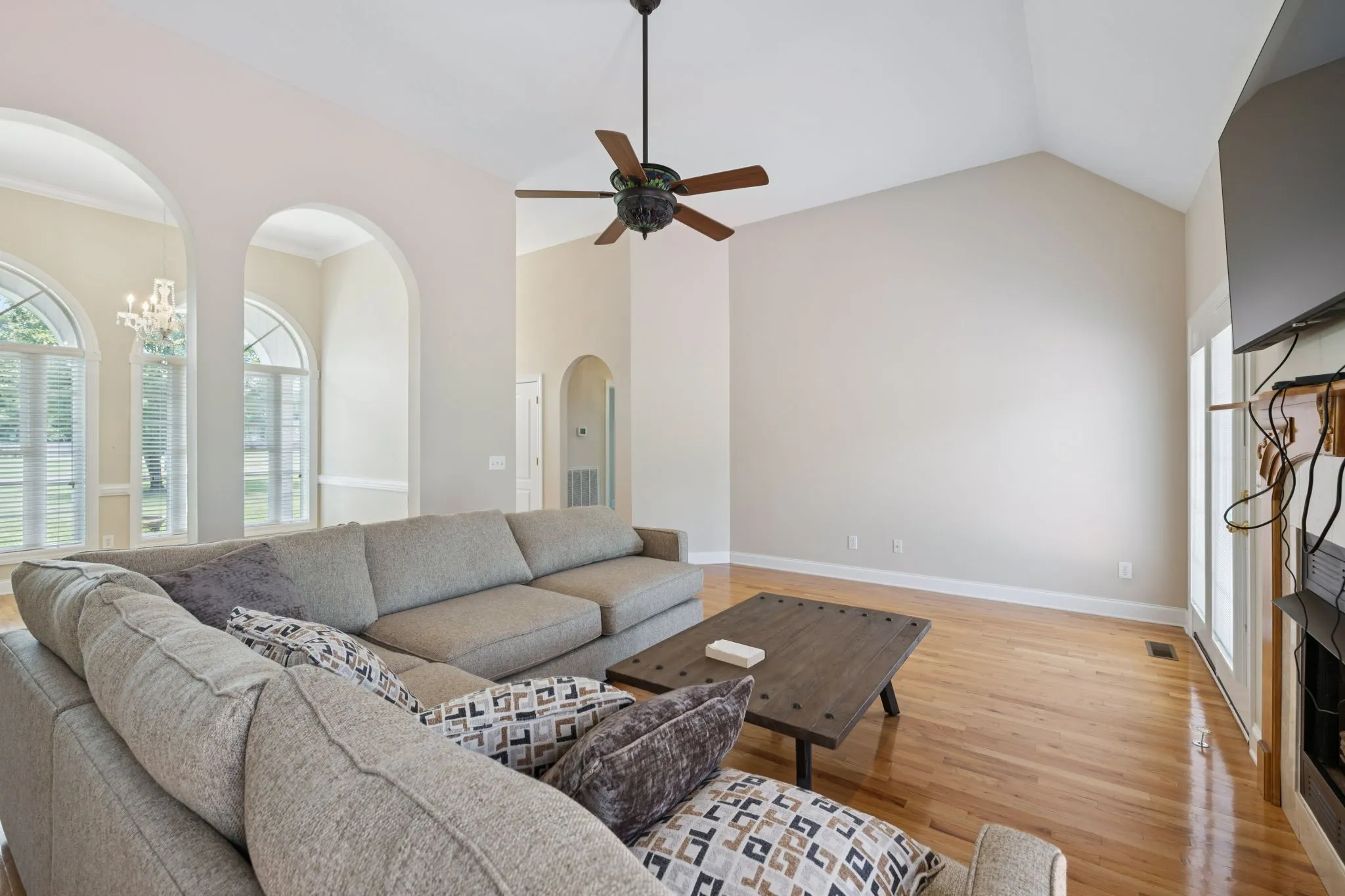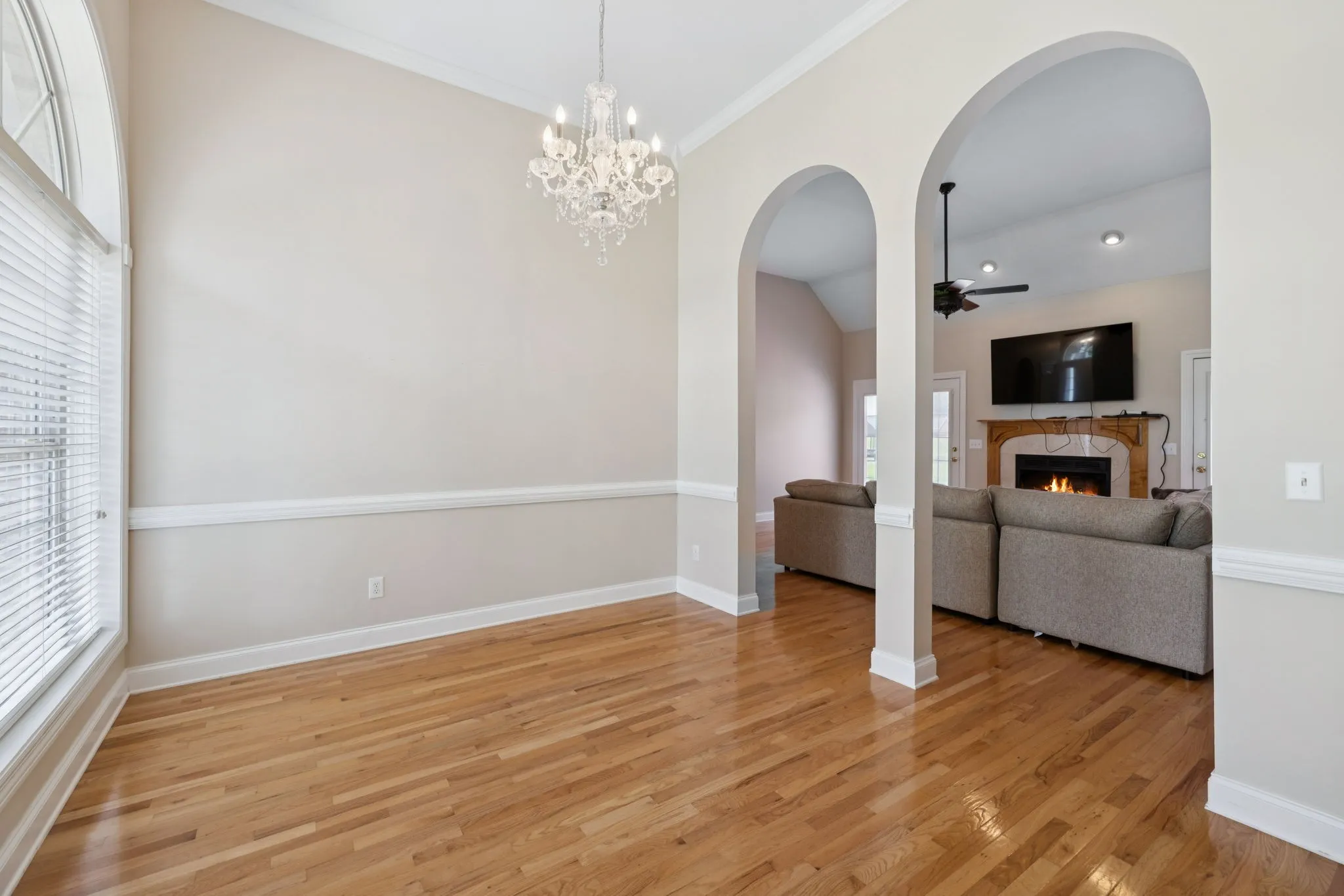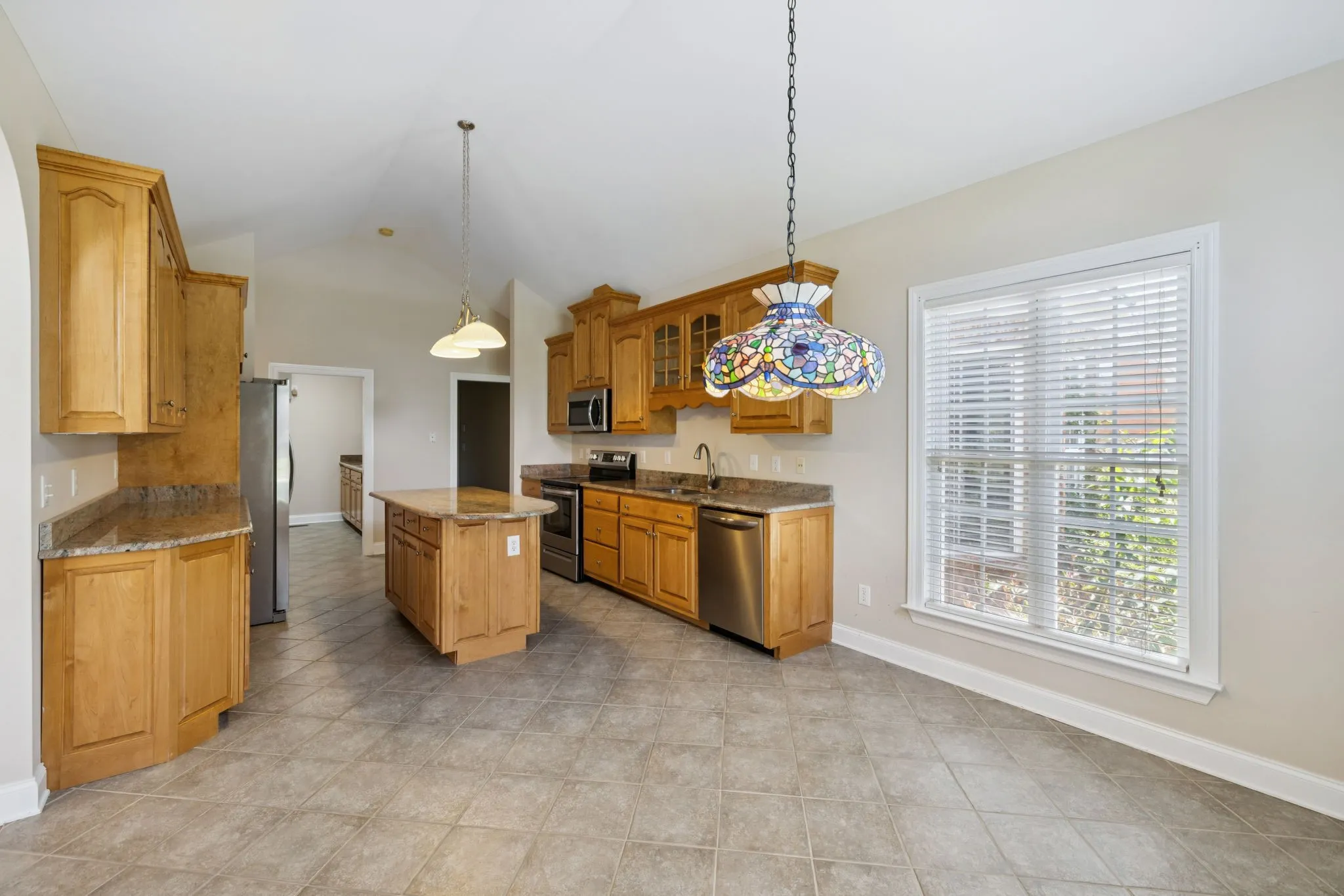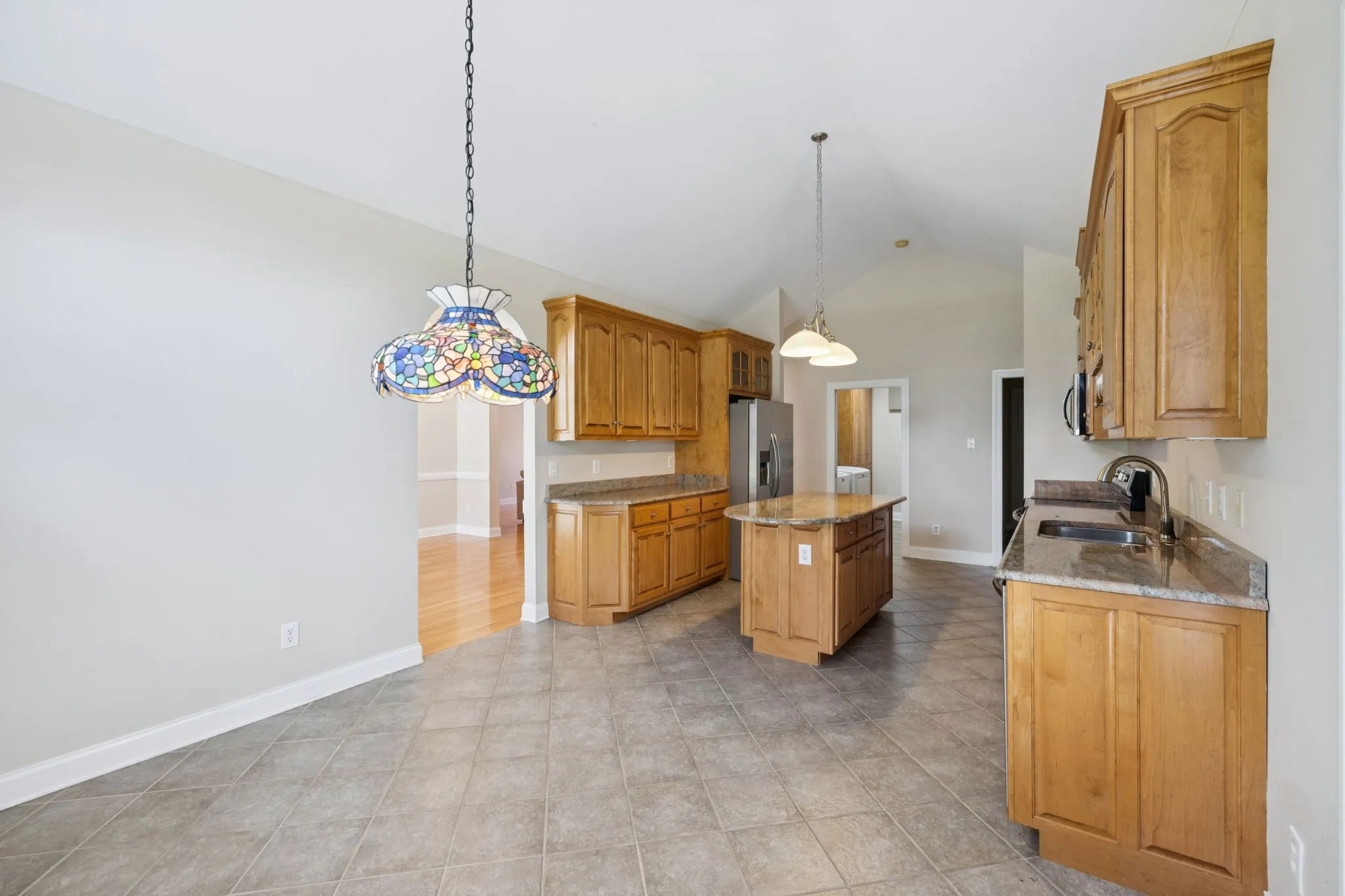 Elegant architectural details continue in the formal dining room, highlighted by arched openings and a beautiful chandelier. The kitchen offers both space and function, with stainless steel appliances, granite countertops, vaulted ceilings, and ample cabinetry. A separate laundry room includes a utility sink and extra storage.