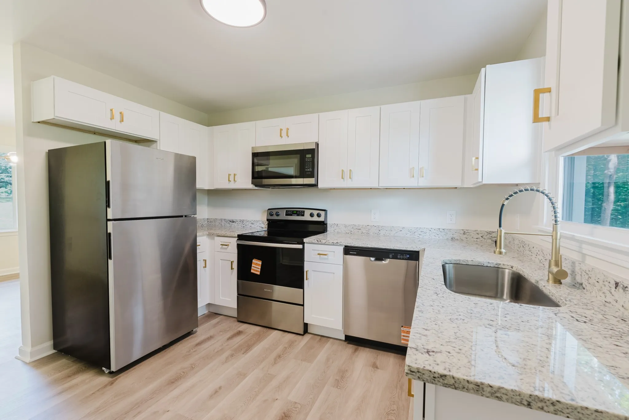 Step inside and be greeted by all-new flooring and lighting throughout, creating a warm, cohesive flow from room to room. The fully updated kitchen is a showstopper, featuring bright new white cabinetry, new countertops, new stainless steel appliances, and elegant gold-tone fixtures and hardware—a fresh, modern design that’s as functional as it is stylish.