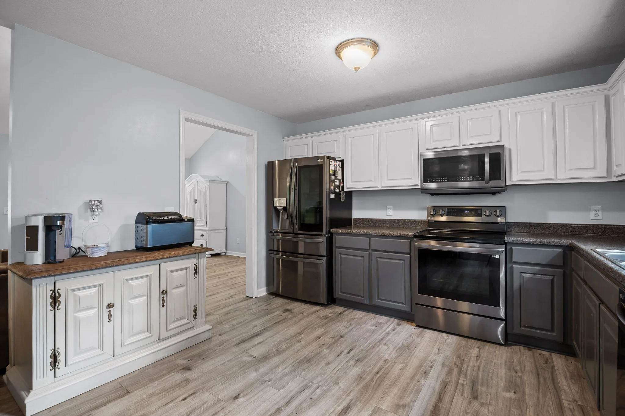 Step inside to soaring ceilings and a fresh, modern feel throughout. The cozy living room flows seamlessly into a spacious kitchen featuring ample cabinet space, a pantry, and room for gathering — perfect for everyday living and entertaining. The home features a desirable split-bedroom layout, with the private primary suite offering its own full bathroom. Two additional generously sized bedrooms and a dedicated laundry room round out the main level.