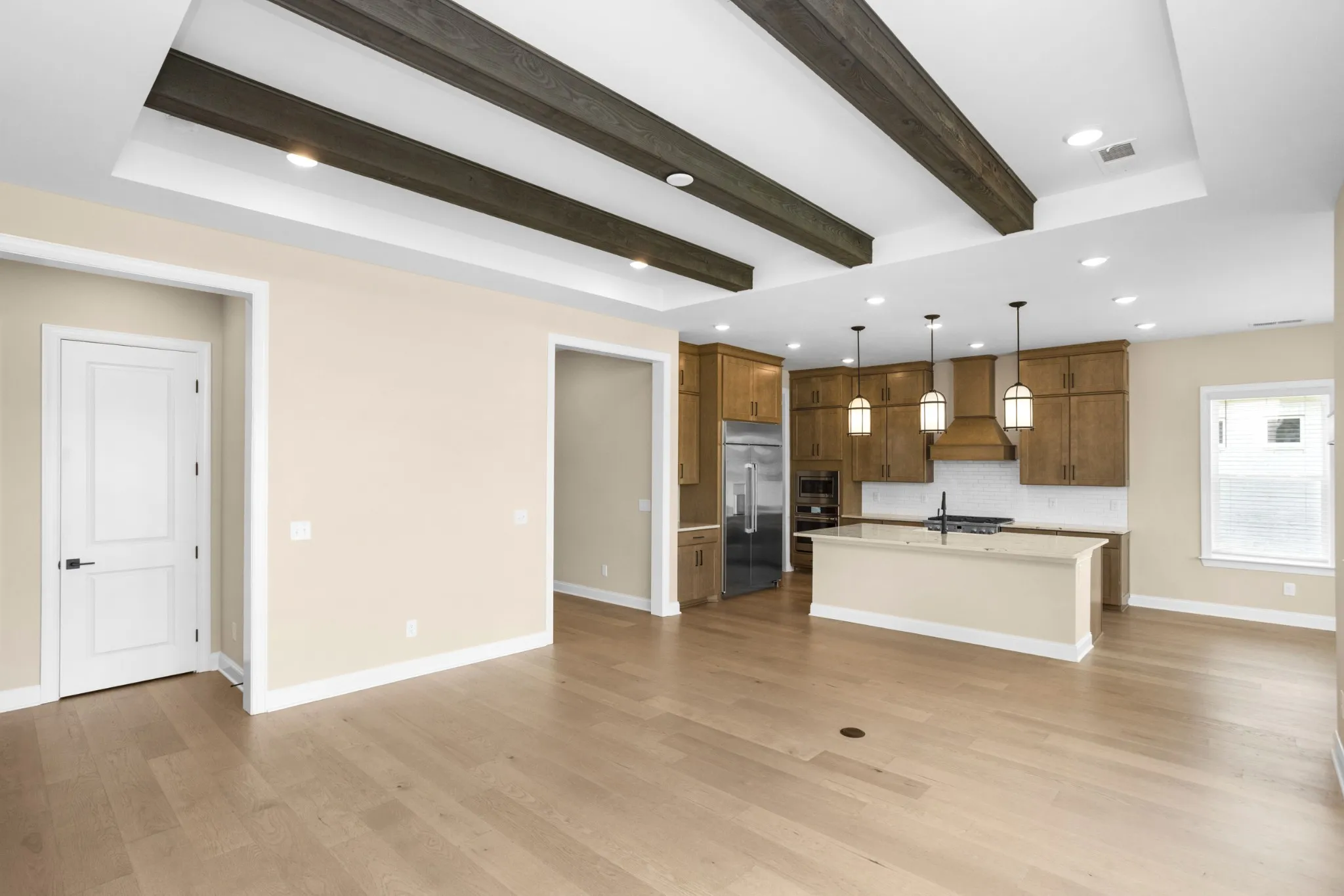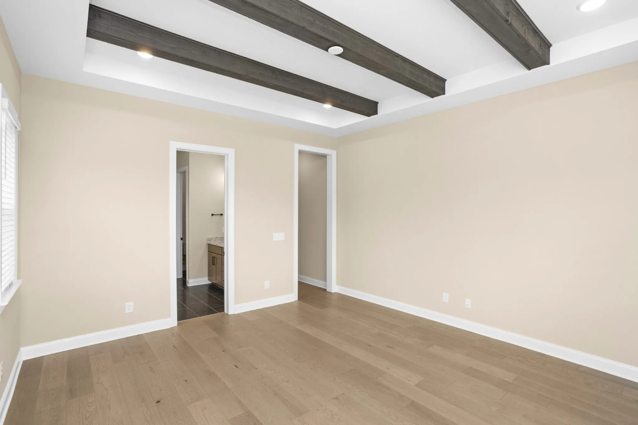 The main-floor primary suite is a luxurious retreat, featuring a beamed ceiling, a walk-in closet, and a deluxe spa-like bathroom with dual sinks, a soaking tub, and a walk-in shower.