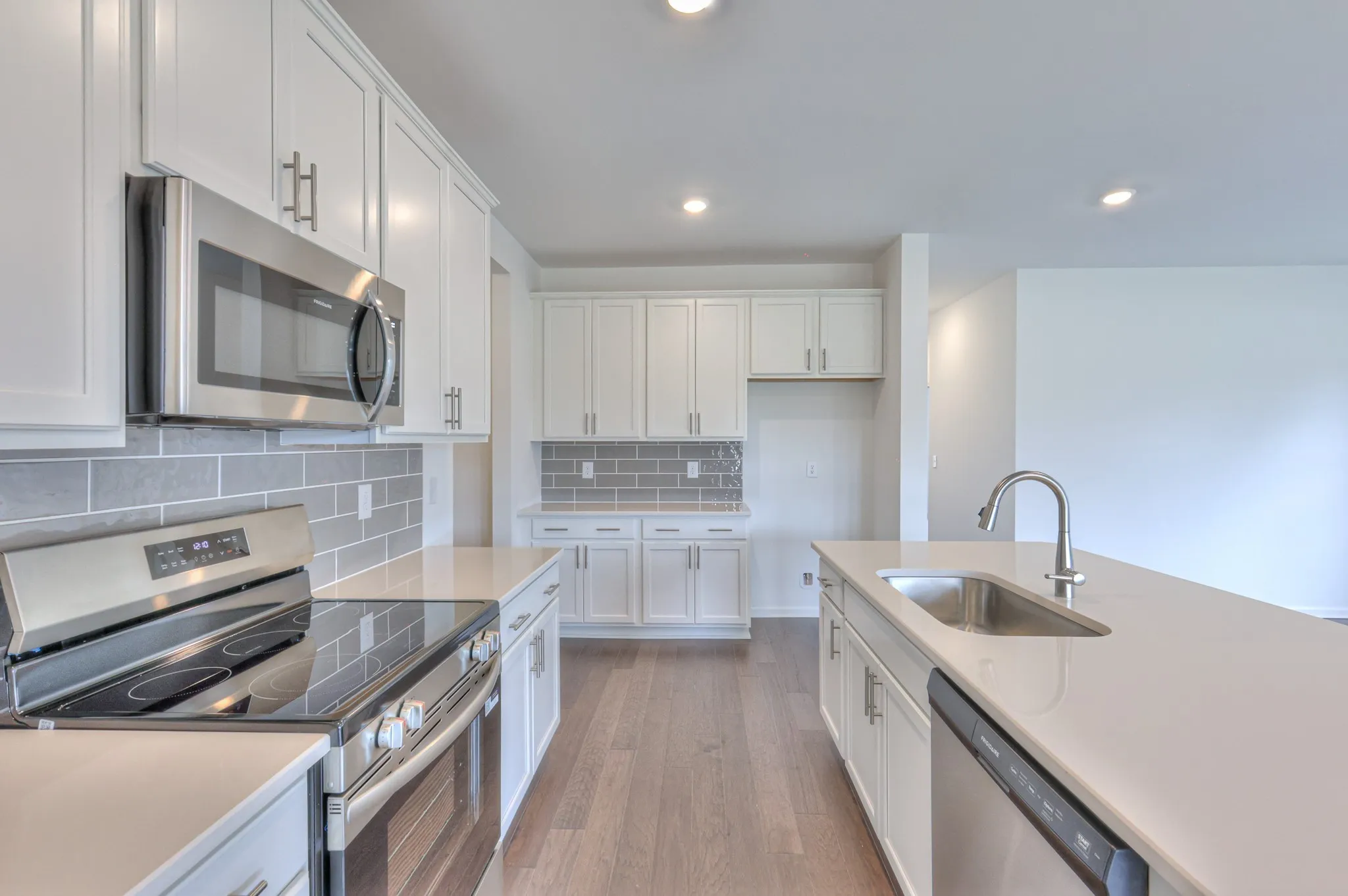 A bright kitchen with upgraded cabinets, countertops, and tile backsplash