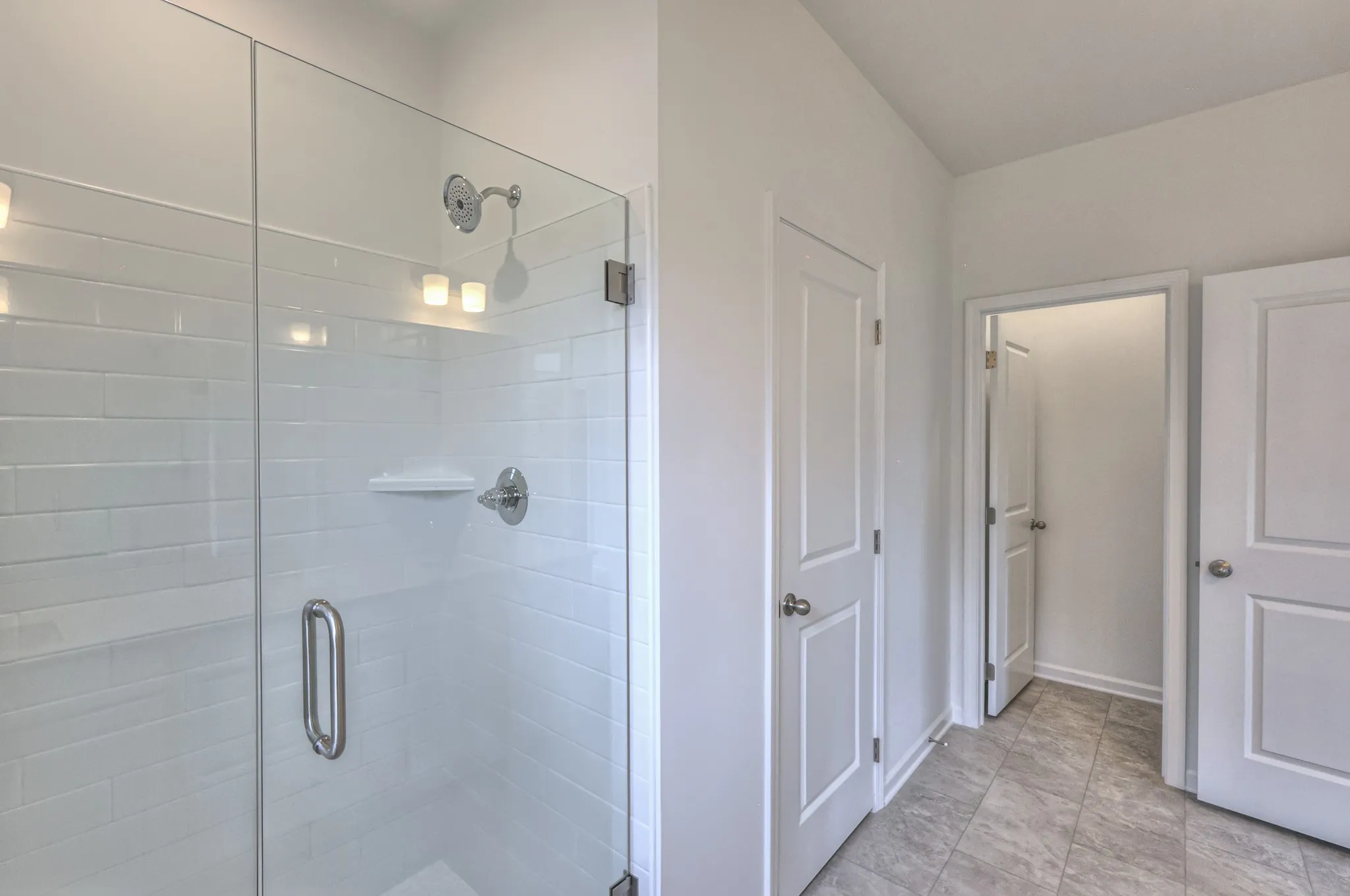 Hardwood stairs and a tile shower in the owner’s suite