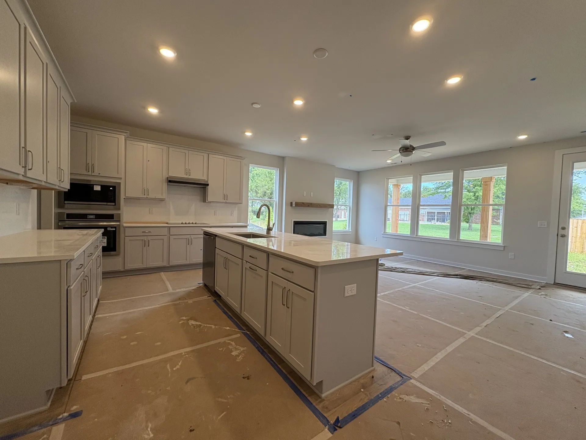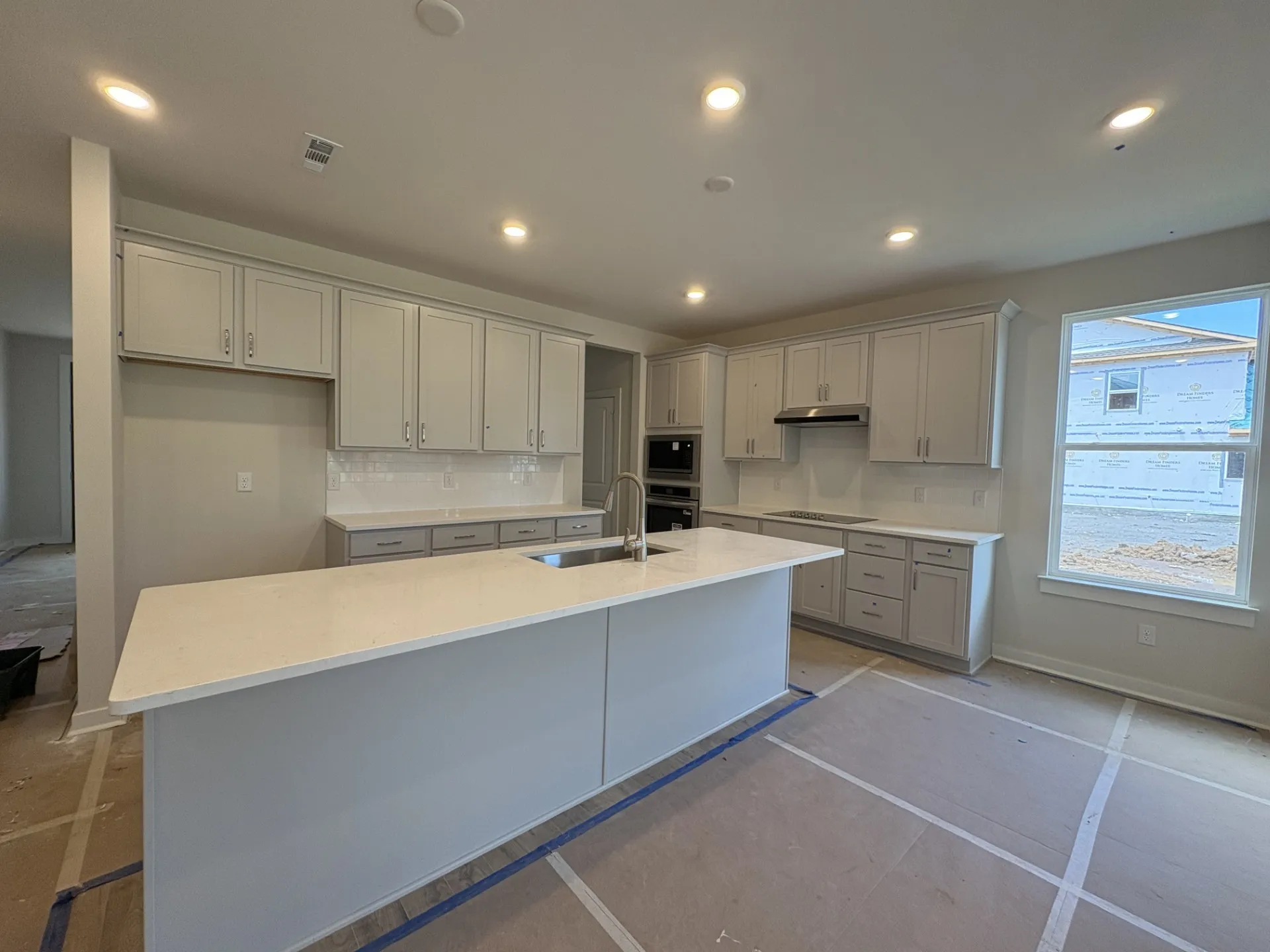 The gourmet kitchen is the heart of the home, featuring a HUGE ISLAND perfect for entertaining, QUARTZ countertops, shaker-style cabinets, a classic tile backsplash, under-cabinet lighting, and a double trash pull-out.