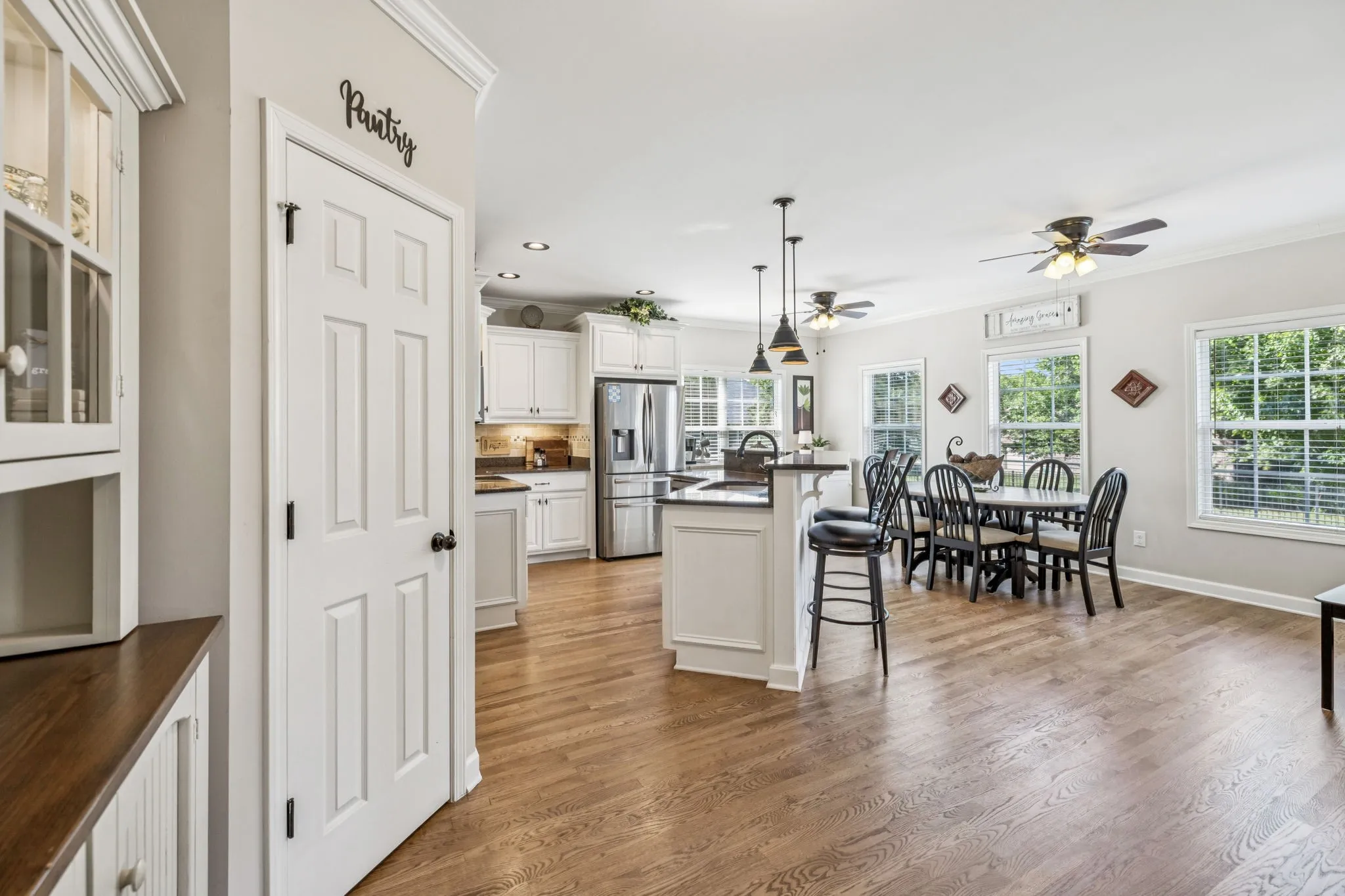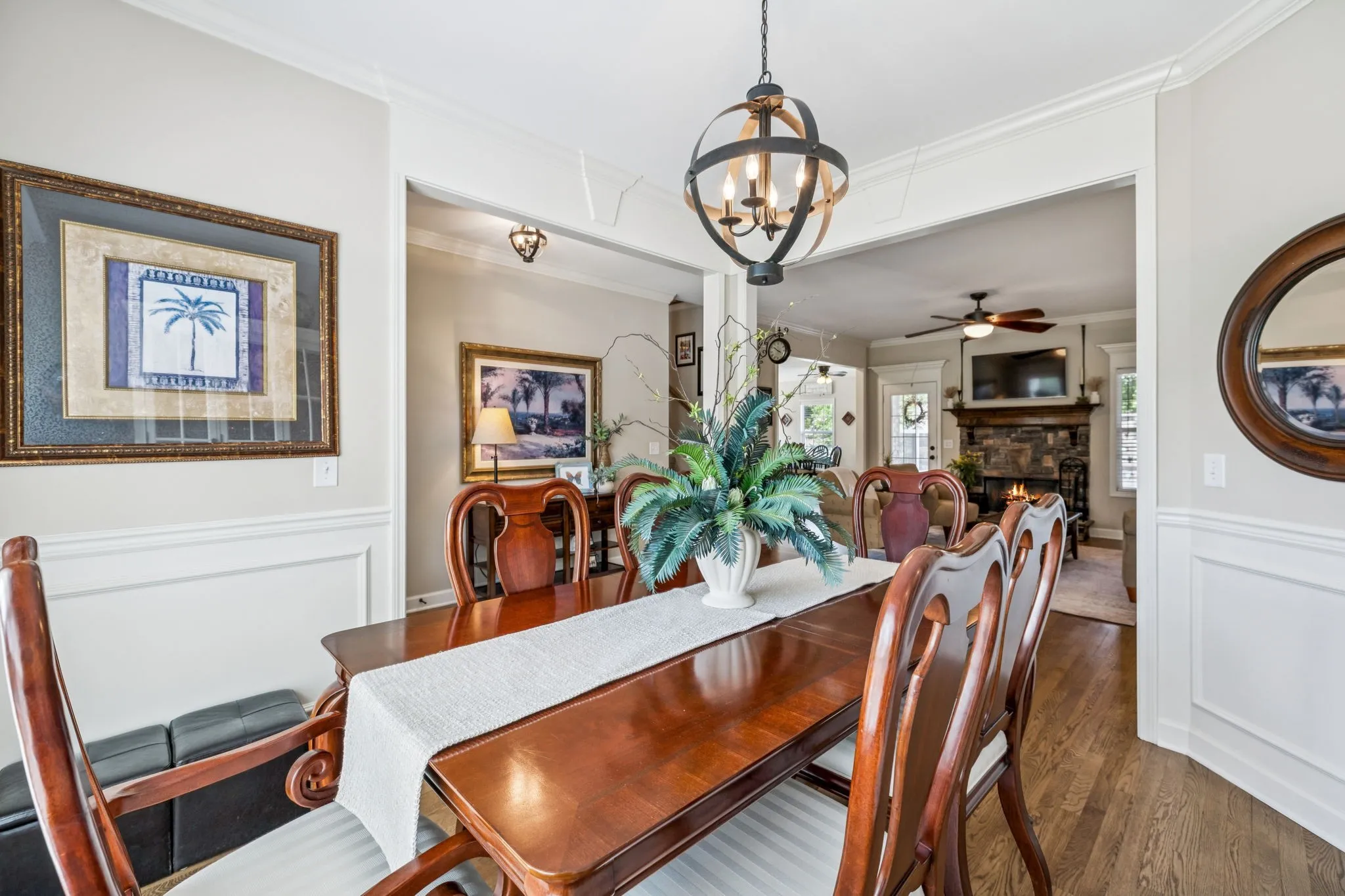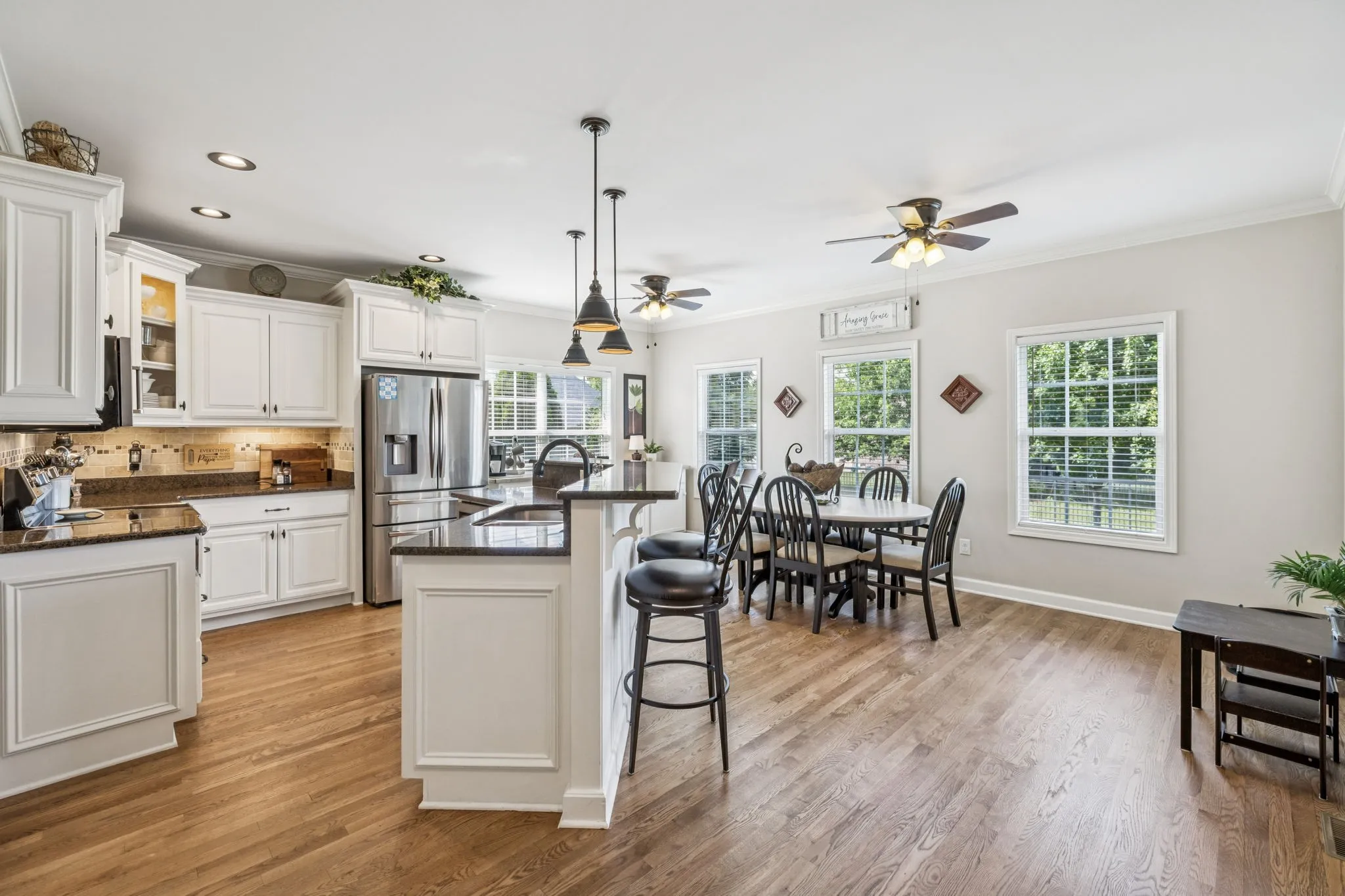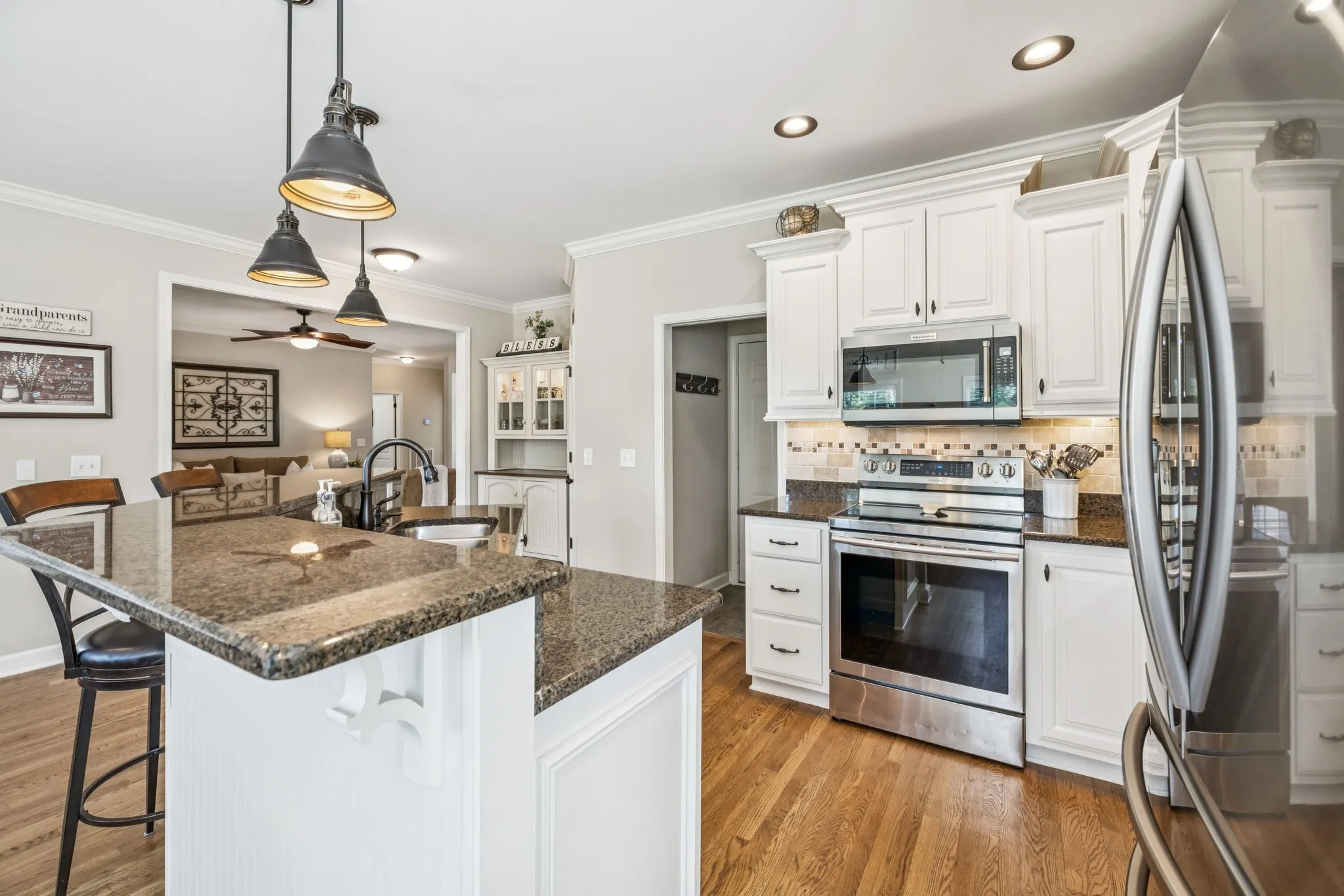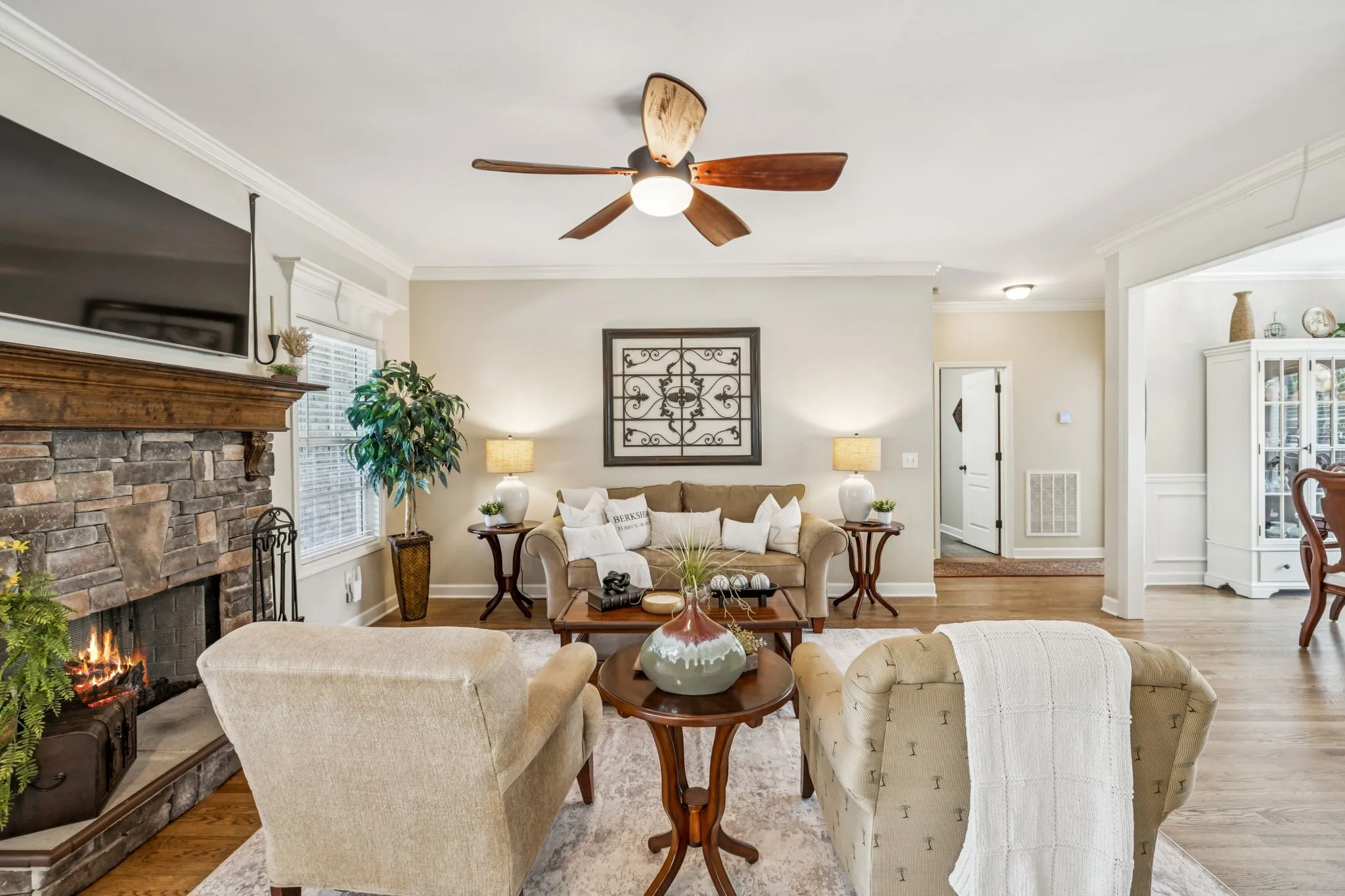 Step into a bright, open floor plan featuring refinished hardwood floors (2025), a cozy stone fireplace, and seamless flow between the living, dining, and kitchen areas. The kitchen boasts custom cabinetry, modern pendant and under-cabinet lighting, and updated appliances—including the stove, refrigerator, microwave, and dishwasher.