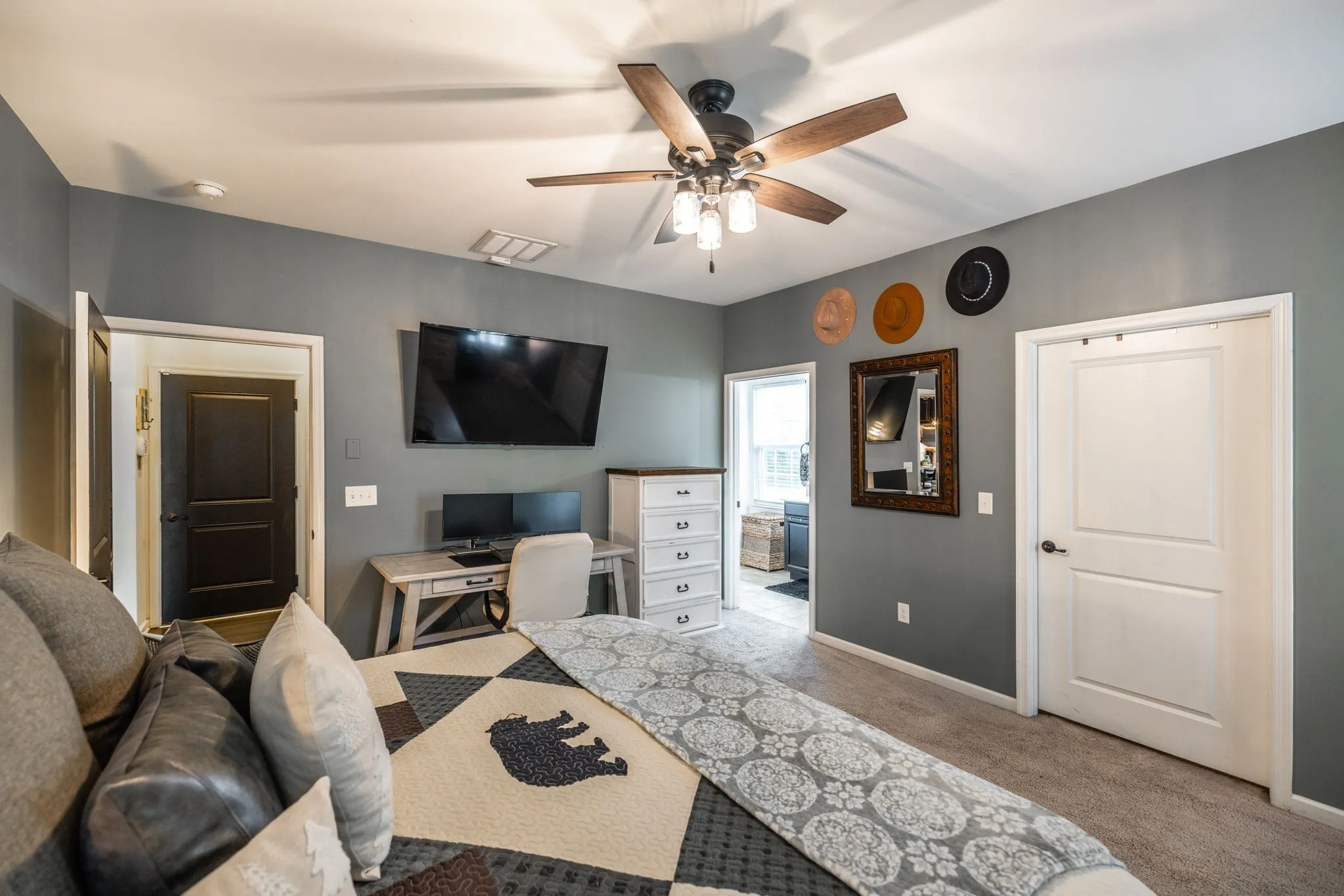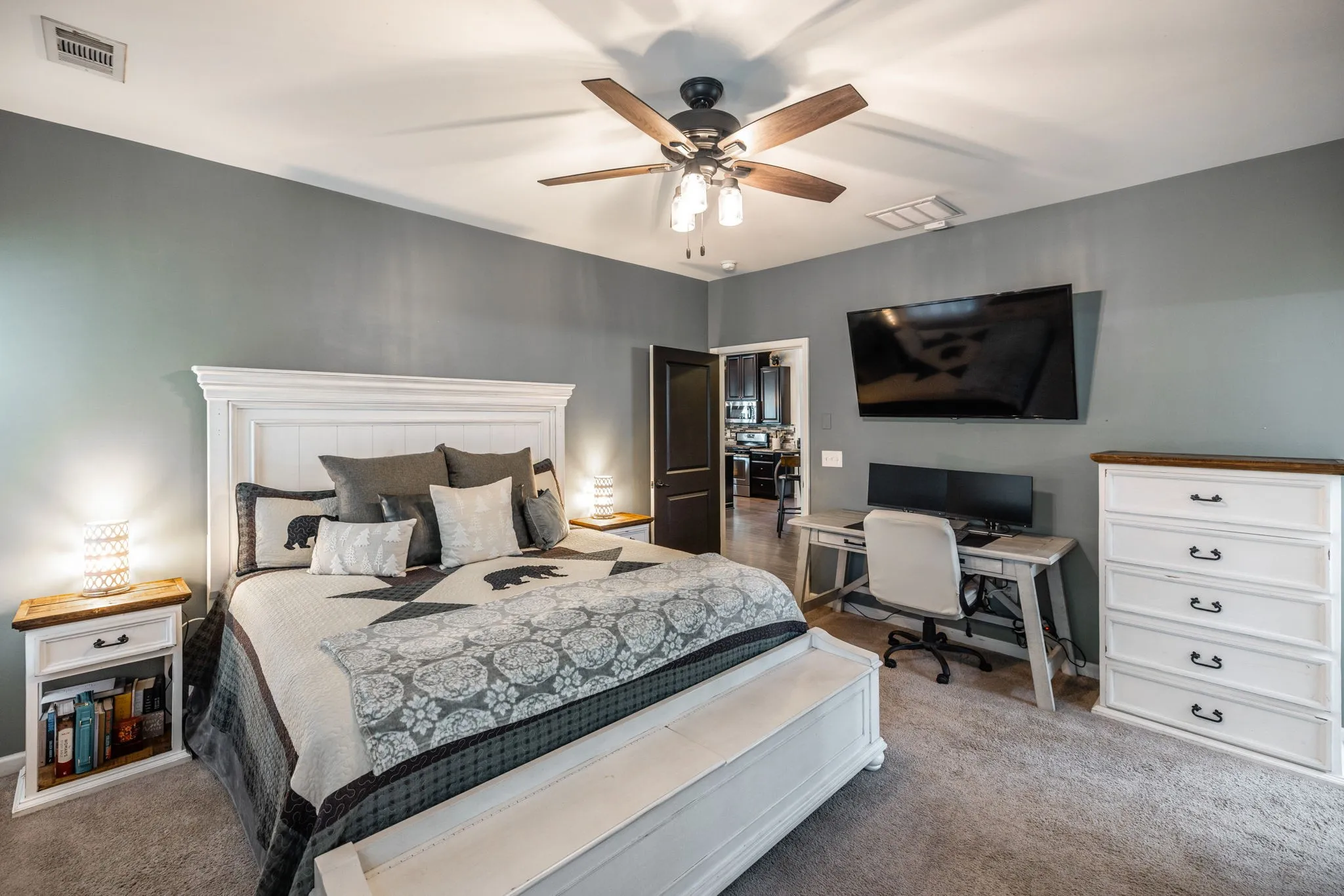 The chef’s kitchen is a showstopper—boasting a gas range, oversized walk-in pantry, and plenty of space for cooking and gathering. The main-level primary suite serves as a serene retreat with a spa-inspired en-suite bath, complete with a dual-head tiled shower and spacious walk-in closet.