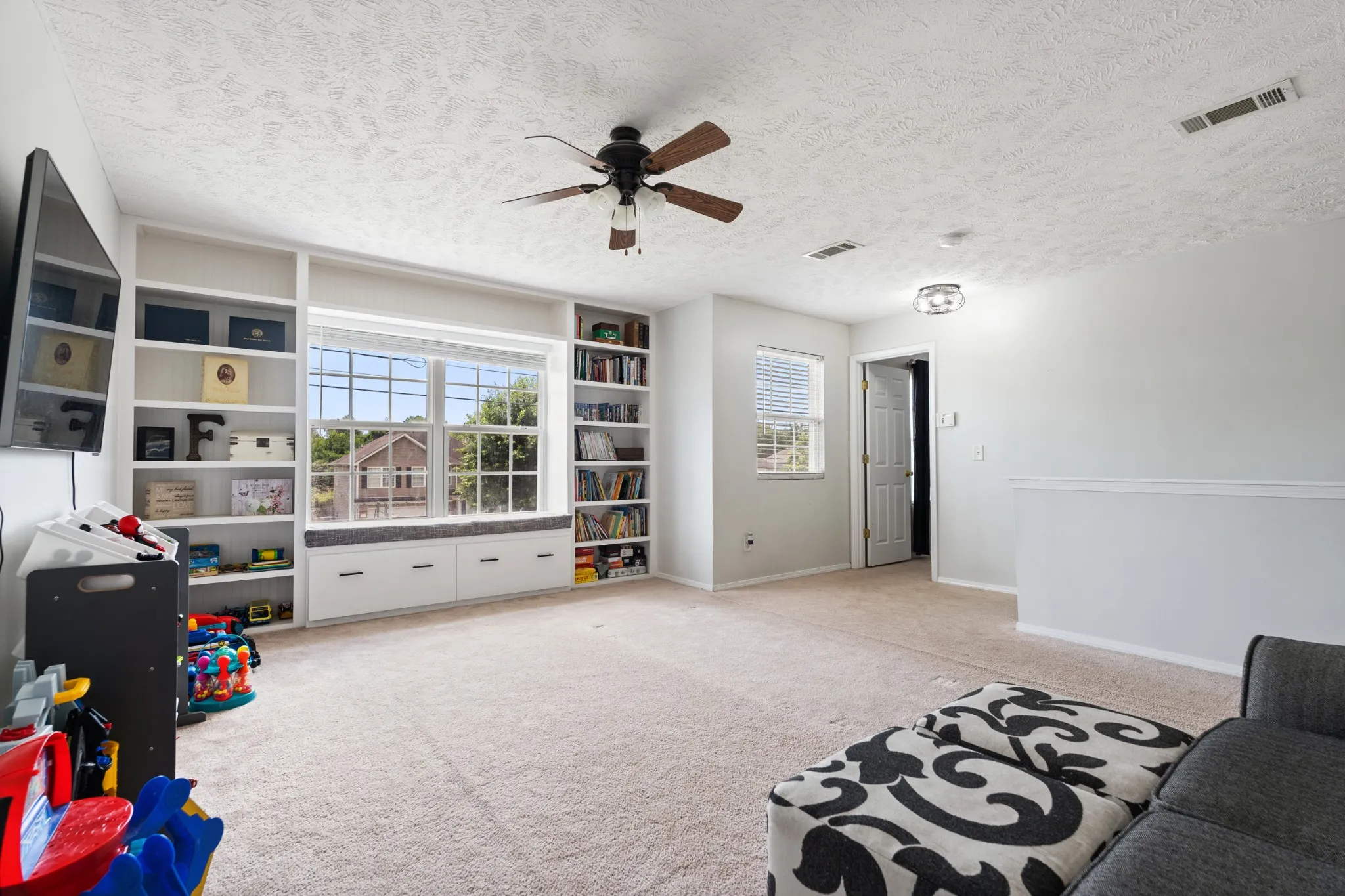 This charming home offers a welcoming layout with carpet, hardwood and tile floors throughout. The updated kitchen features modern finishes, making it a great space for both everyday living and entertaining. Enjoy the flexibility of two separate living areas—perfect for relaxing or hosting guests. The spacious primary suite includes a private ensuite bath and a large walk-in closet. Upstairs, a generous bonus loft with built-in bookshelves provides the ideal space for a home office, playroom, or cozy retreat. Outside, enjoy a peaceful backyard setting where local wildlife often makes an appearance. Conveniently located just off I-24, with easy access to both Nashville and Murfreesboro for a smooth commute. Buyer / Agent to verify all information.