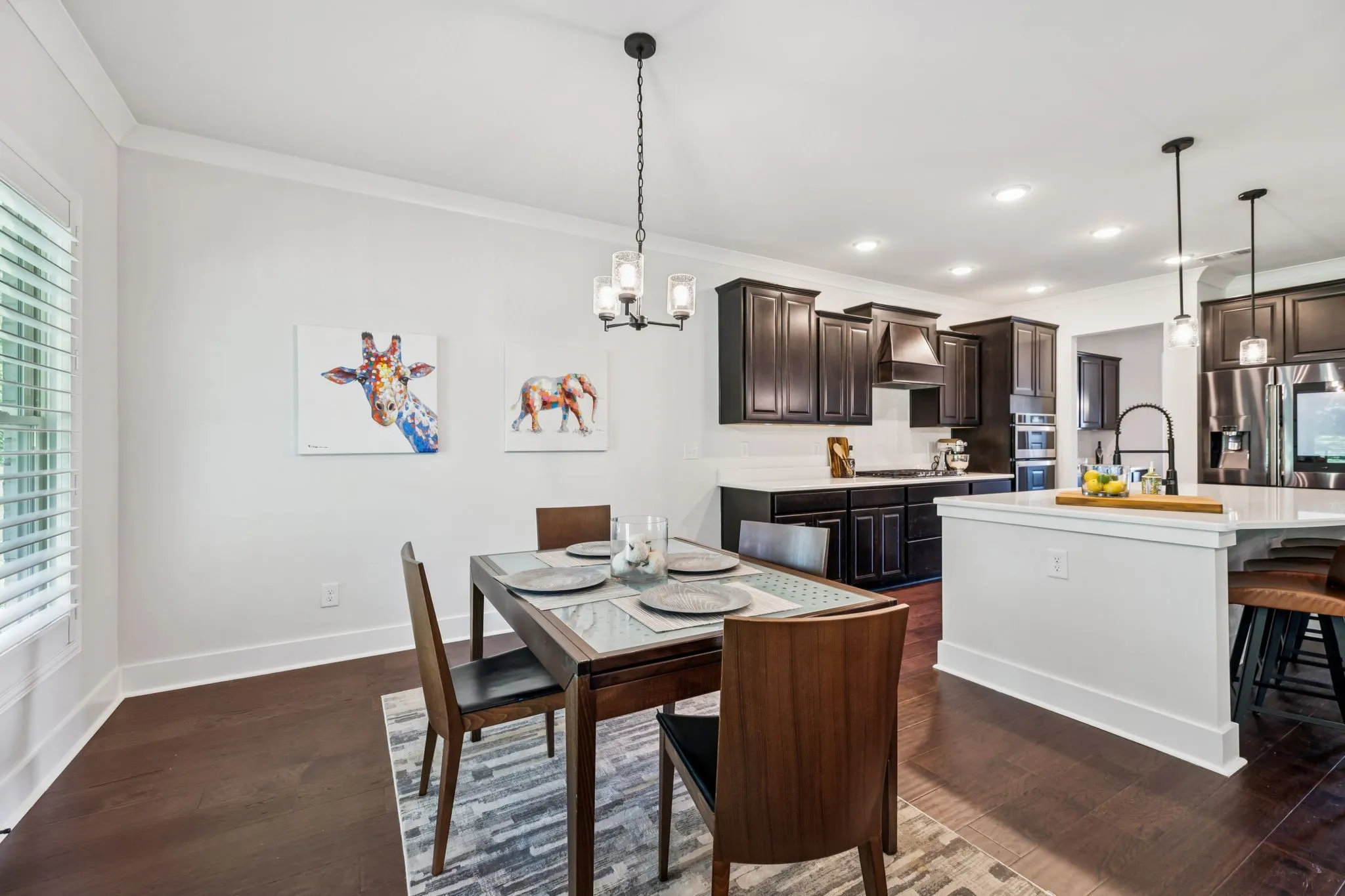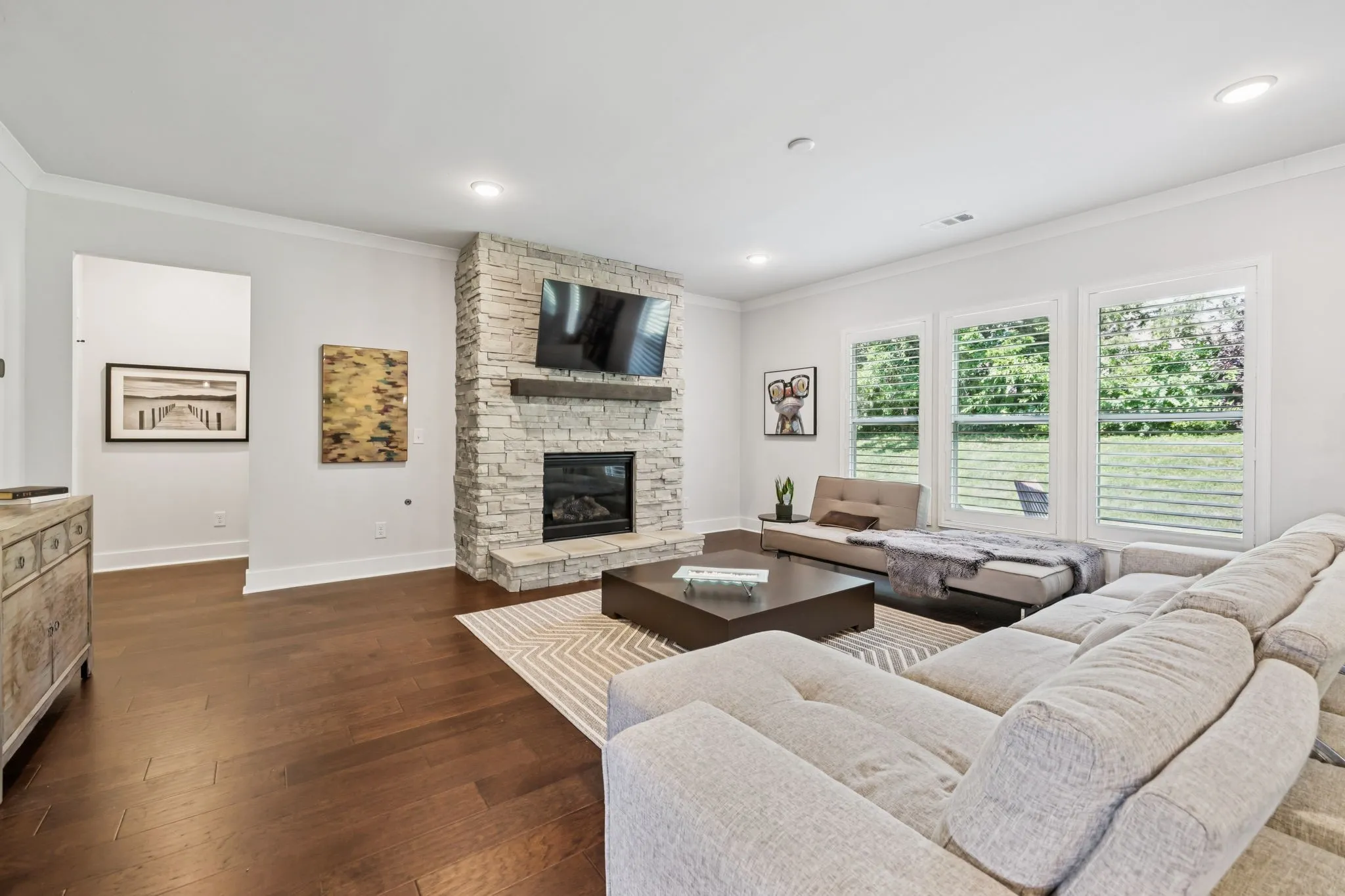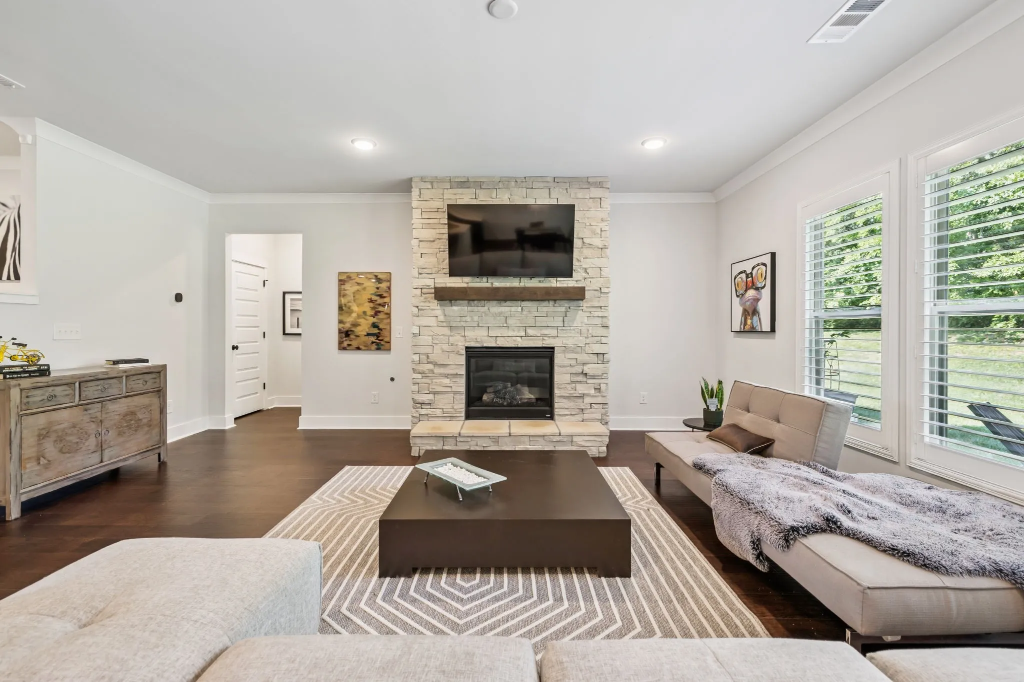 Interior Highlights—The open-concept environment centers around a family room with a custom brick fireplace, flowing into a bright kitchen with an oversized quartz island—perfect for gatherings and meal prep. The primary suite is conveniently located on the main level, while three secondary bedrooms (each with a walk-in closet) are upstairs alongside a versatile bonus area. A dedicated office on the main floor provides a quiet space for work or study. Additional details like hardwood floors on the main level (except the primary suite), plantation shutters, crown molding, recessed lighting, and iron-accented stair railings add a polished finish.