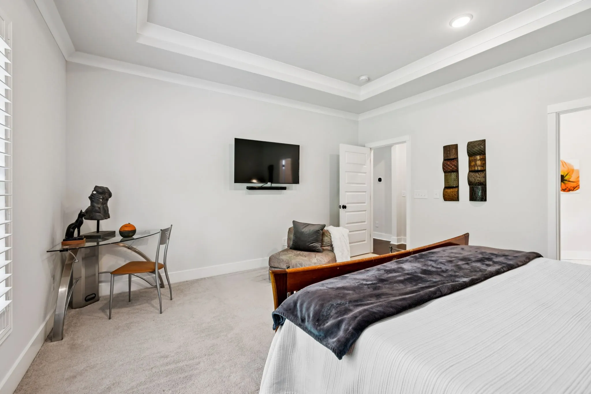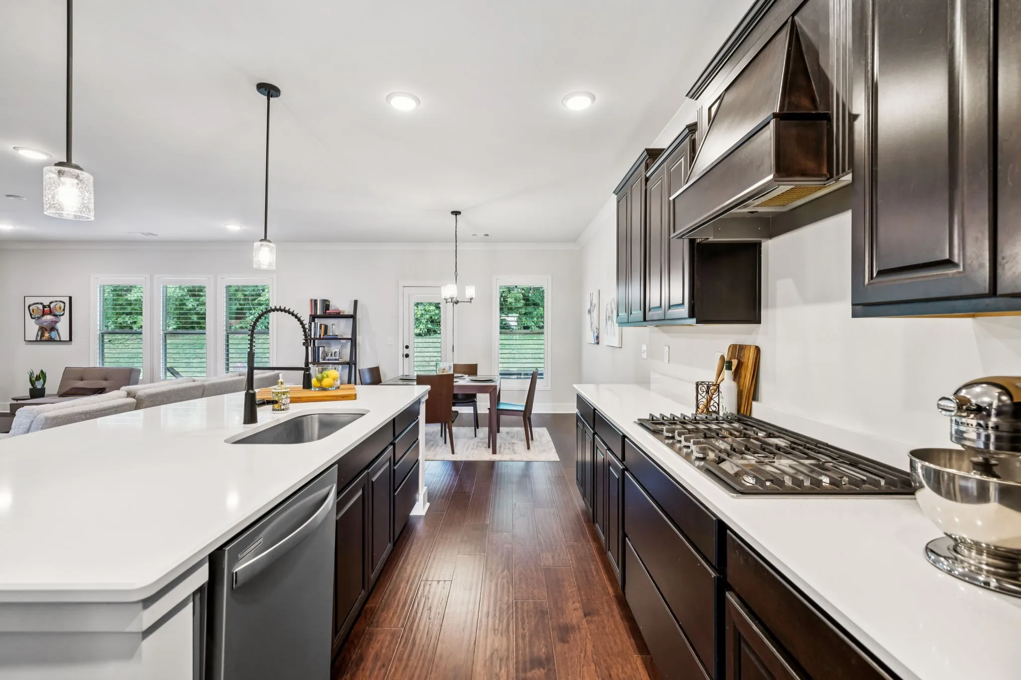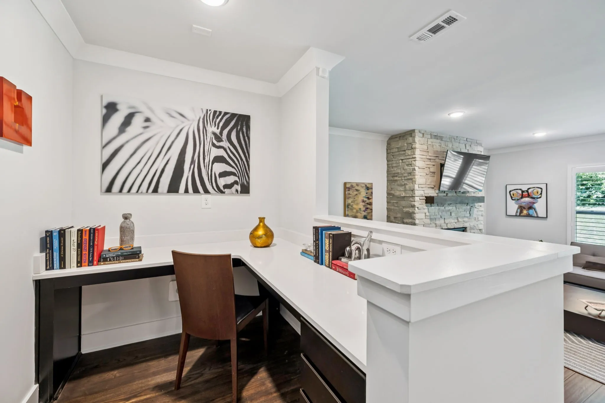 Interior Highlights—The open-concept environment centers around a family room with a custom brick fireplace, flowing into a bright kitchen with an oversized quartz island—perfect for gatherings and meal prep. The primary suite is conveniently located on the main level, while three secondary bedrooms (each with a walk-in closet) are upstairs alongside a versatile bonus area. A dedicated office on the main floor provides a quiet space for work or study. Additional details like hardwood floors on the main level (except the primary suite), plantation shutters, crown molding, recessed lighting, and iron-accented stair railings add a polished finish.
