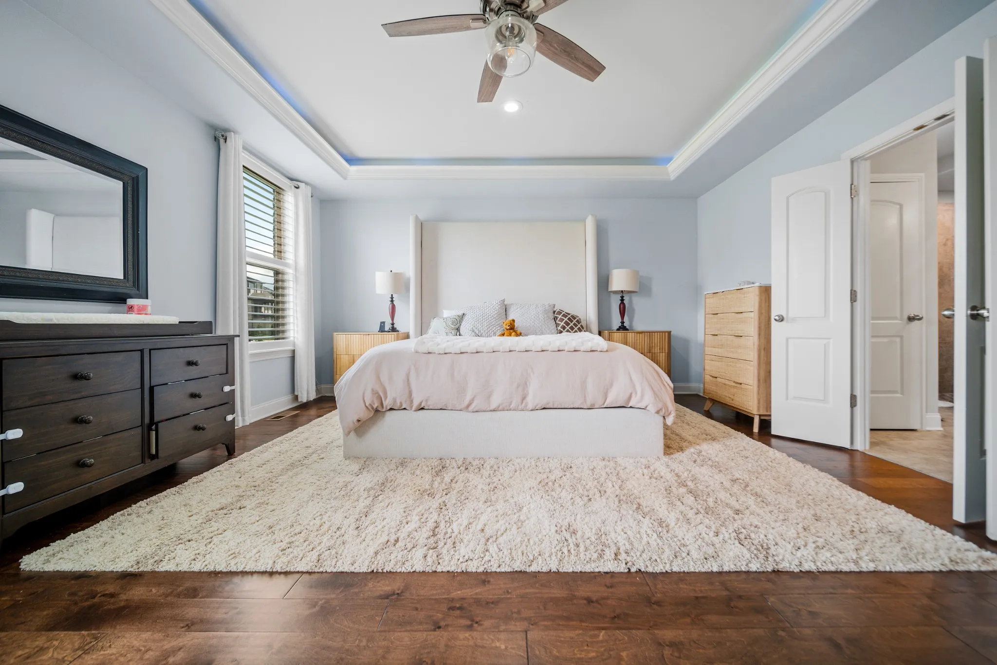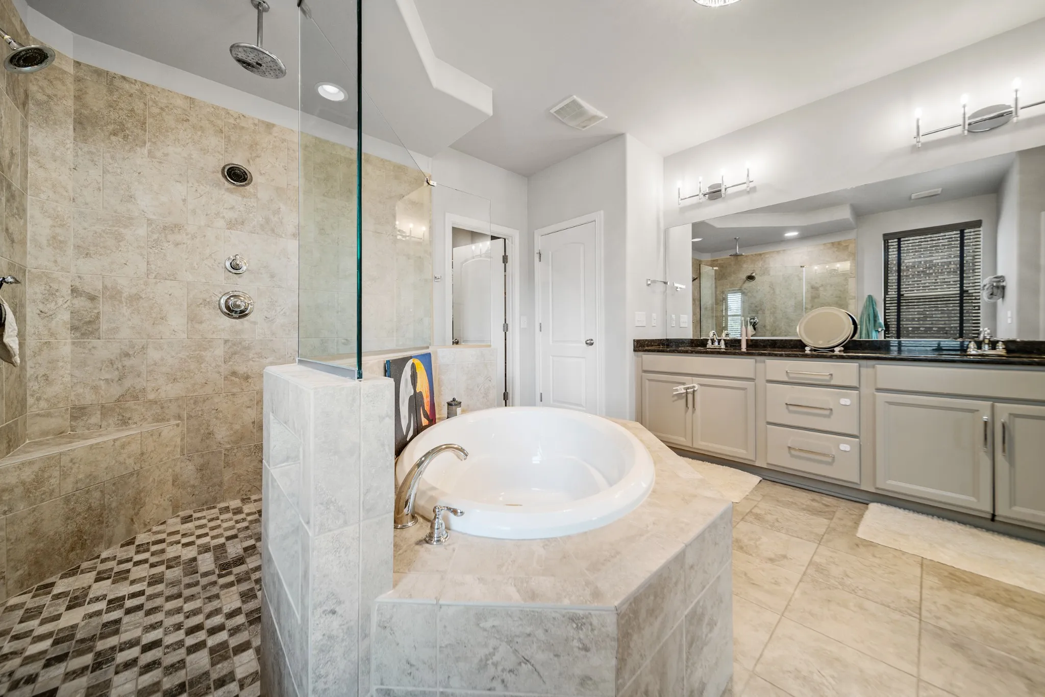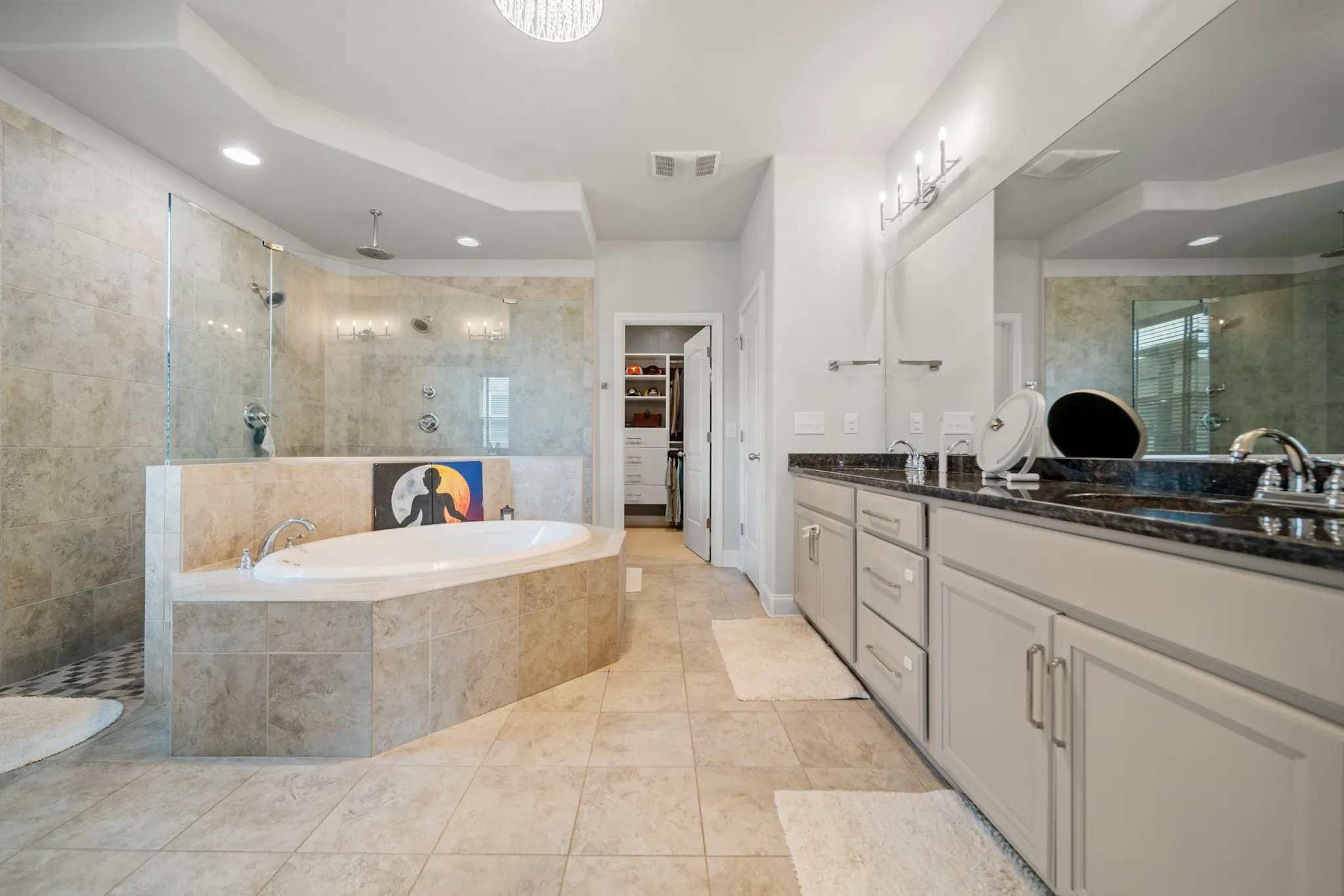 Nestled in the highly desirable Canterbury neighborhood, this beautifully maintained 4-bedroom, 3-bathroom home offers the perfect blend of comfort, elegance, and everyday functionality—all within 3,219 square feet of thoughtfully designed living space. Step inside, to an open floorplan with SOARING CEILINGS that flood the home with natural light. The main level includes a spacious primary suite tucked privately behind the living area, complete with a luxurious en-suite bathroom featuring a DOUBLE-OVERSIZED SHOWER, a separate soaking tub, and a large walk-in closet with CUSTOM BUILT-INS.\n