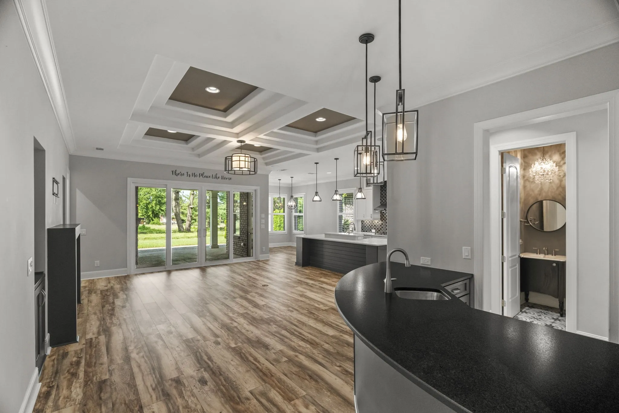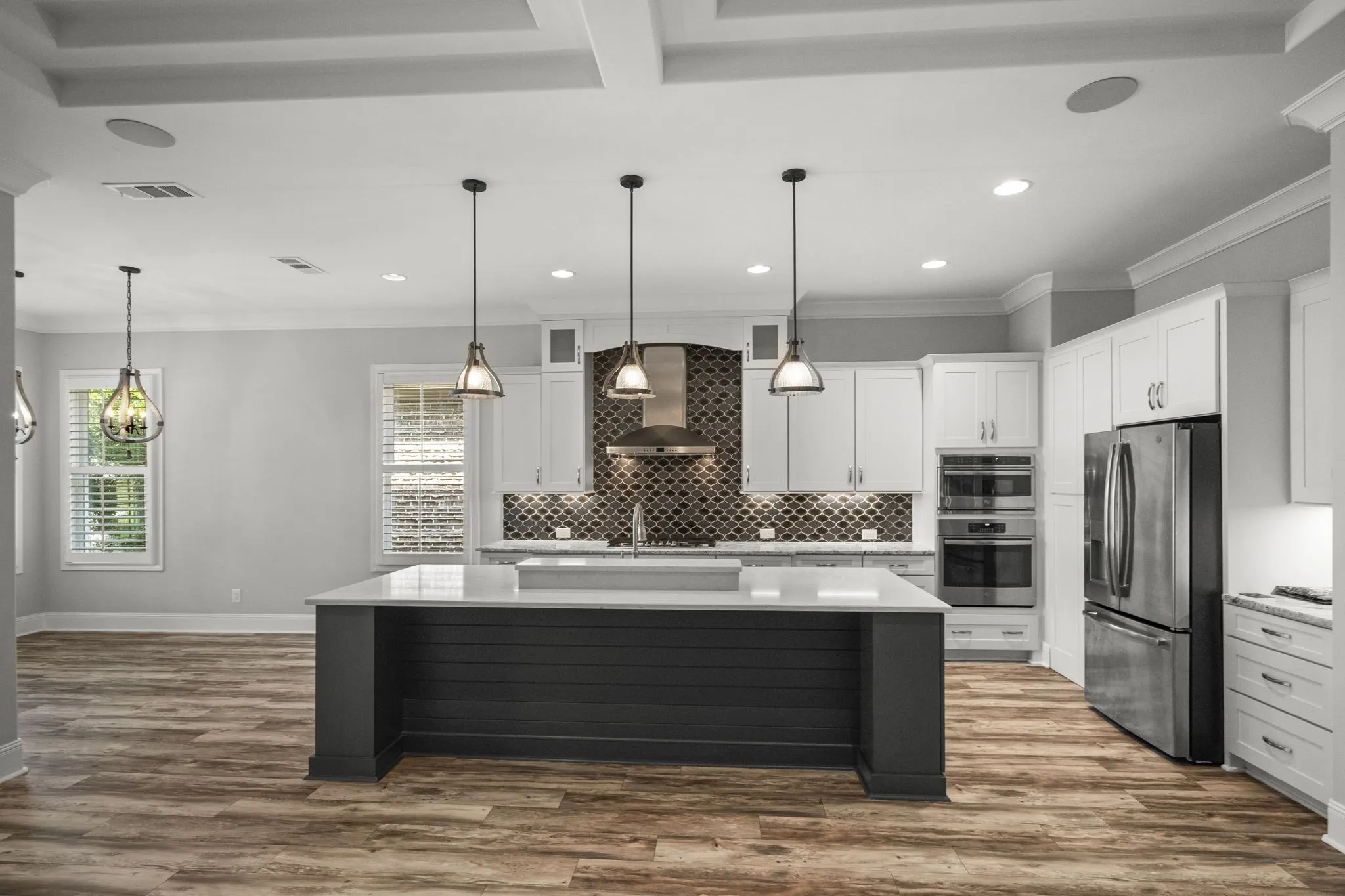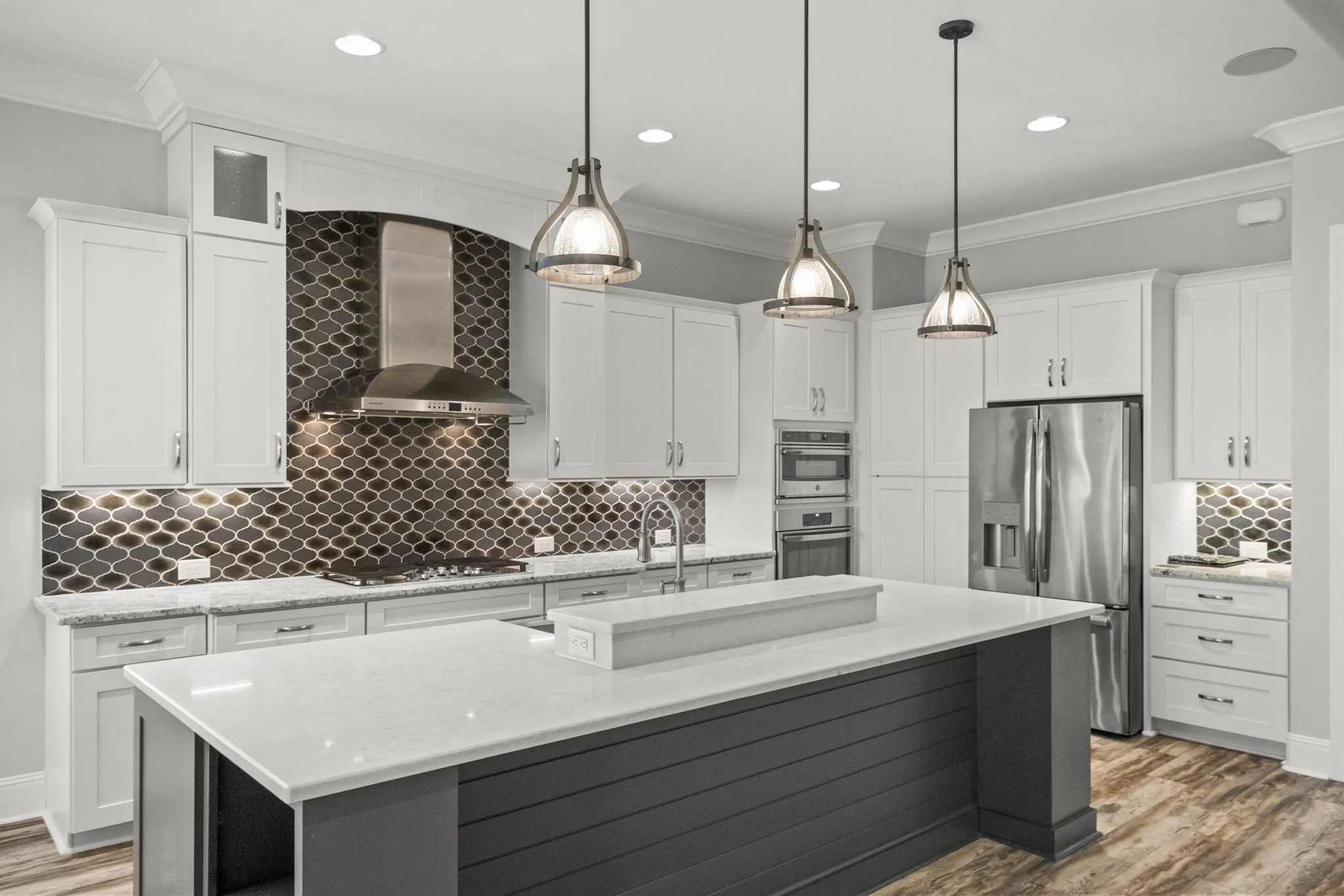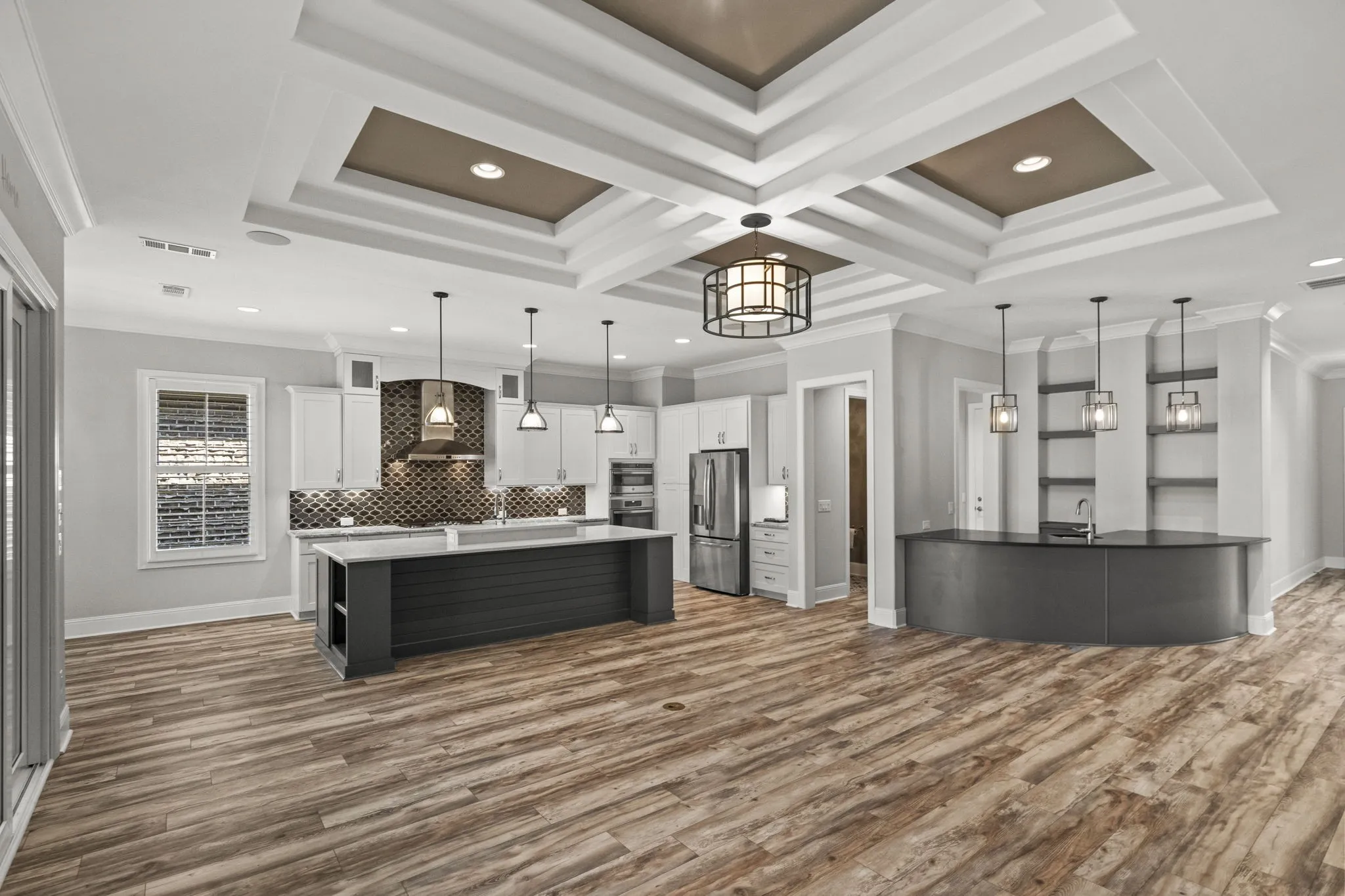 The heart of the home features a spacious open-concept living area with a gas fireplace and a large wet bar complete with wine fridge and bar seating—perfect for entertaining. The gourmet kitchen includes a generous island, gas cooktop range, built-in convection microwave & oven, a hidden walk-in pantry, and beautiful finishes throughout.