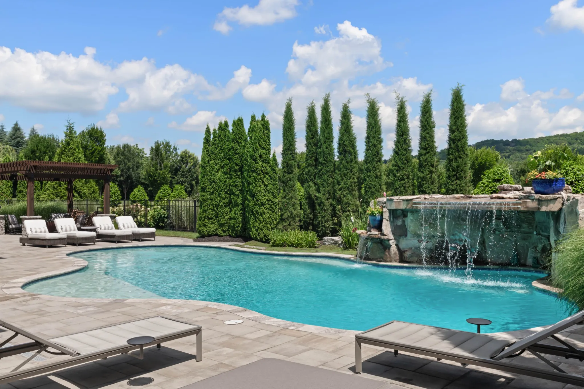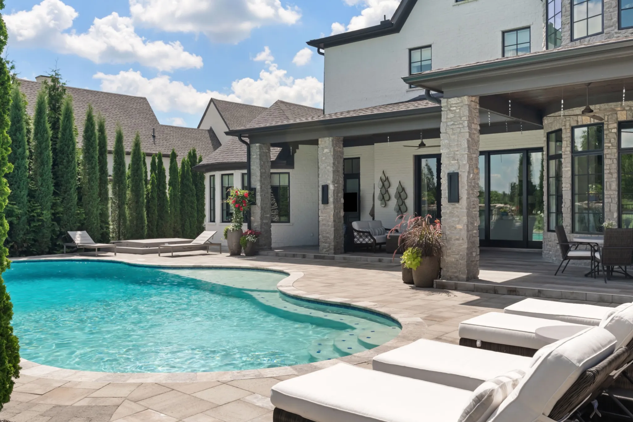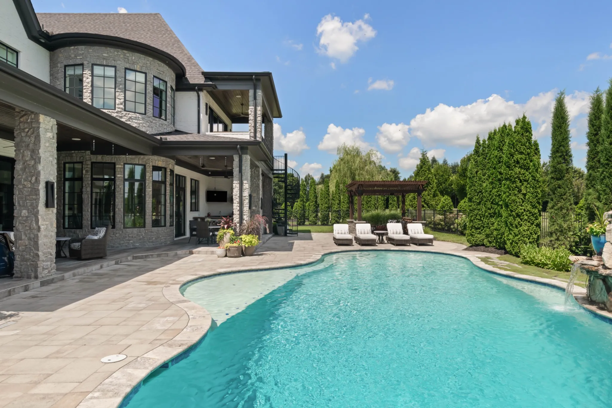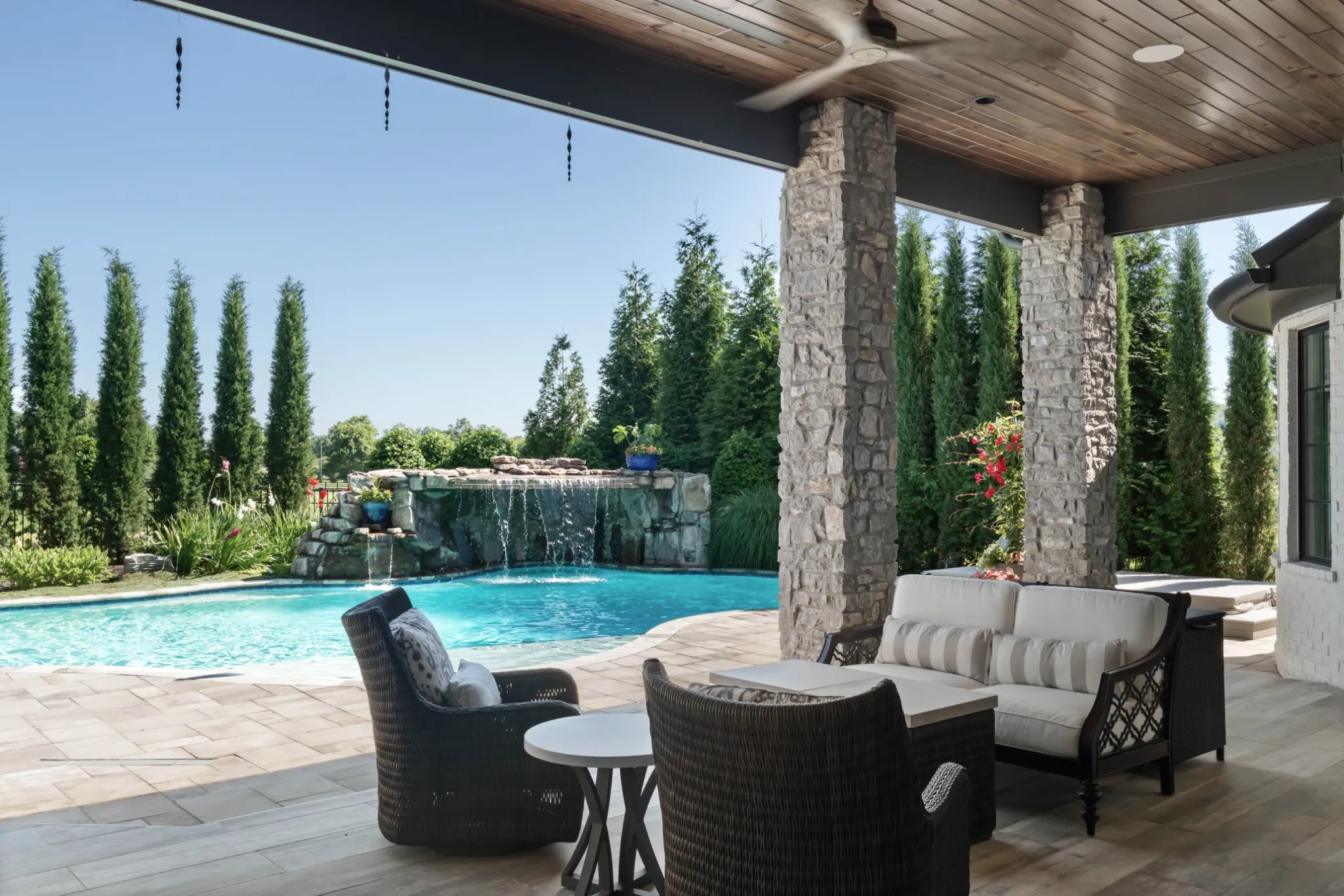 Inside, soaring ceilings and expansive windows blur the line between indoors and out. Thoughtfully designed for both grand entertaining and intimate living, the open-concept layout flows seamlessly to a covered lanai and outdoor kitchen—overlooking rolling hills, a resort-style pool, spa, and waterfall.\n