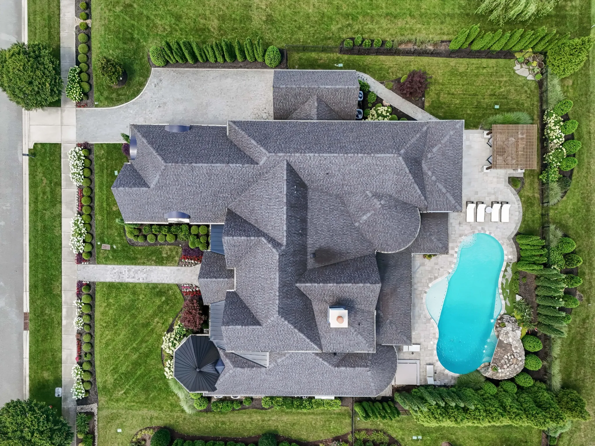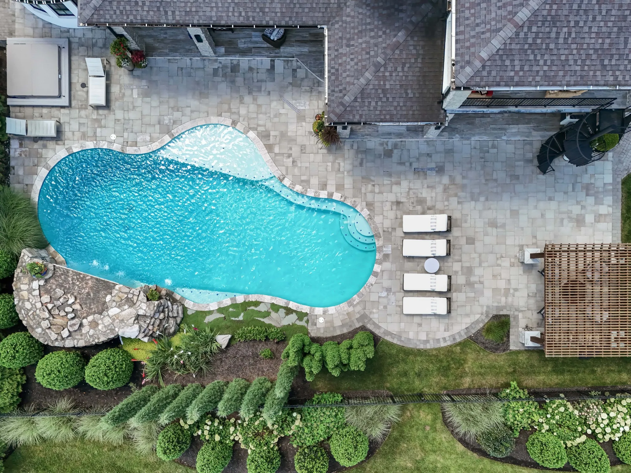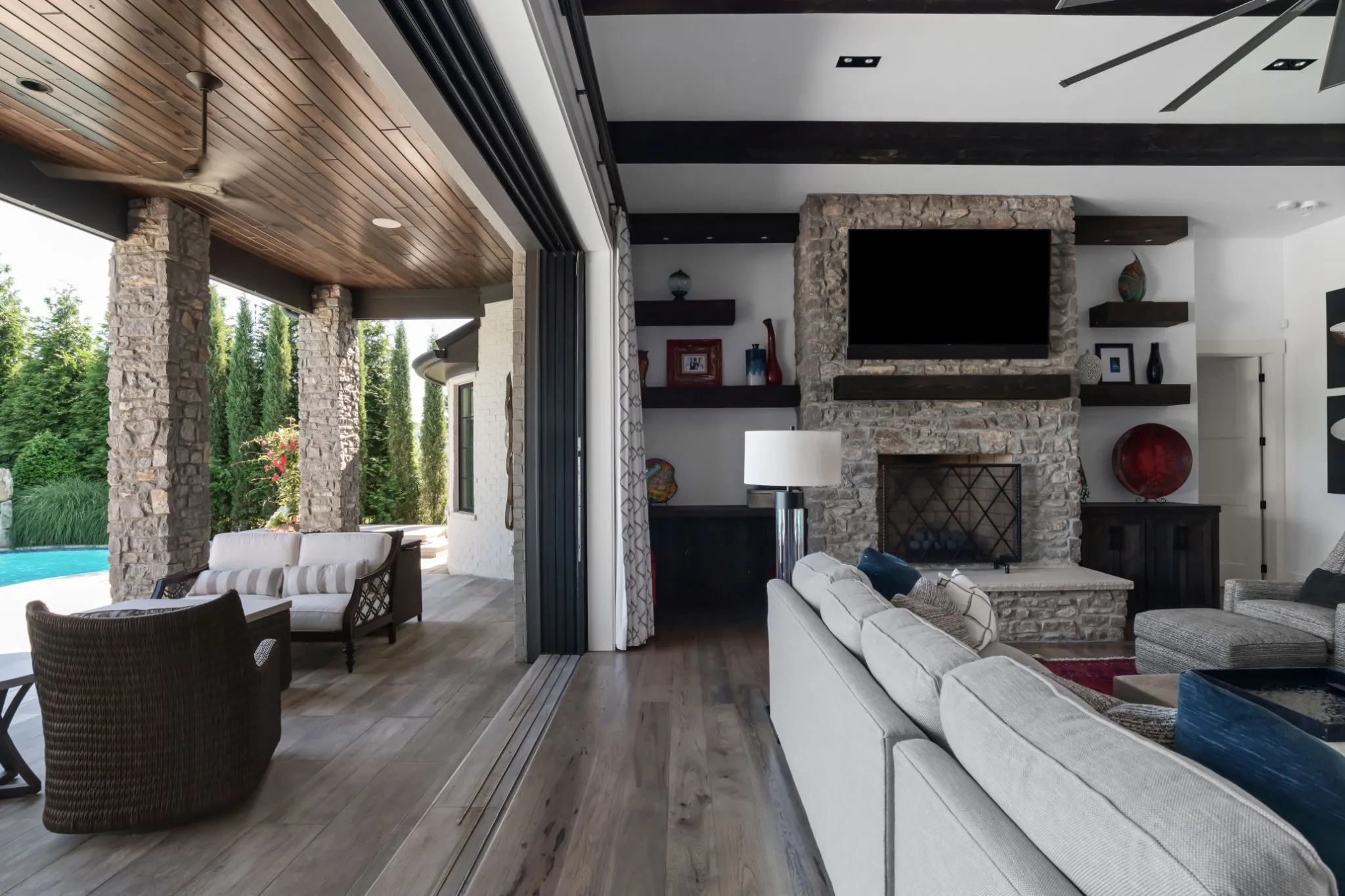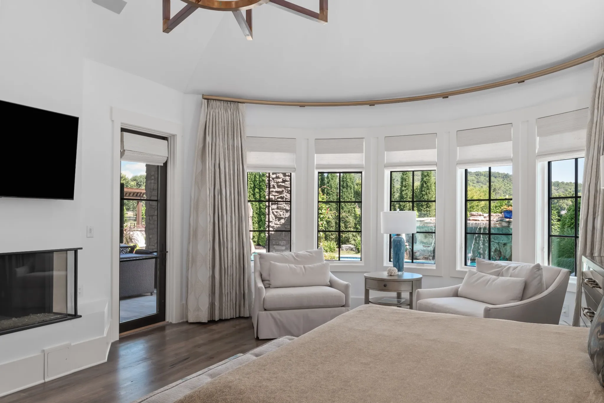 Inside, soaring ceilings and expansive windows blur the line between indoors and out. Thoughtfully designed for both grand entertaining and intimate living, the open-concept layout flows seamlessly to a covered lanai and outdoor kitchen—overlooking rolling hills, a resort-style pool, spa, and waterfall.\n