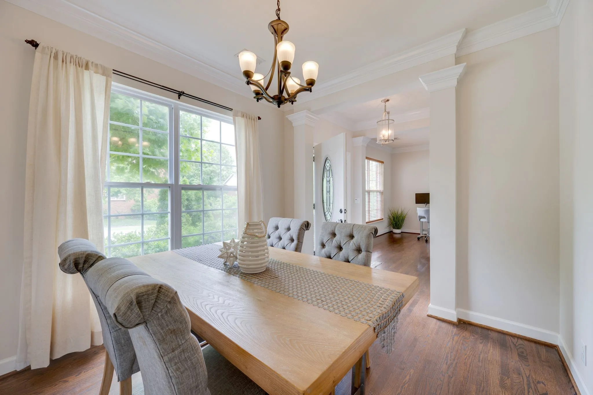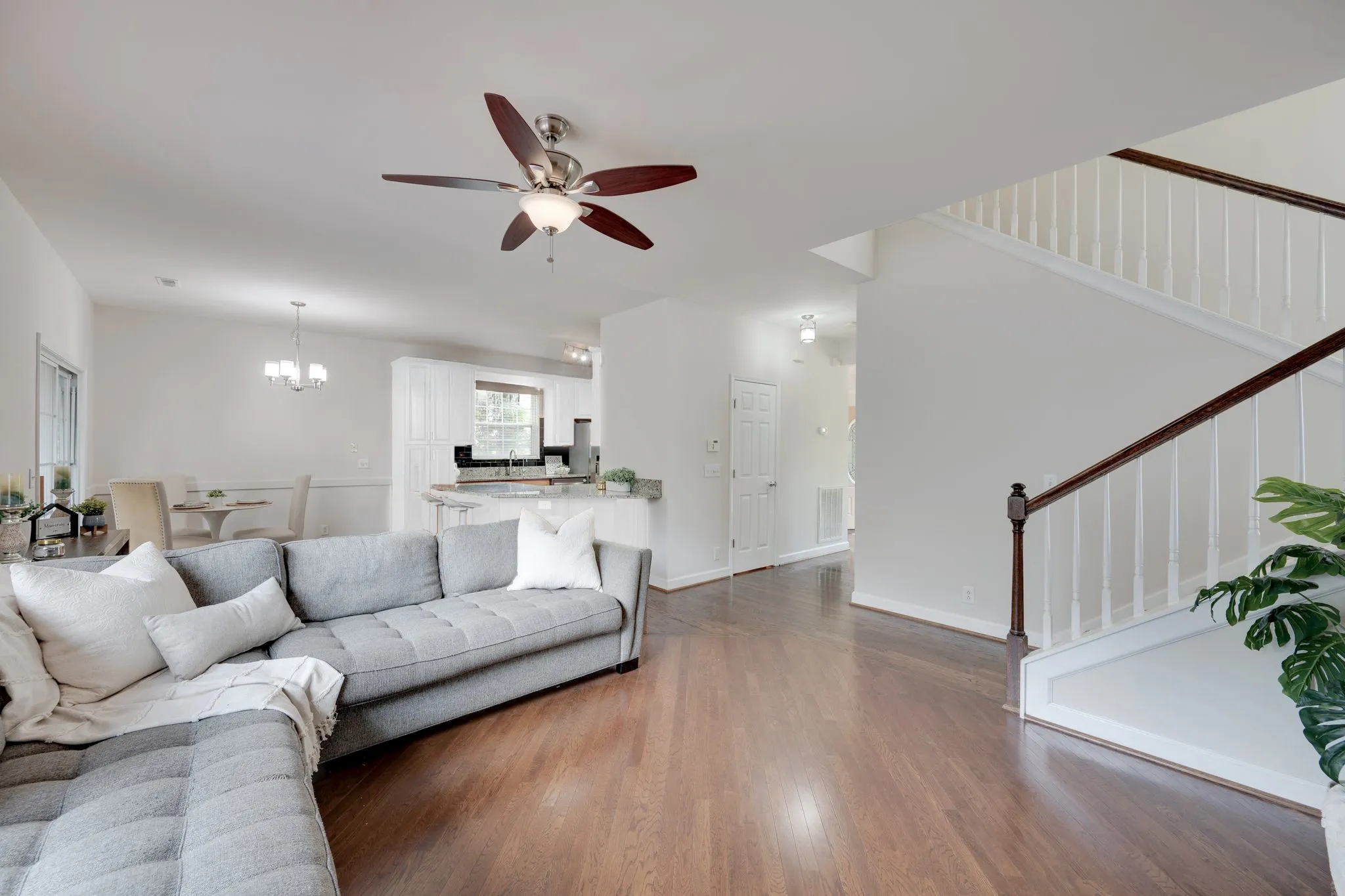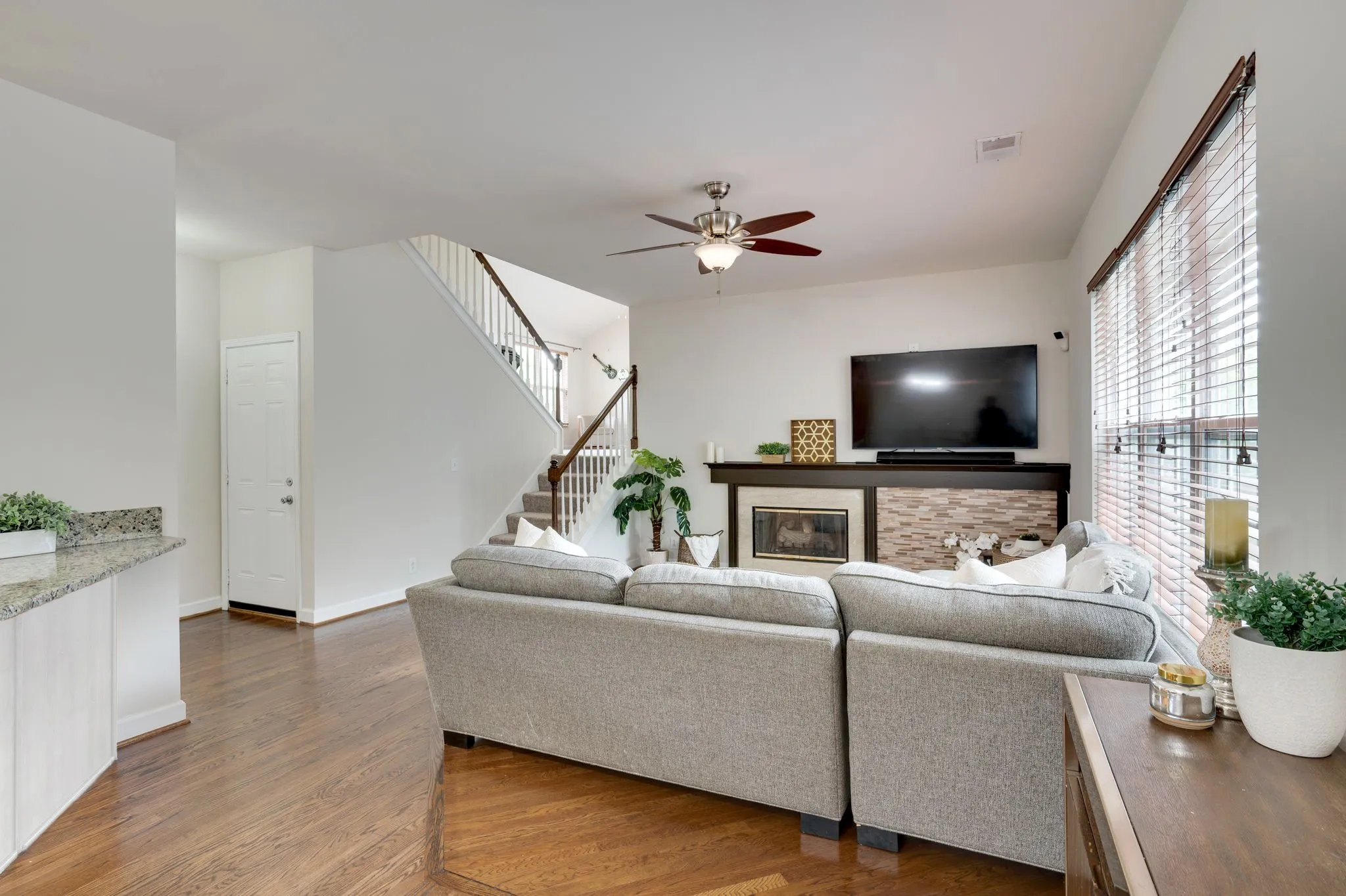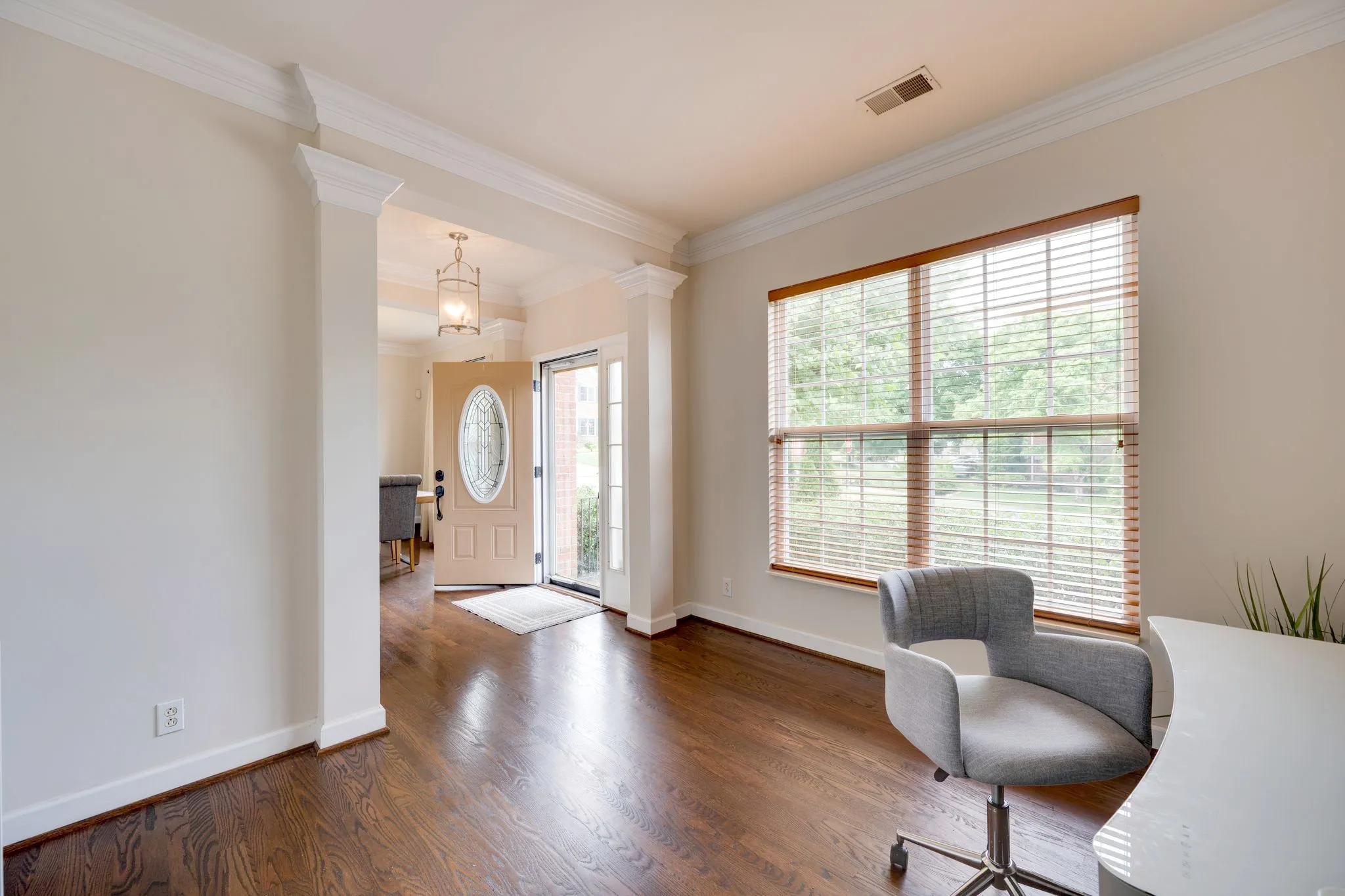 Upon entering the home, you’re greeted by a formal dining room on one side and a spacious formal living/executive office on the other — ideal for working from home or hosting gatherings. The main living area features a welcoming, open-concept floor plan, with the living room anchored by a stunning fireplace and seamlessly connected to the large, white kitchen with granite counter tops and breakfast room. A convenient powder bath is located off the main hallway.\n