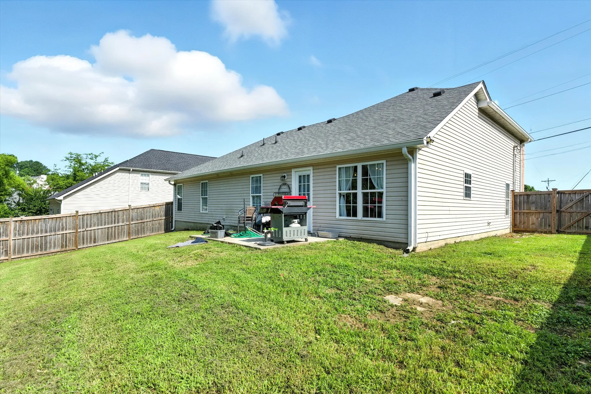 Located in sought after neighborhood, this home lends perfectly to entertainment with an open concept floorplan. Tall ceilings in living room & in spacious bonus space, stainless steel appliances in kitchen, fully fenced back yard and even a patio! All 3 bedrooms including the primary are on the main floor the huge bonus space upstairs has closet and can be used as flex bedroom! Walk in closet & double vanities in primary bedroom! New LVP floors, fresh paint and even a two car garage. Located conveniently to tons of shopping, food, & entertainment. Come view today!