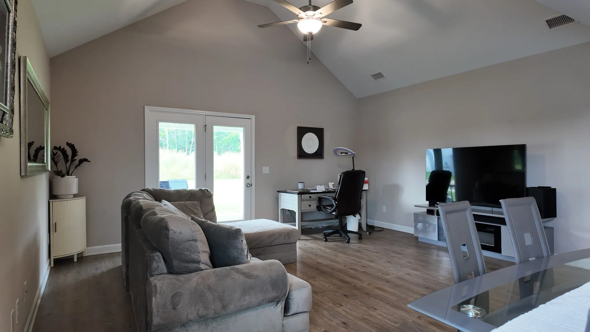 The great room boasts soaring vaulted ceilings, creating a bright and open feel. Enjoy low-maintenance laminate flooring throughout the kitchen, great room, and primary bedroom, with elegant ceramic tile in all wet areas.