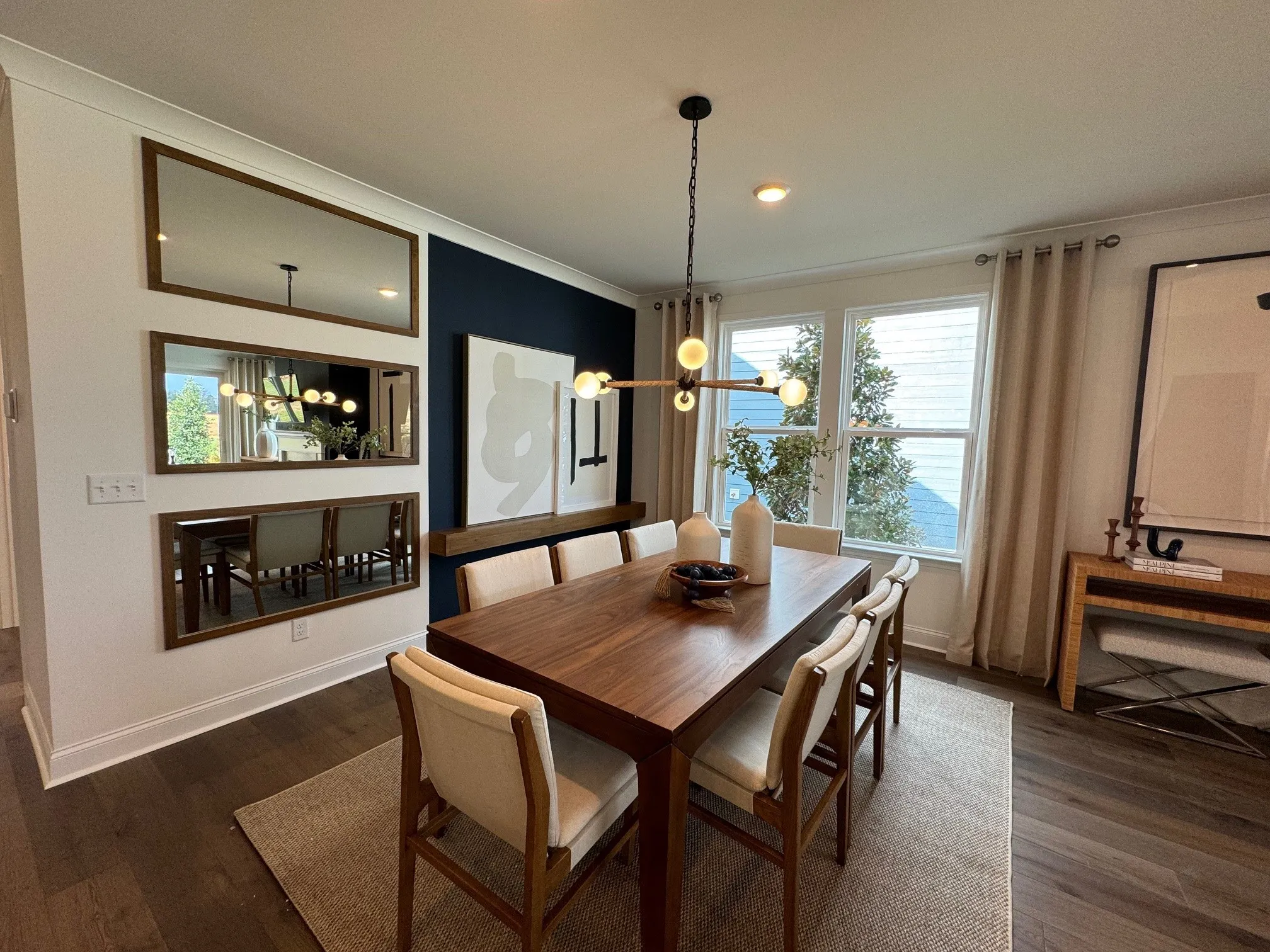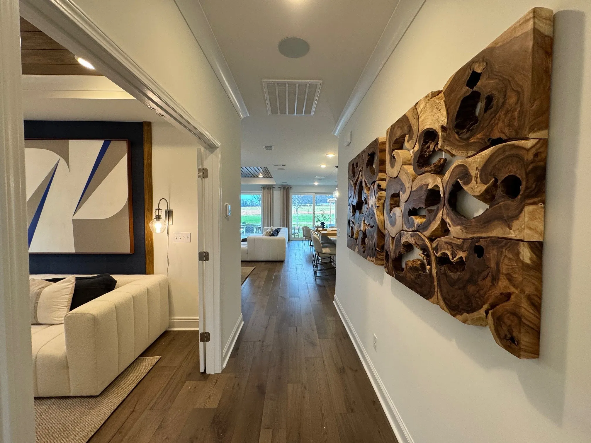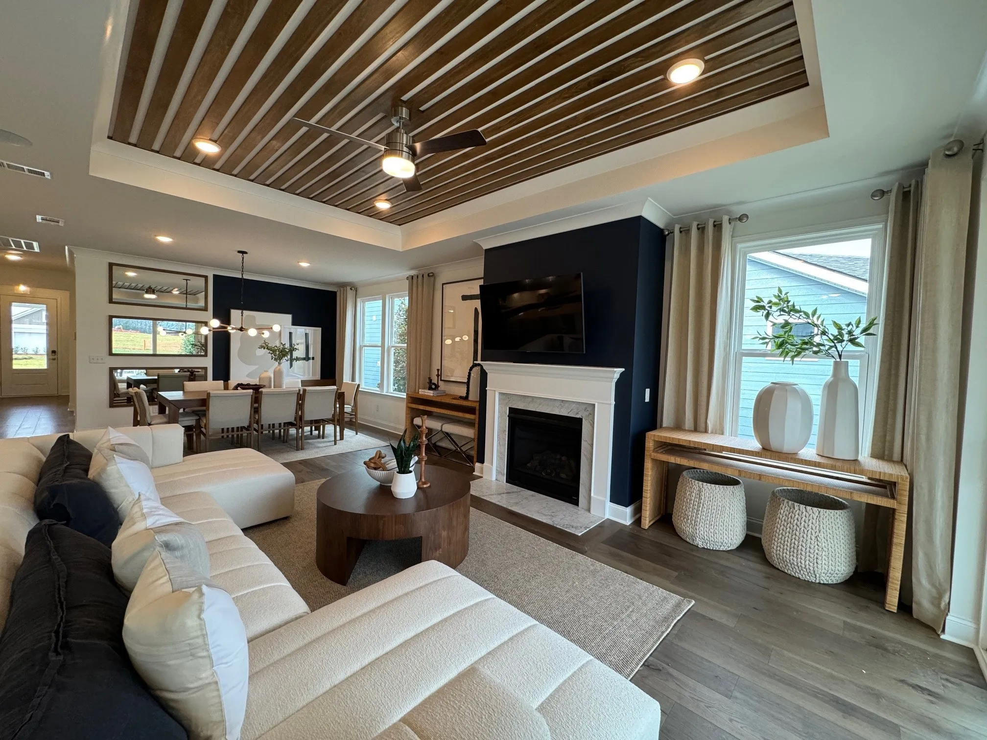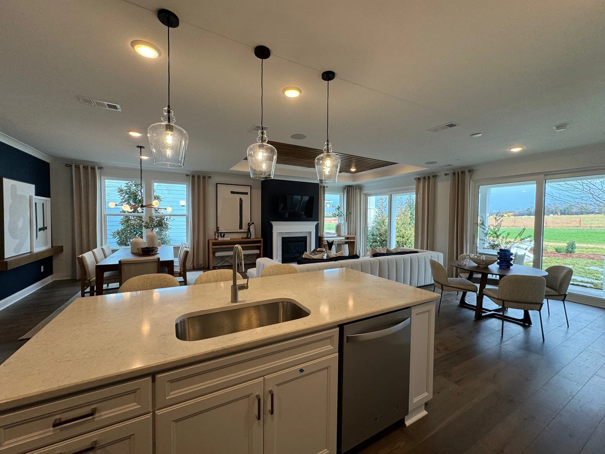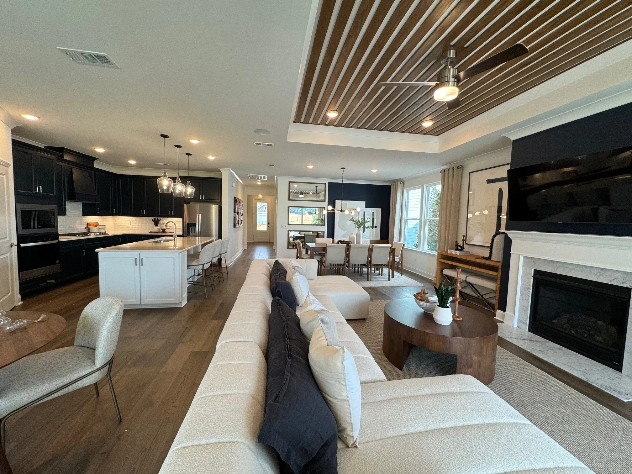 Popular Mystique Plan with 2 bedrooms and 2 baths plus a separate dedicated flex room perfect for craft or office. This home has a 4 ‘ garage extension plus a third car tandem space for storage or your BRAND NEW GOLF CART (ask us how to get one free in August). Fashion forward design choices in cabinetry, flooring, finishes, lighting, plumbing fixtures and owners suite with doorless full size walk in shower with overhead rainshower. Linear fireplace flush with the wall in the great room with block mantle is sleek and a focal point for the room. Oversized laundry with quartz top and undermount sink features a small utility closet.