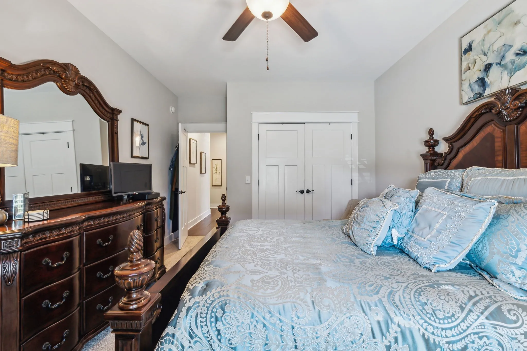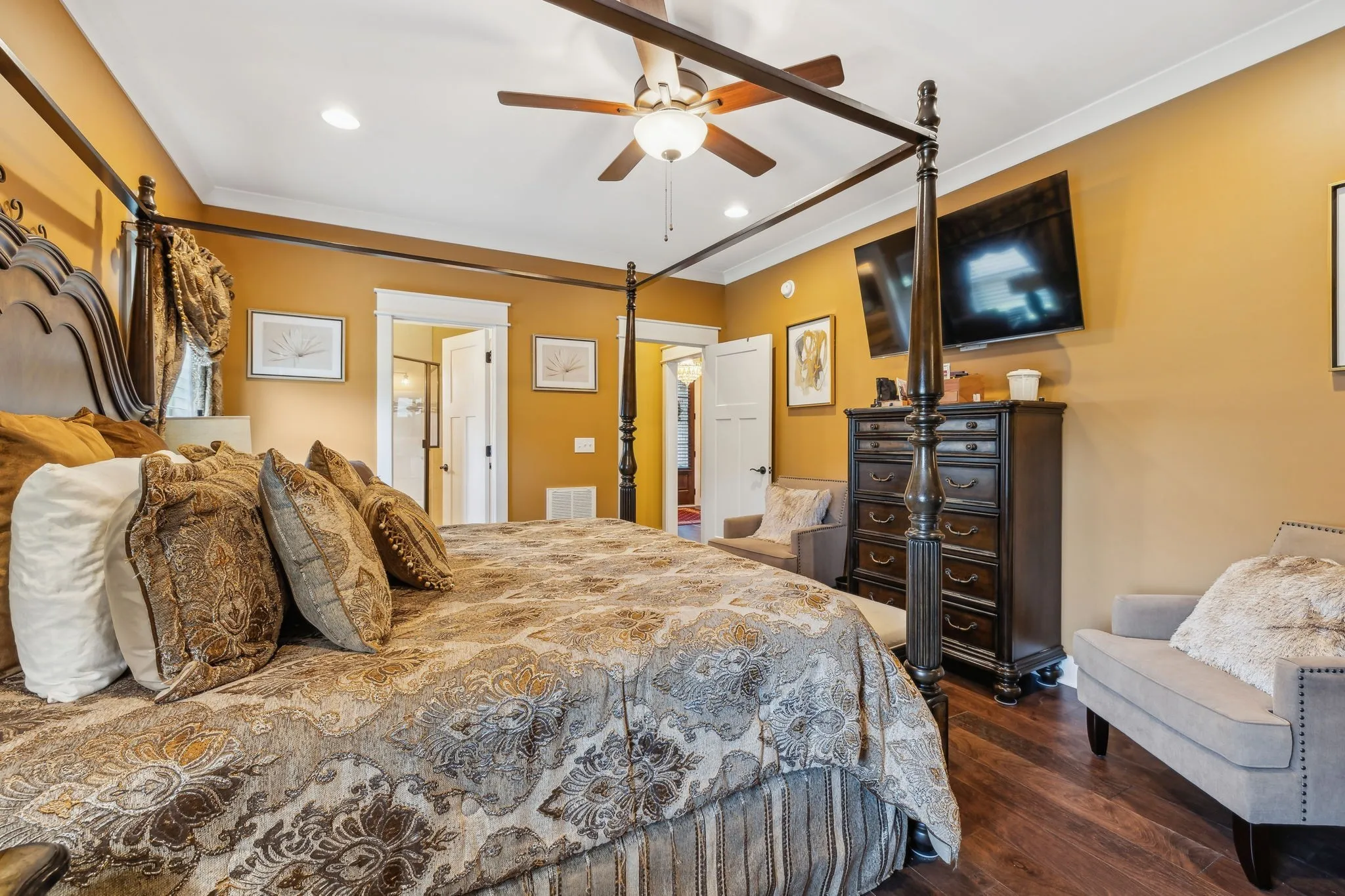 Welcome to this beautifully designed home in the highly sought-after Reserves community! This stunning 5-bedroom, 4-bathroom home offers a spacious, open layout with hardwood floors throughout. The main-floor primary suite features double vanities, a large walk-in closet with built-in shelving, and a luxurious bathroom. A second bedroom and full bath on the main level provide added flexibility for guests or multi-generational living.