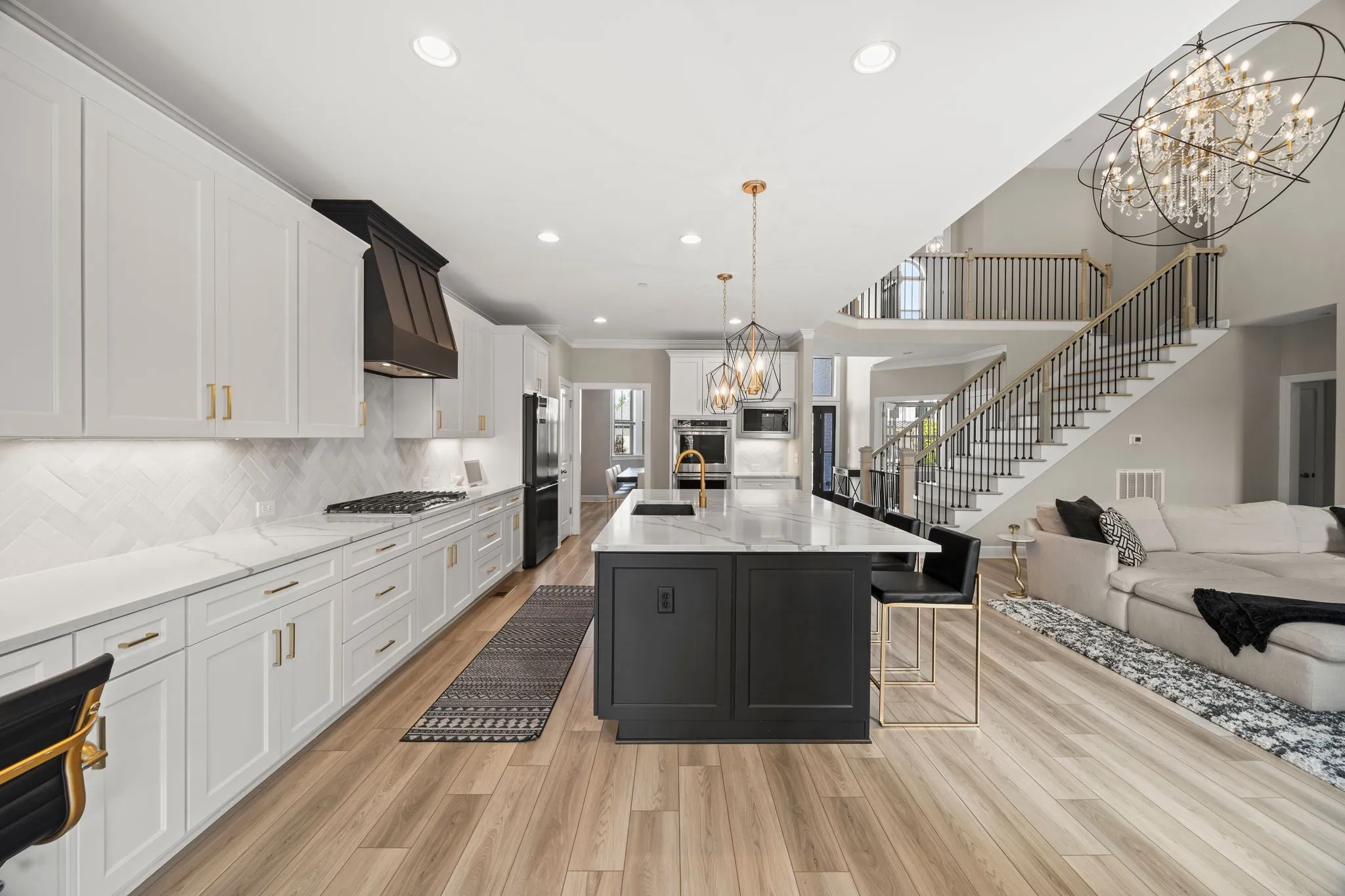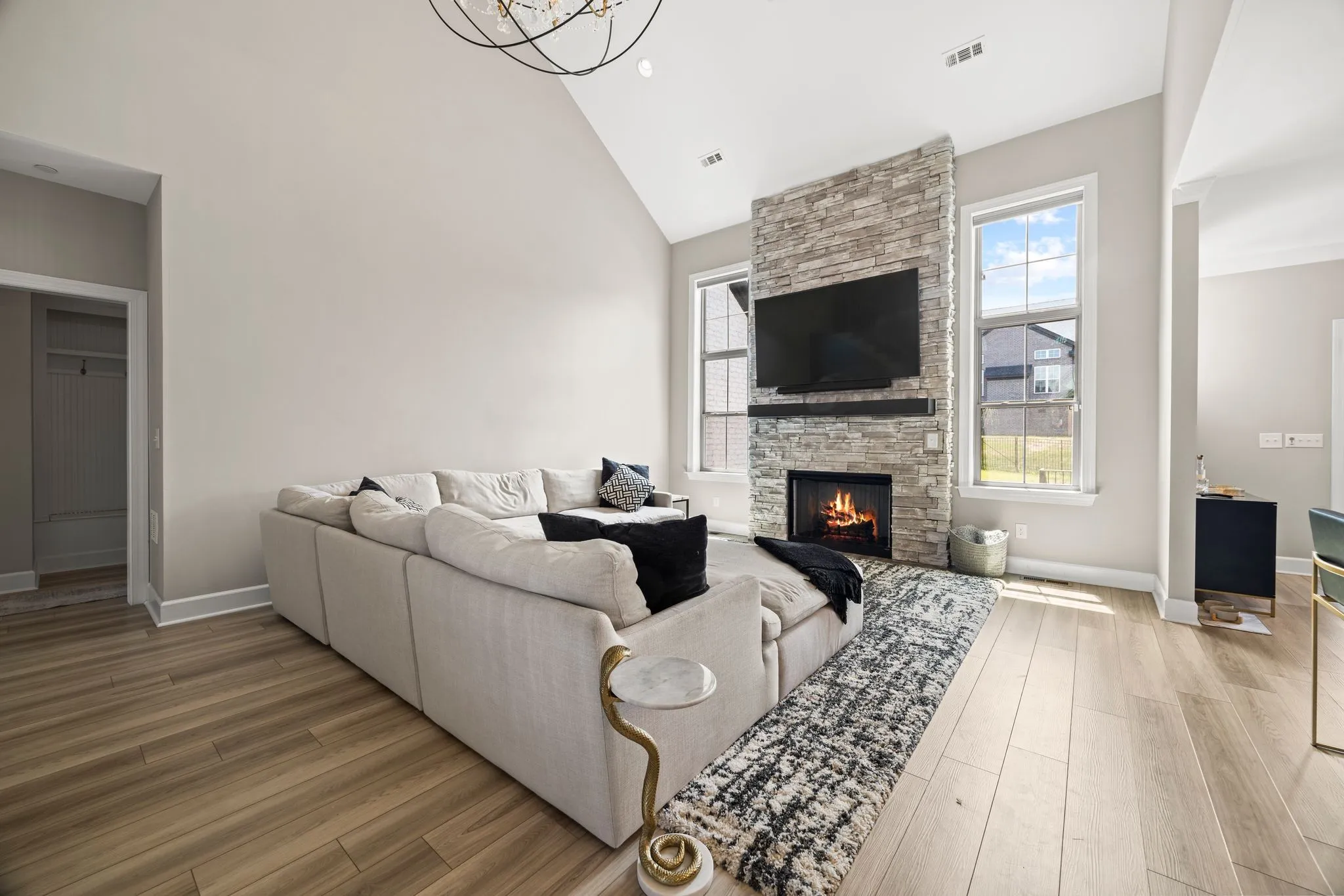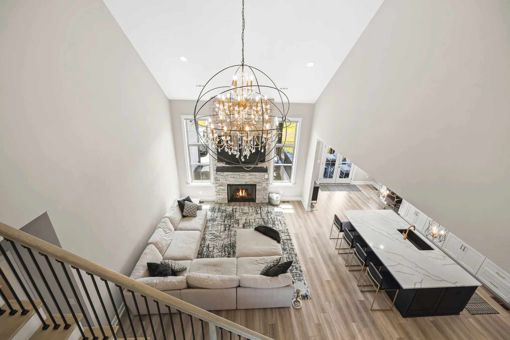 Built in 2022 and meticulously maintained, this 3,177 sq. ft. residence offers an open, light-filled layout ideal for modern living and effortless entertaining. The grand two-story great room captivates with a breathtaking stone fireplace and dazzling chandelier, flowing seamlessly into the chef’s kitchen featuring sleek quartz countertops, high-end appliances, a custom range hood, and an expansive island perfect for gatherings.