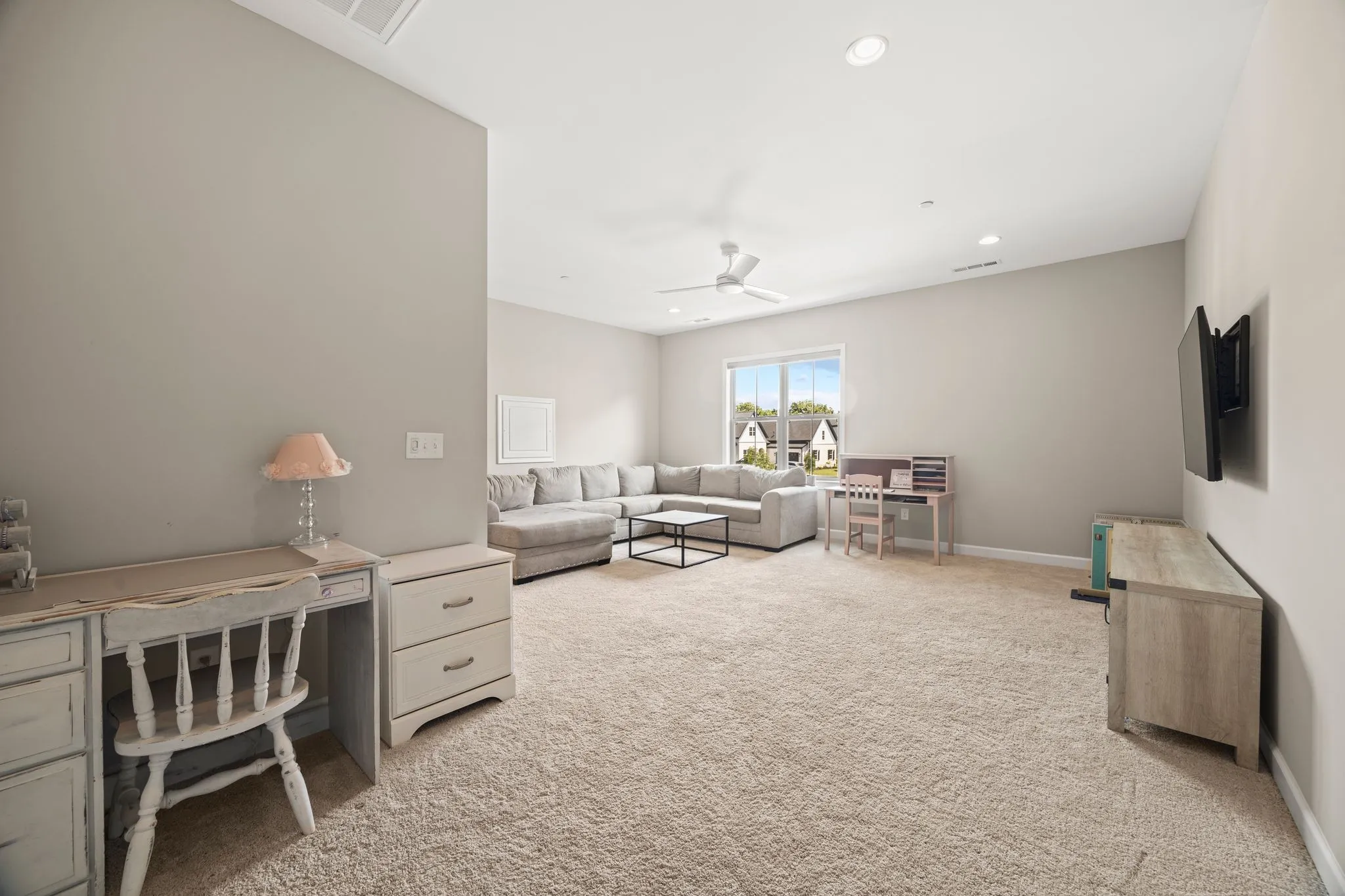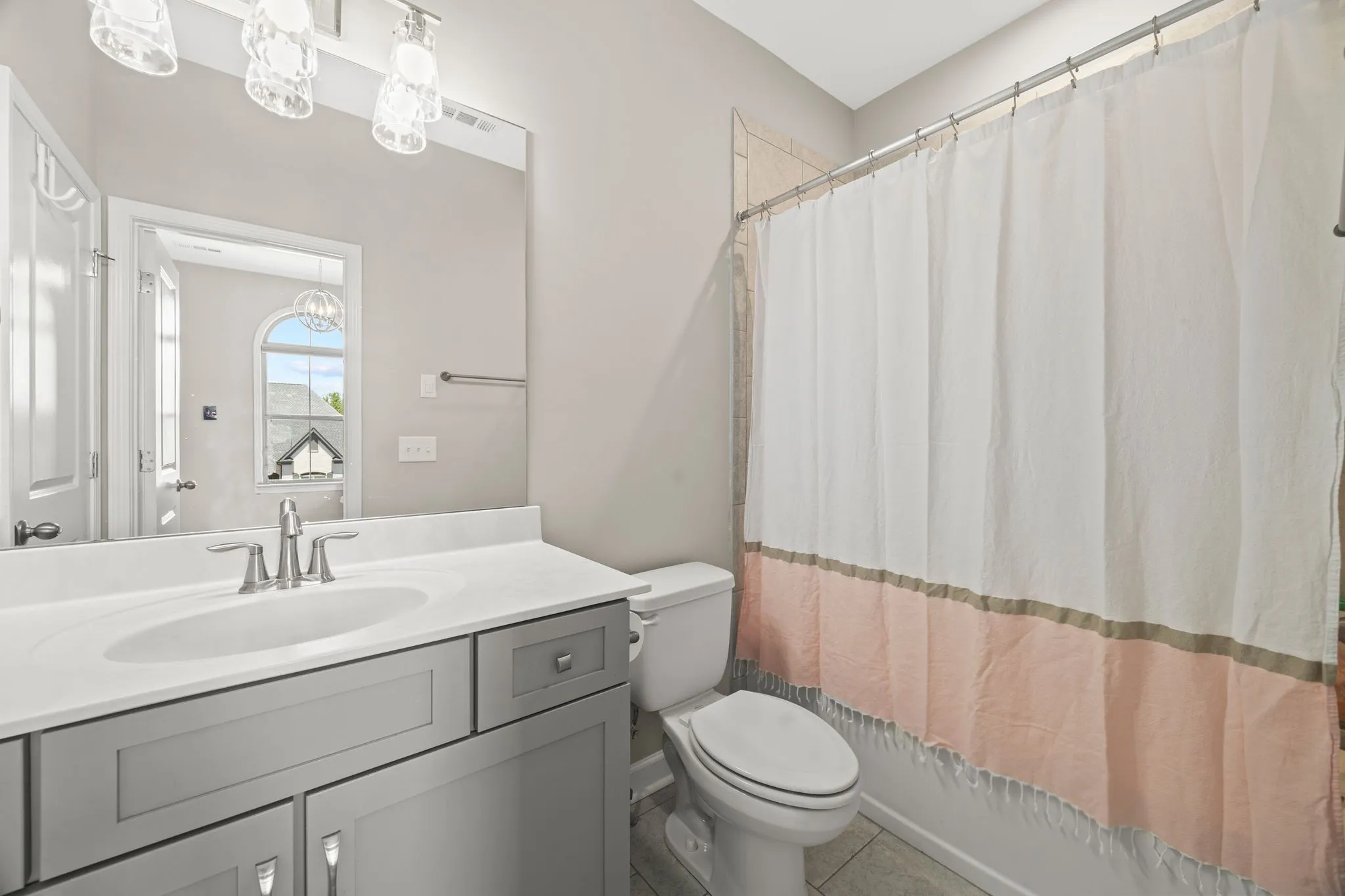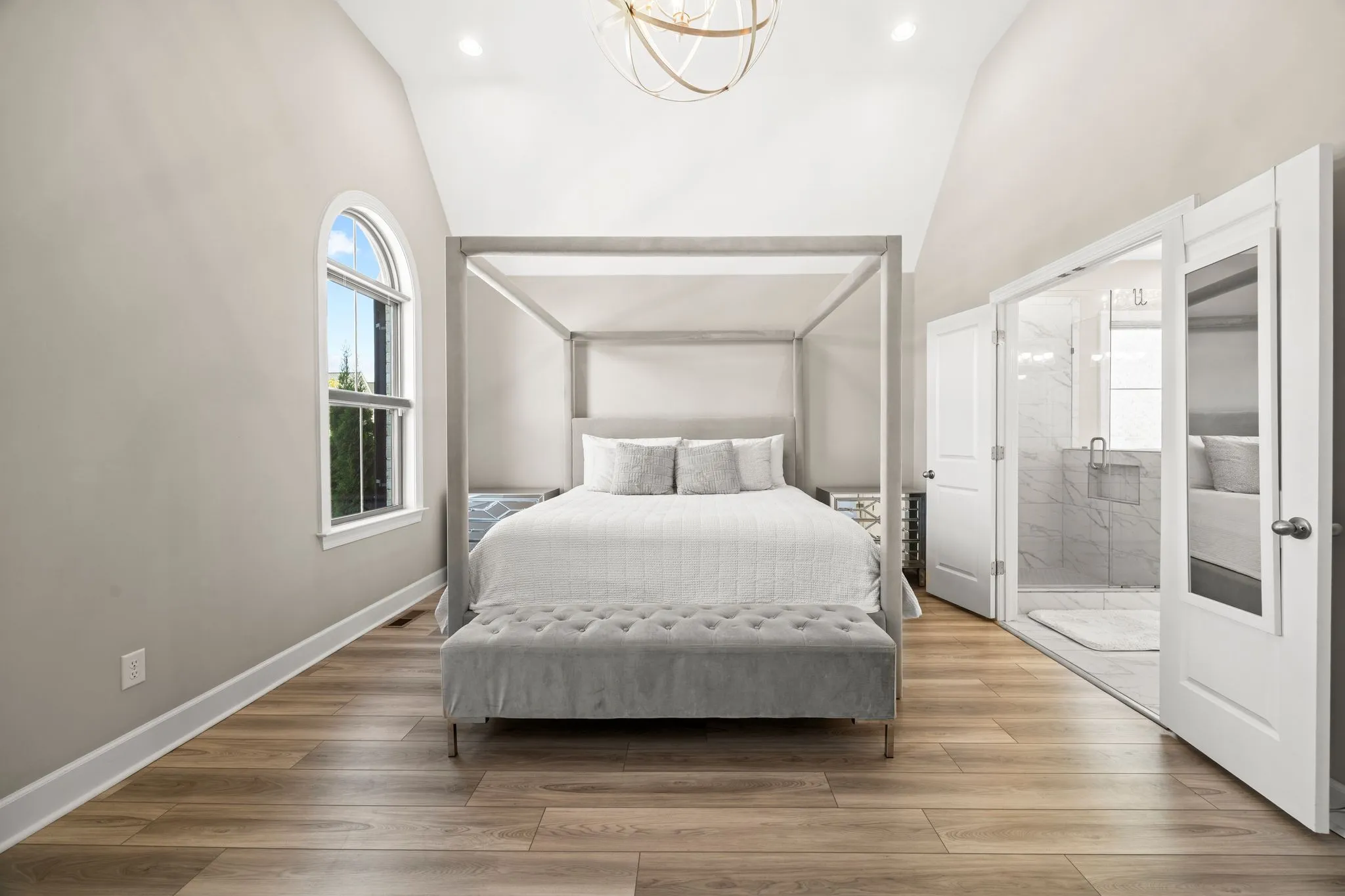 The main-level primary suite is a true retreat, showcasing a spa-inspired bath with frameless glass shower, freestanding soaking tub, dual quartz vanities, a generous walk-in closet, and its own elegant chandelier for a touch of serenity. Upstairs, three inviting bedrooms and a versatile bonus room provide endless possibilities for guests, family, or a media space.