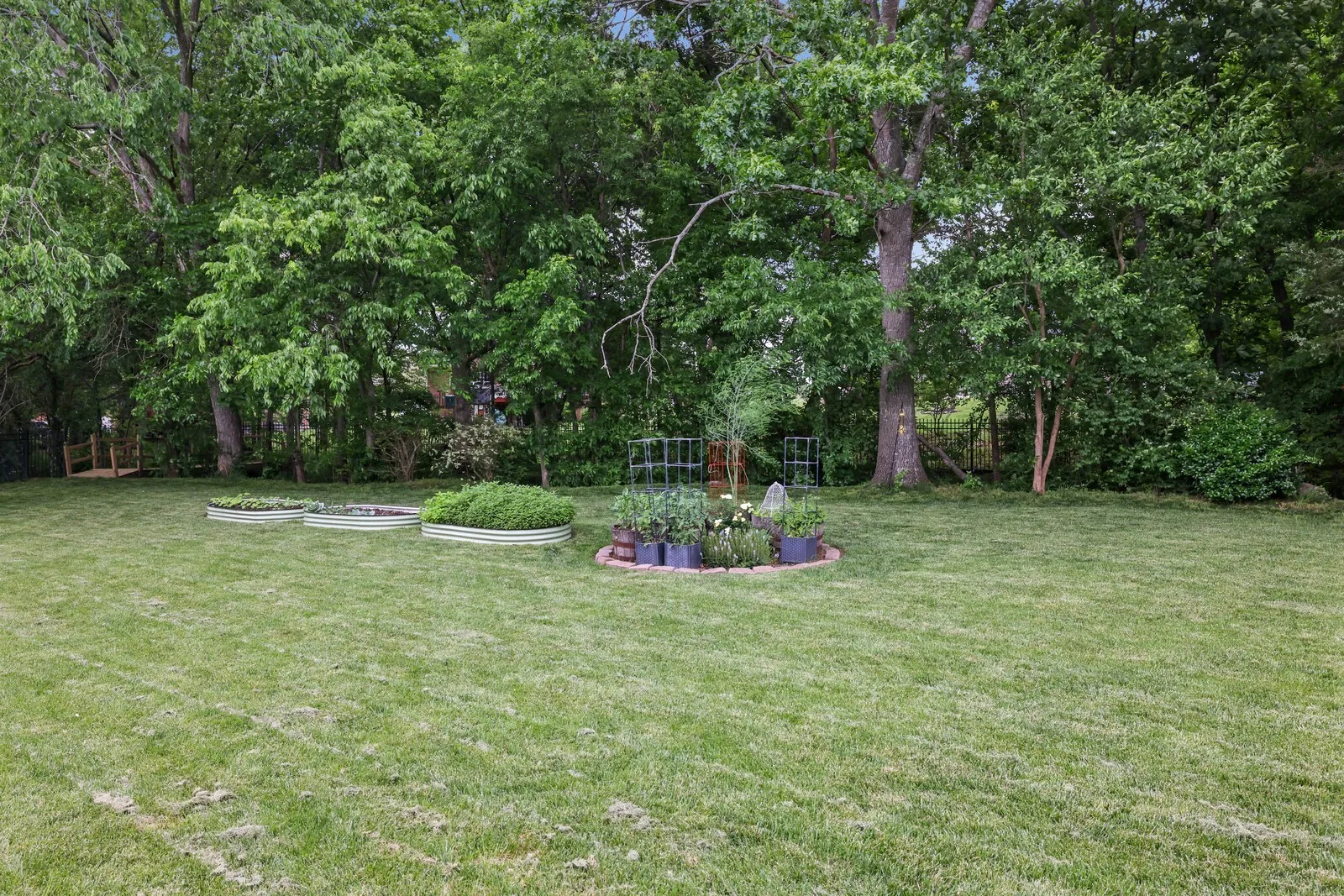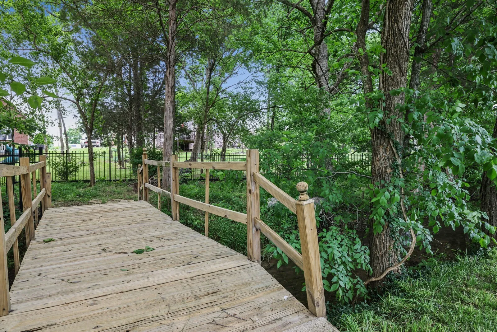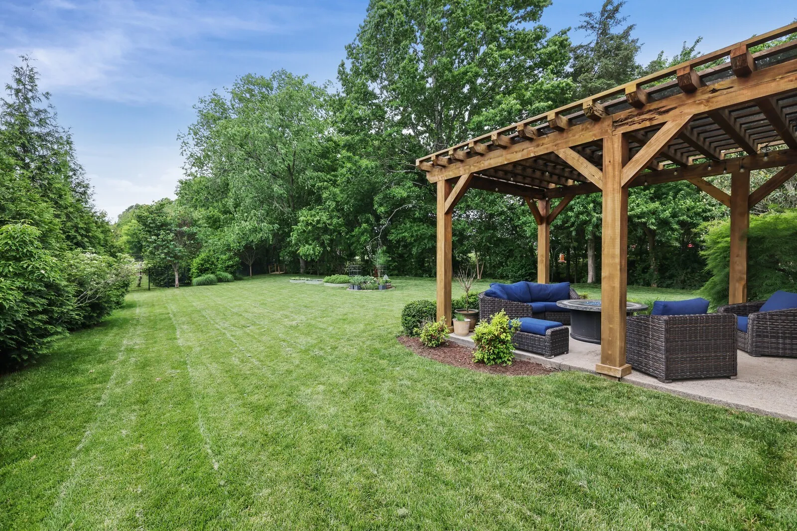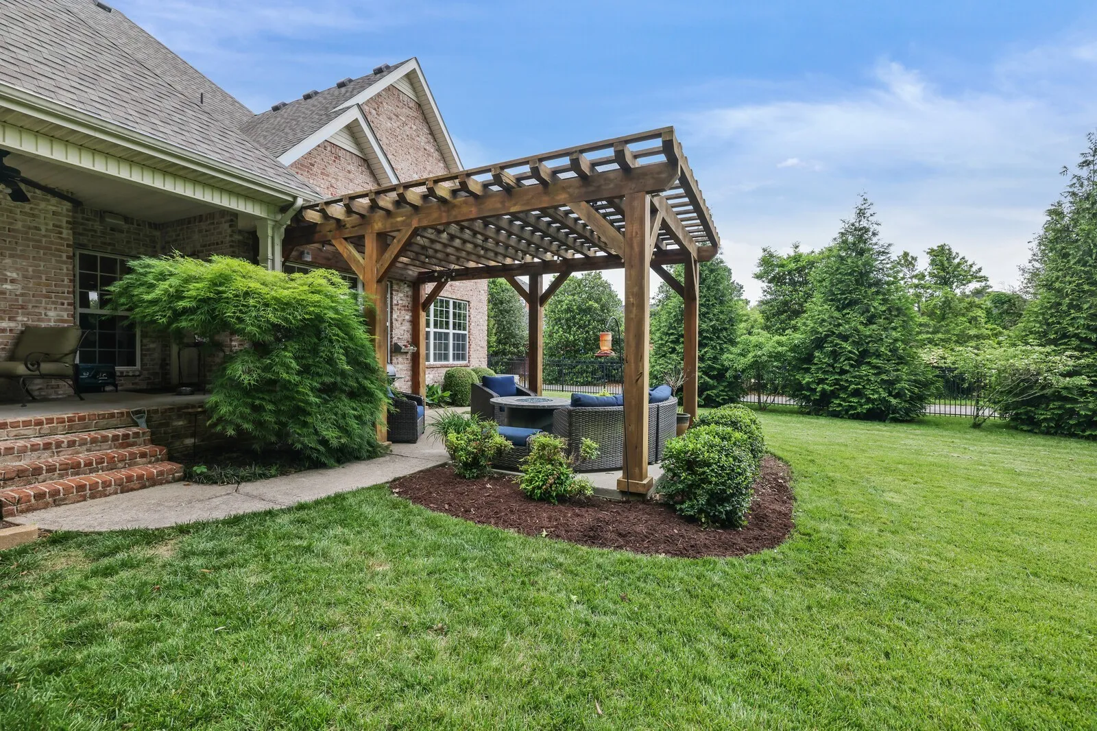 Step outside to your private backyard oasis, perfect for entertaining or relaxing. Highlights include a cozy fire pit, a pergola with remote-controlled lighting, a built-in grill, and a picturesque bridge crossing a peaceful creek. Mature Green Giant trees line the fenced yard, offering privacy and beauty. The lush garden is supported by a programmable sprinkler system.