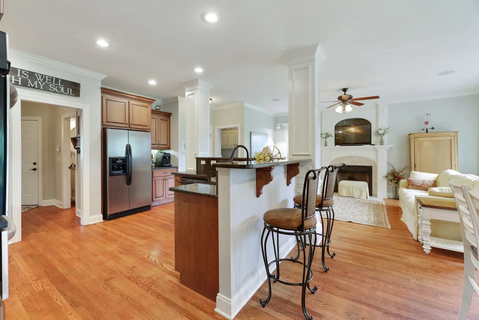 Inside, enjoy the warmth of two fireplaces and a whole-home speaker system with individual volume control in every room—including the back porch. Recent upgrades include a new roof, HVAC, and water heater (all within the past two years). The kitchen comes fully equipped with appliances, including the refrigerator, washer, and dryer, all of which convey with the home.