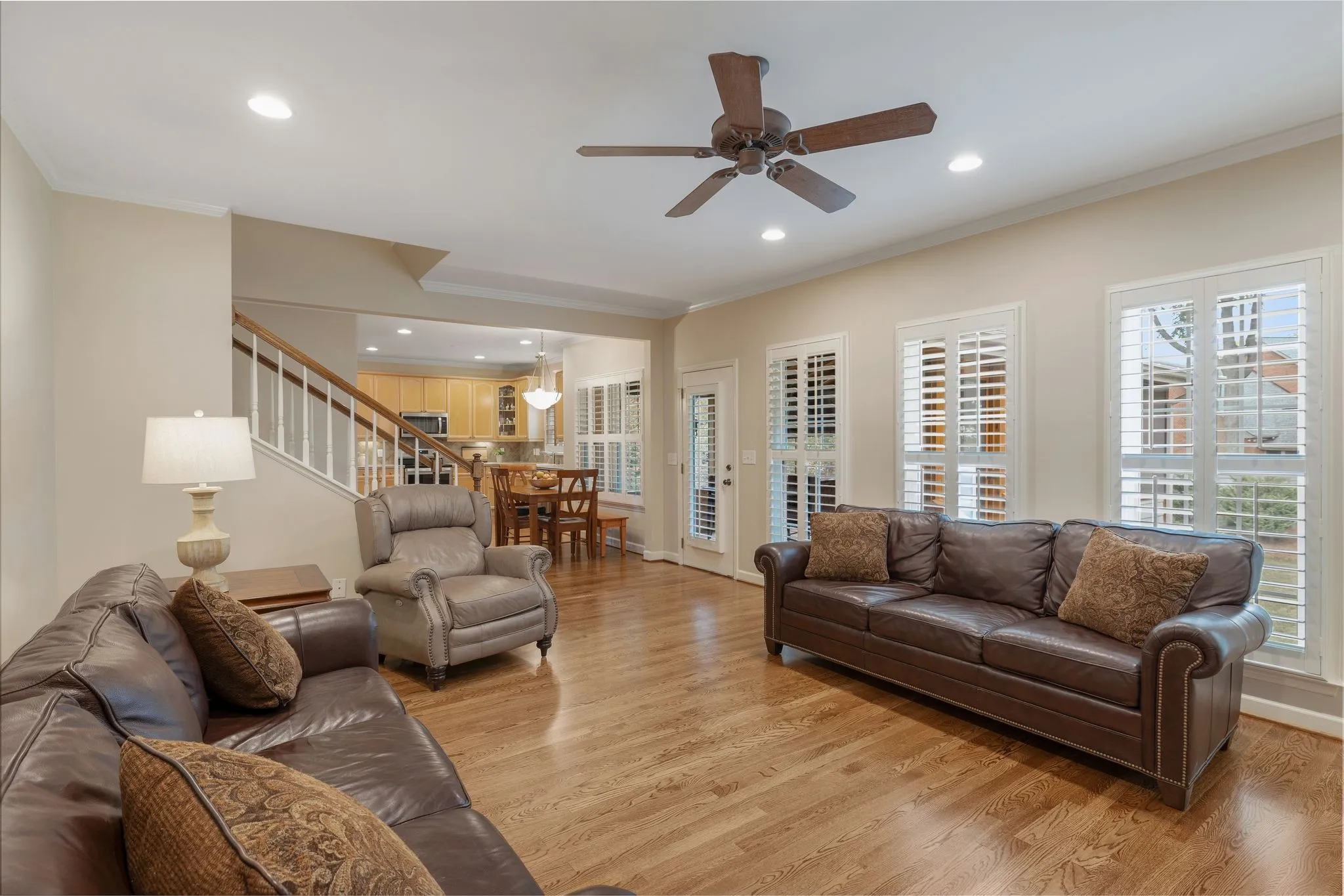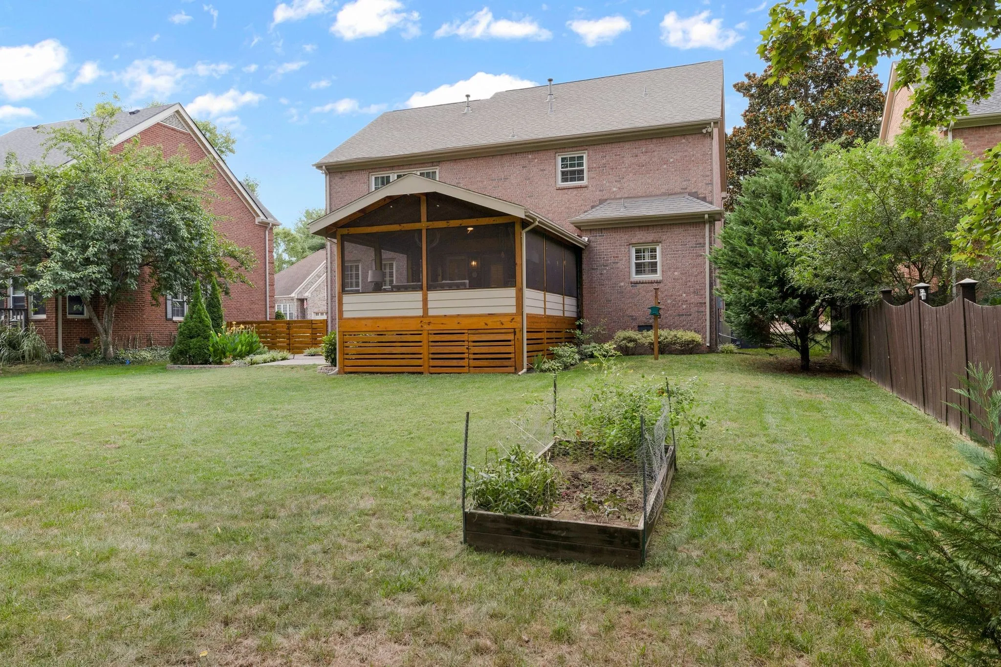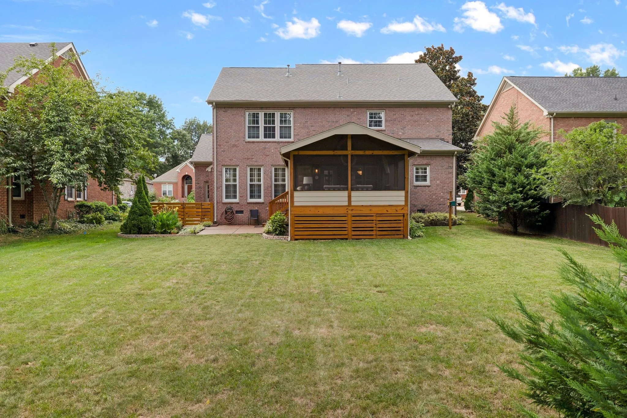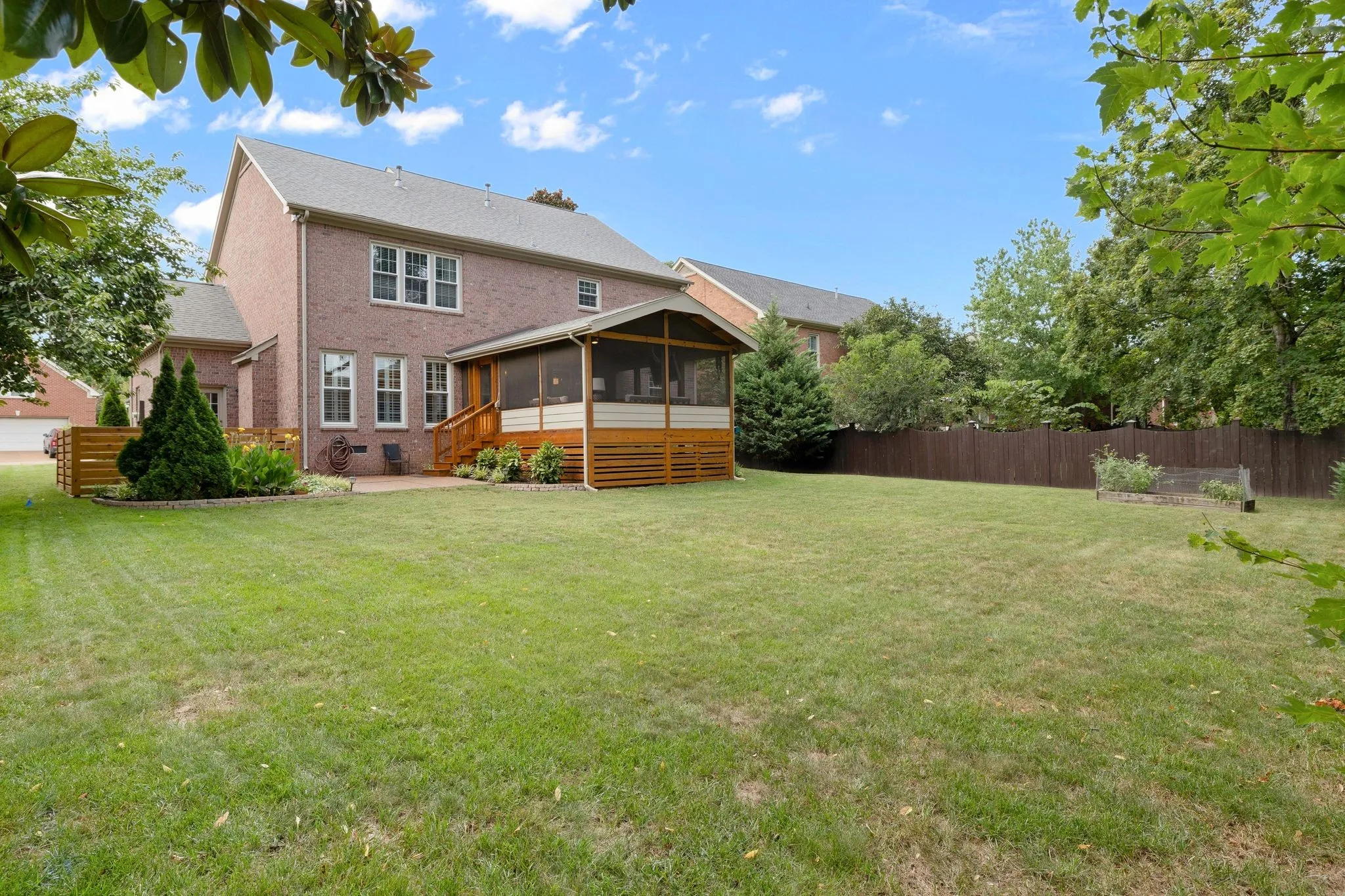 Nestled in one of Franklin’s most walkable neighborhoods, this beautifully maintained custom home offers both charm and convenience. Surrounded by lush, professionally landscaped grounds with full irrigation, the home features newly refinished hardwood floors throughout the main level. The spacious kitchen with an eat-in nook seamlessly opens to a large living room centered around a cozy fireplace. New plantation shutters throughout add a touch of elegance. The oversized primary suite is among the largest in Polk Place, complemented by a recently renovated en-suite bathroom and walk-in closet. Generously sized secondary bedrooms provide ample space for family or guests. Step out onto the expansive, screened-in back deck—perfect for entertaining or enjoying football games on crisp fall evenings.