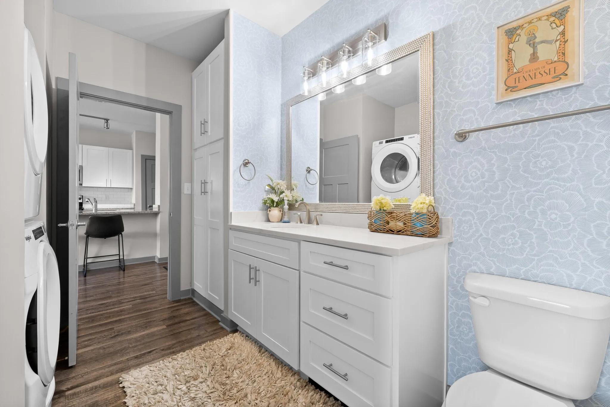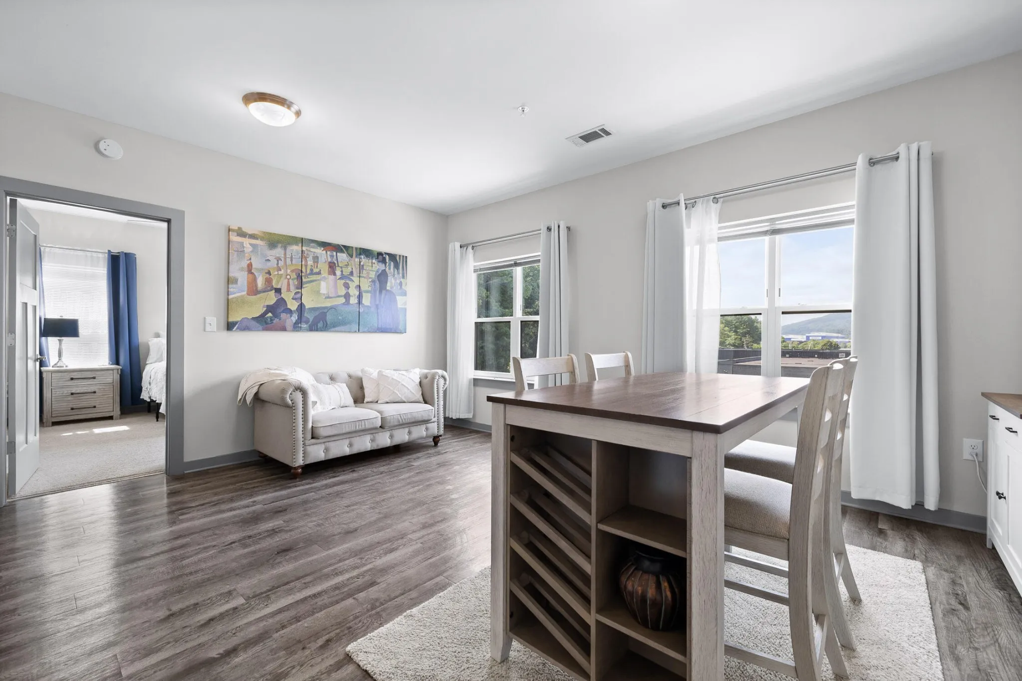 Inside, you’ll find a light-filled, open-concept layout with warm wood floors, a modern color palette, and a thoughtfully designed kitchen featuring stainless steel appliances, subway tile backsplash, a center island with seating, and generous dining space. The spacious bedroom includes a walk-in closet with built-ins and a stackable washer/dryer, while the bathroom offers clean finishes and ample storage.