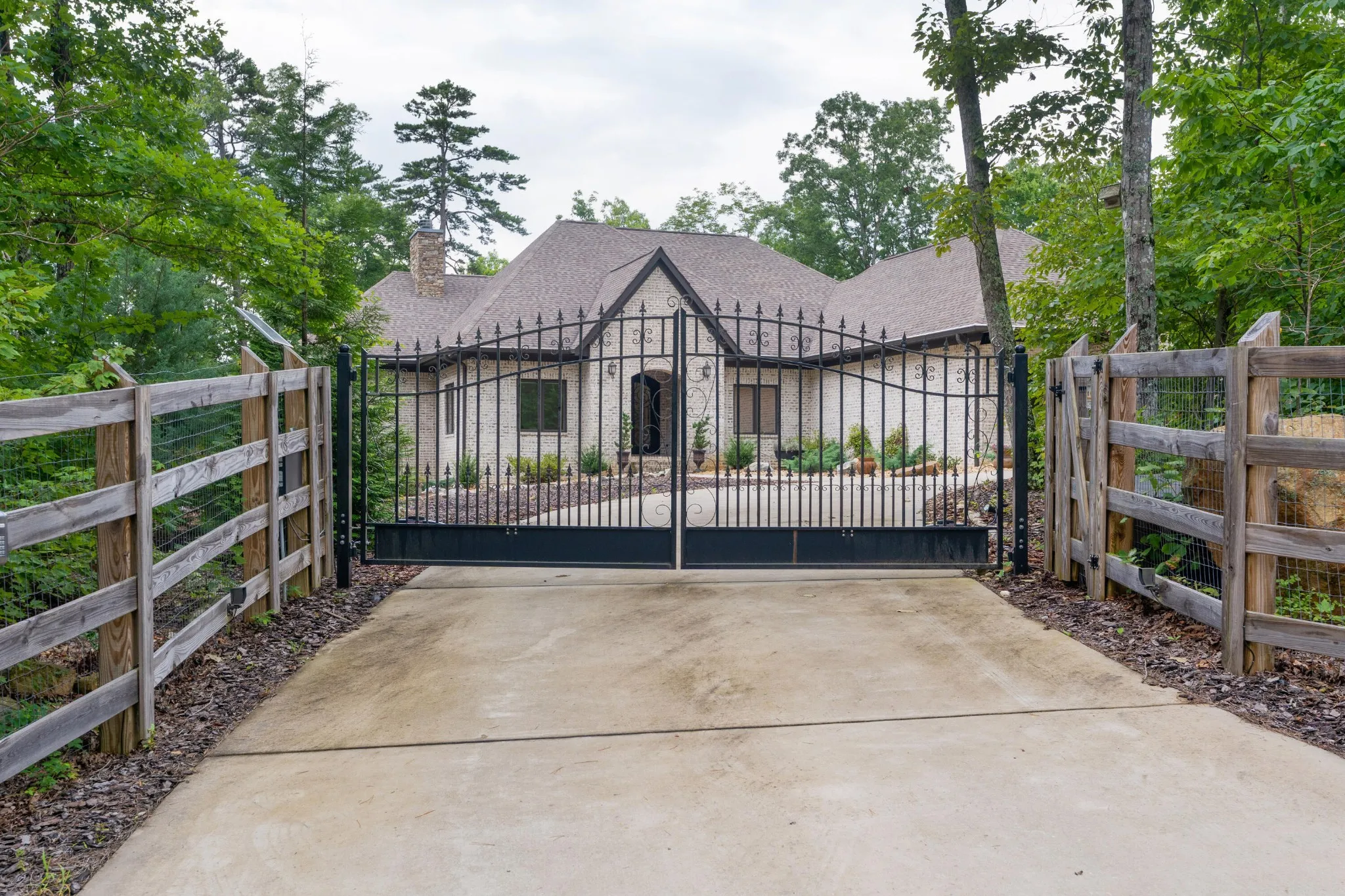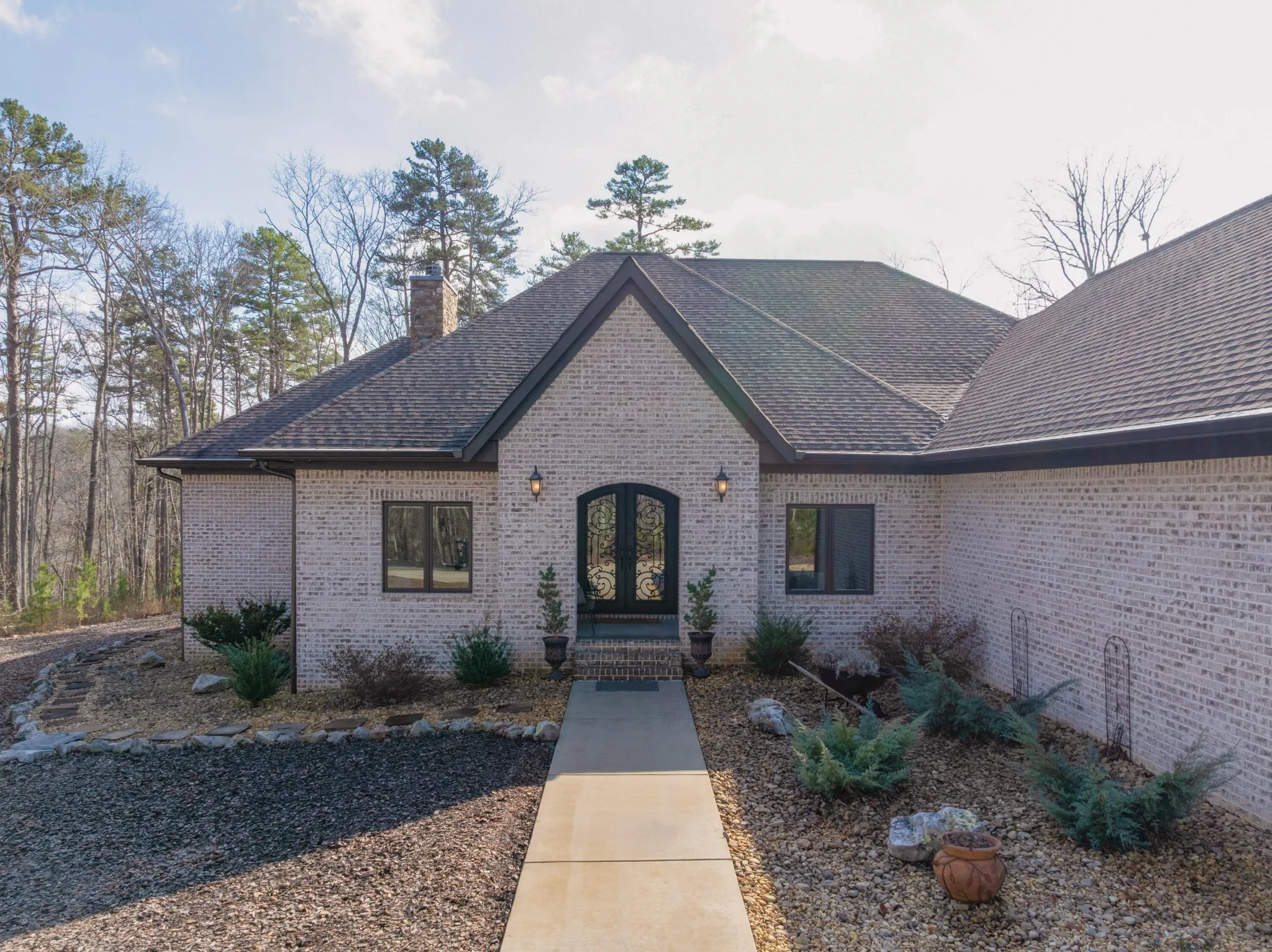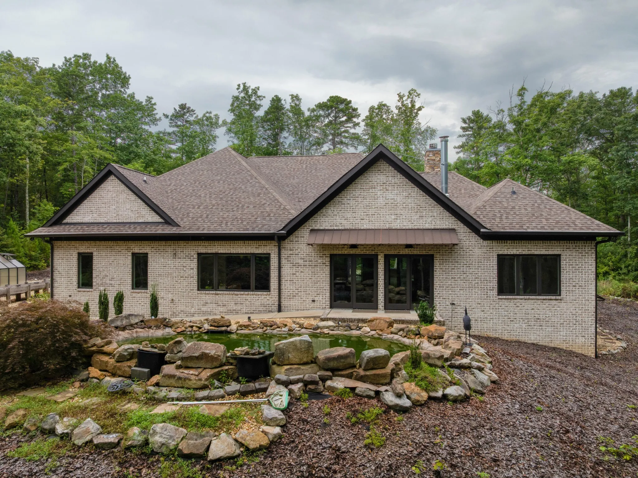 All brick home with a coveted private setting including a gated entry and an extra lot in the desirable Grandview neighborhood on Signal Mountain. This one-level 3 bedroom, 2.5 bath home with a 3-bay garage was built in 2019 and boasts premium finishes and a fantastic floor plan for both entertaining and everyday living and is positioned on a 5.11+/- acre lot. The second lot is wooded and provides an additional 5.44 +/- acres for a total of 10.55 +/- acres. Soil testing has just been completed – build a second house, keep it natural for the privacy or add additional green space for kids or pets – you choose! This custom home offers so many desirable features, including tall ceilings, hardwoods and crown molding throughout, recessed and decorative lighting, clad windows with retractable screens, granite countertops, custom cabinetry, convenient closet systems, central vacuum, whole house water filtration system, a generator, and wonderful outdoor features such as a Koi pond with waterfalls, a wonderful spot for your firepit and outdoor seating area, a green house, a chicken house/coop and professional landscaping. Your tour begins with entry to the foyer via beautiful metal and glass front doors. The foyer opens to a spacious great room with a stone, wood burning fireplace with a gas starter and built-ins on either side. The formal dining room is just down the hall, and it has access to the office which can be closed off via pocket doors. Sliding interior doors lead to a rear family room with a vaulted ceiling, brick walls and a woodburning stove. This room overlooks the water feature and is also accessible from the breakfast room. The breakfast room is light-filled and opens to the gourmet kitchen with an oversized center island, granite countertops and backsplash, soft close and pull-out drawers, drawers, under-cabinet lighting, gas cooktop and convection double wall ovens, a pantry and a built-in beverage center.