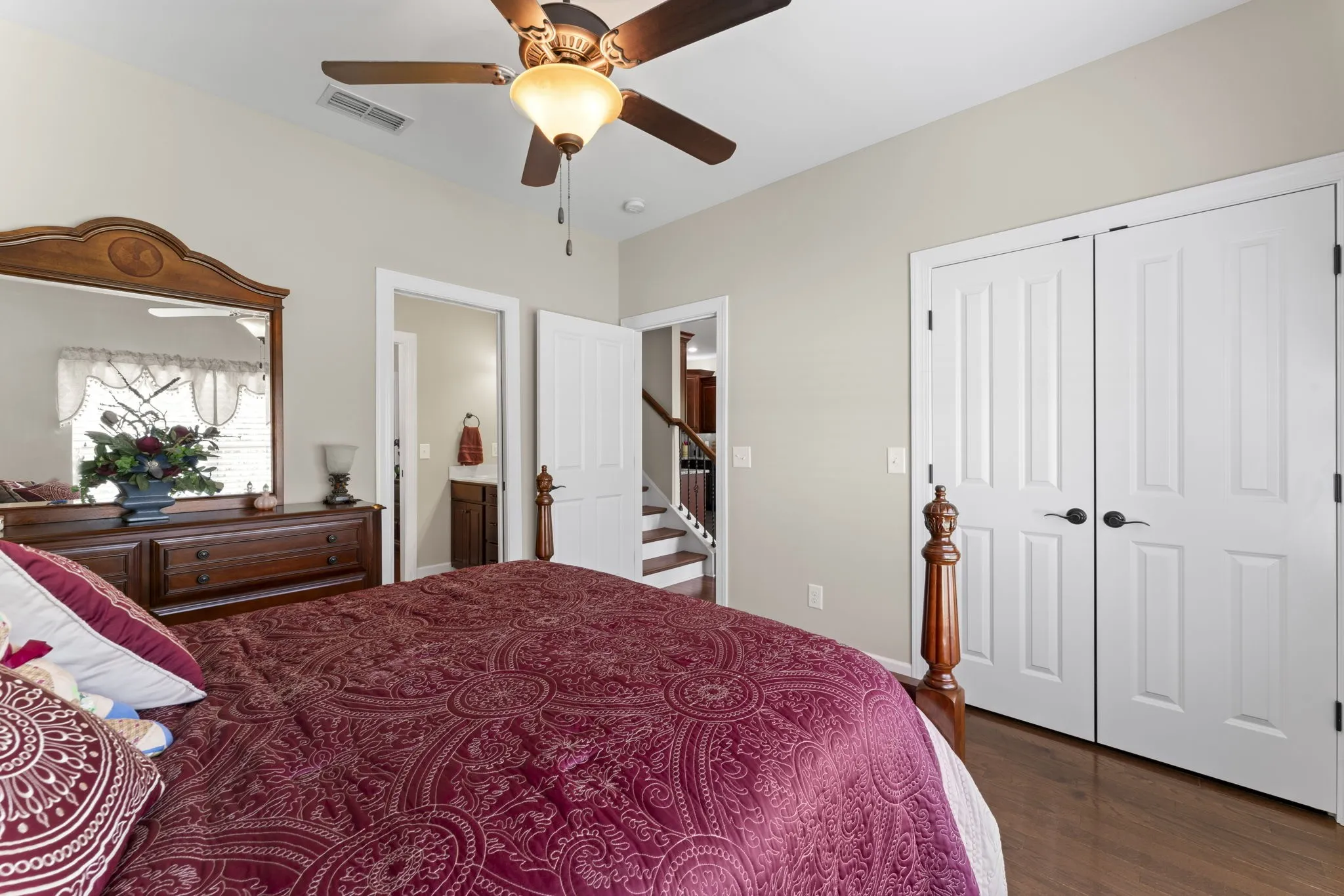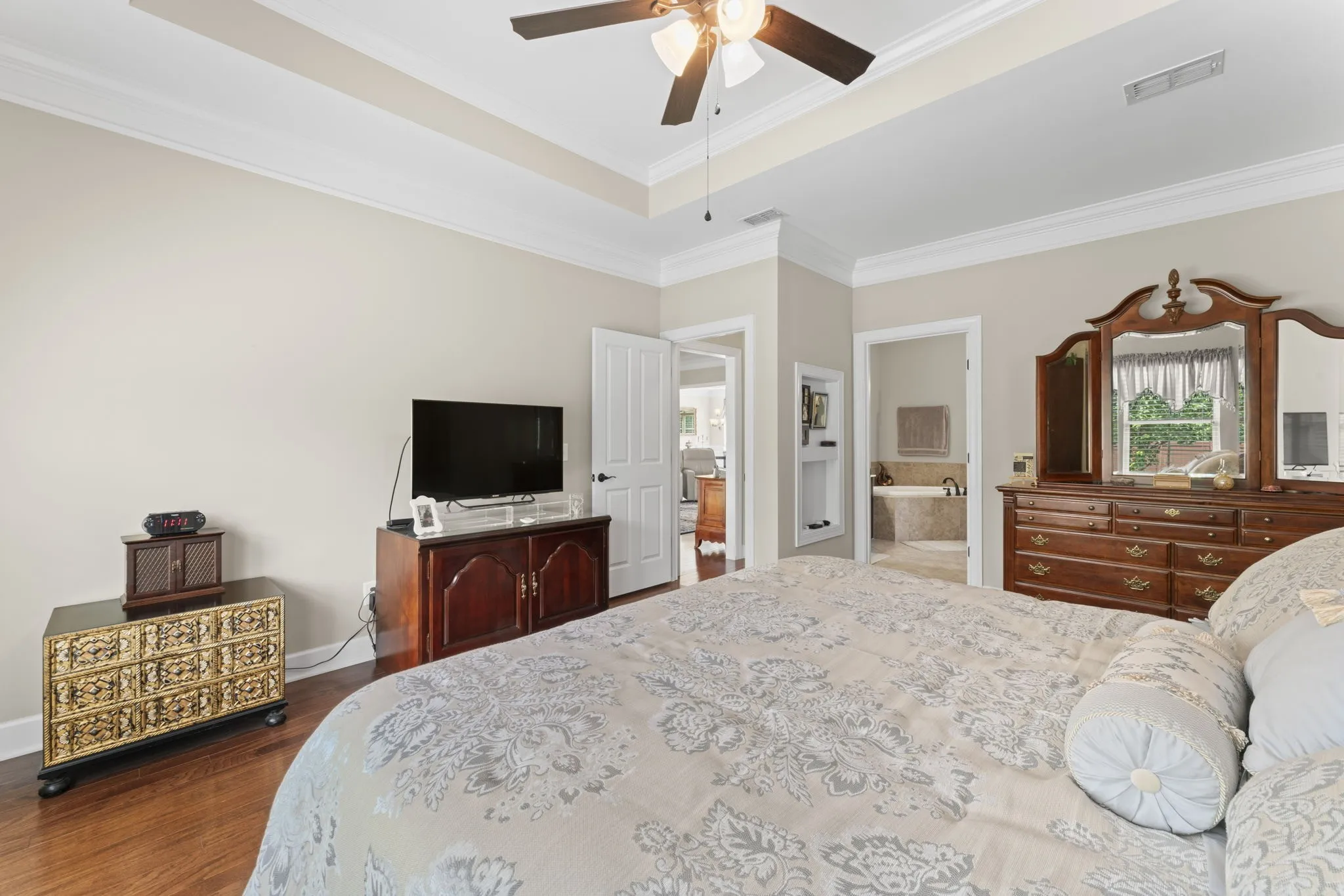 The primary suite boasts a luxurious en-suite bath with a huge soaking tub, an oversized walk-in closet, and plenty of natural light. Secondary bedrooms feature walk-in closets and an extra-large closet for added storage.