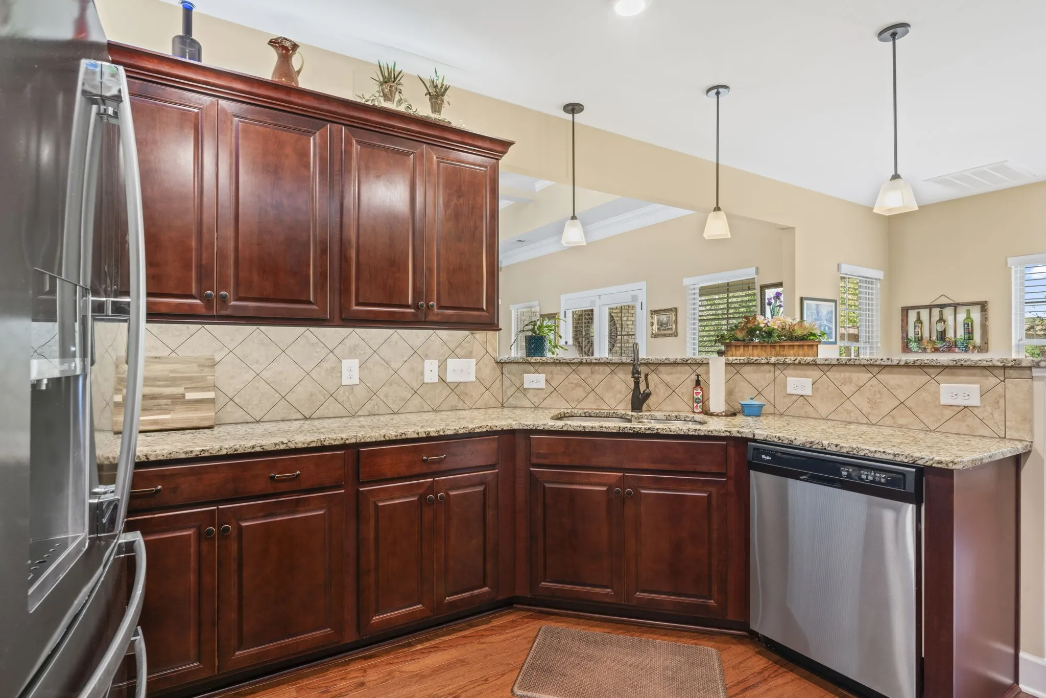 The spacious kitchen is updated with granite countertops, stylish cabinetry, and features both up and down lighting for ambiance. A breakfast nook overlooks the backyard, and the large living room includes a cozy natural gas fireplace and is wired for surround sound—along with the master suite and bonus room.