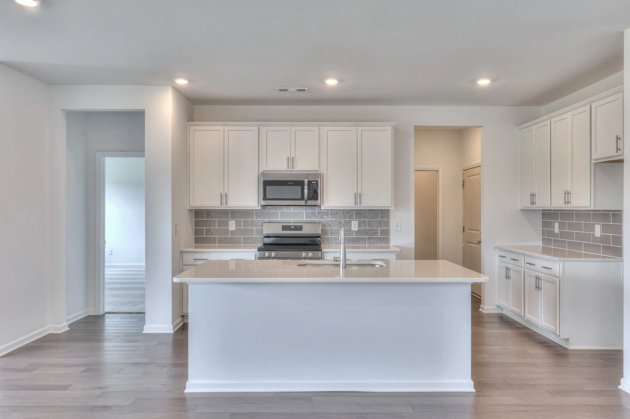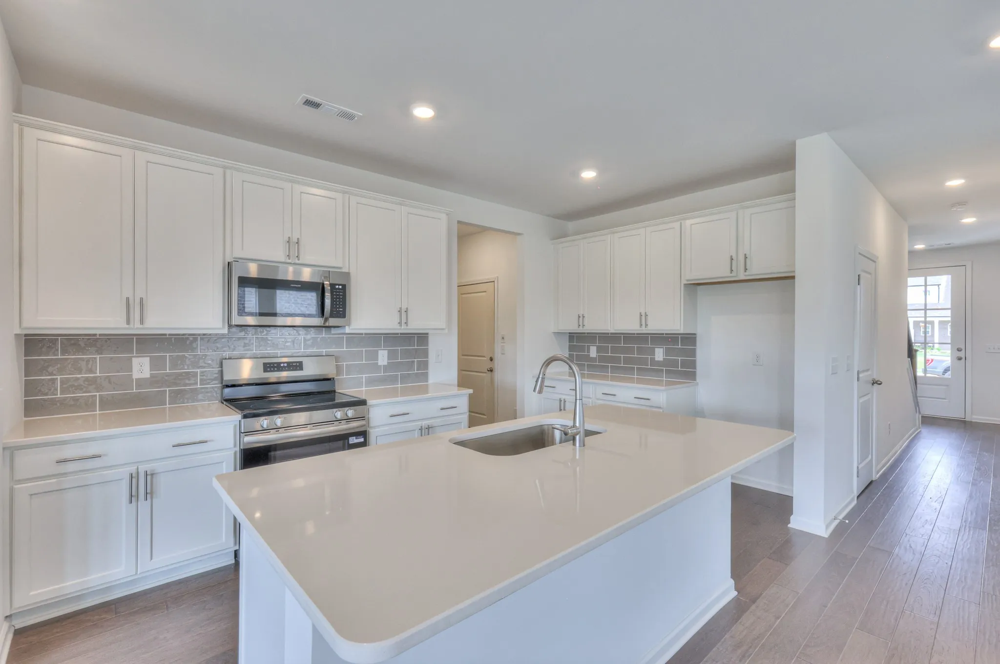 A bright kitchen with upgraded cabinets, countertops, and tile backsplash